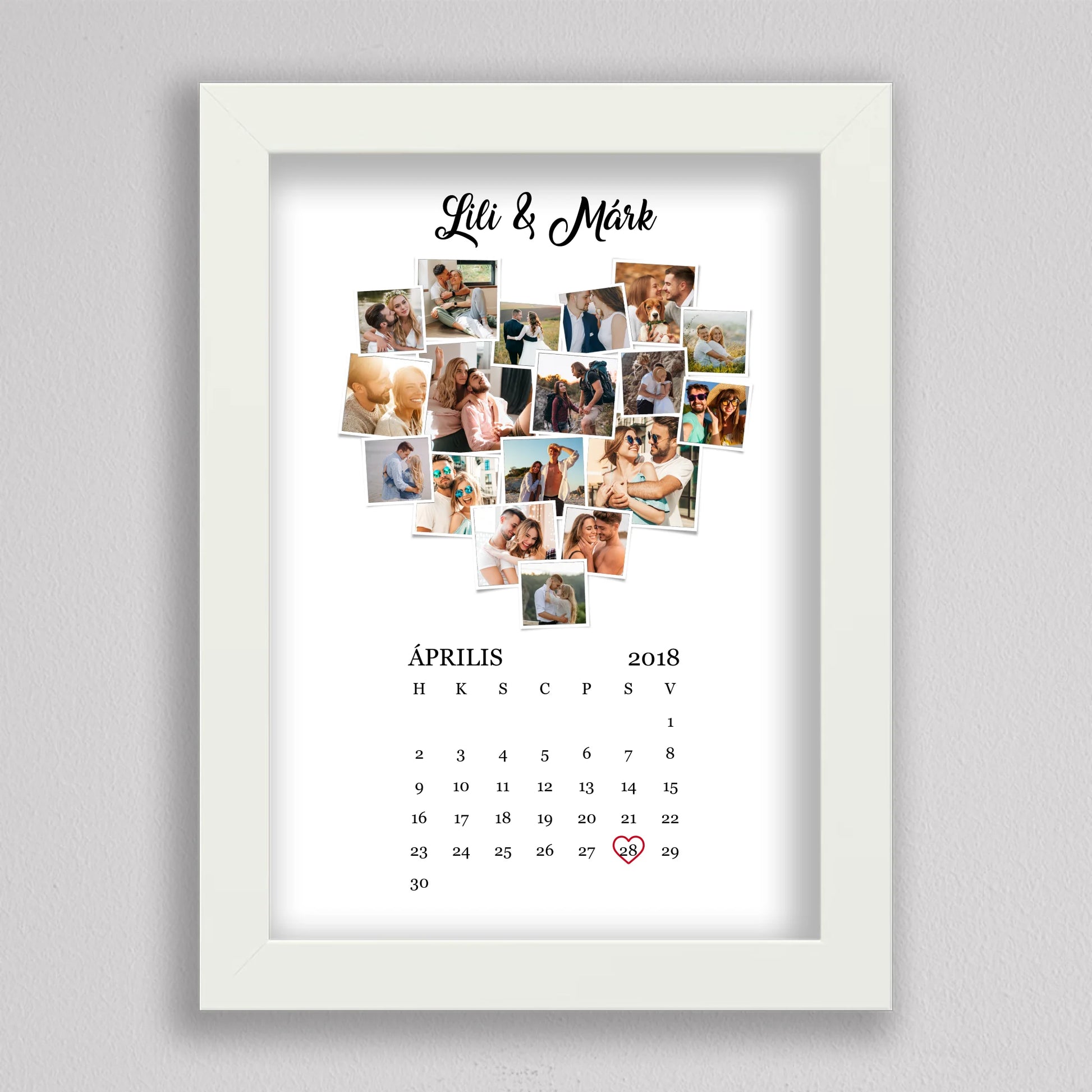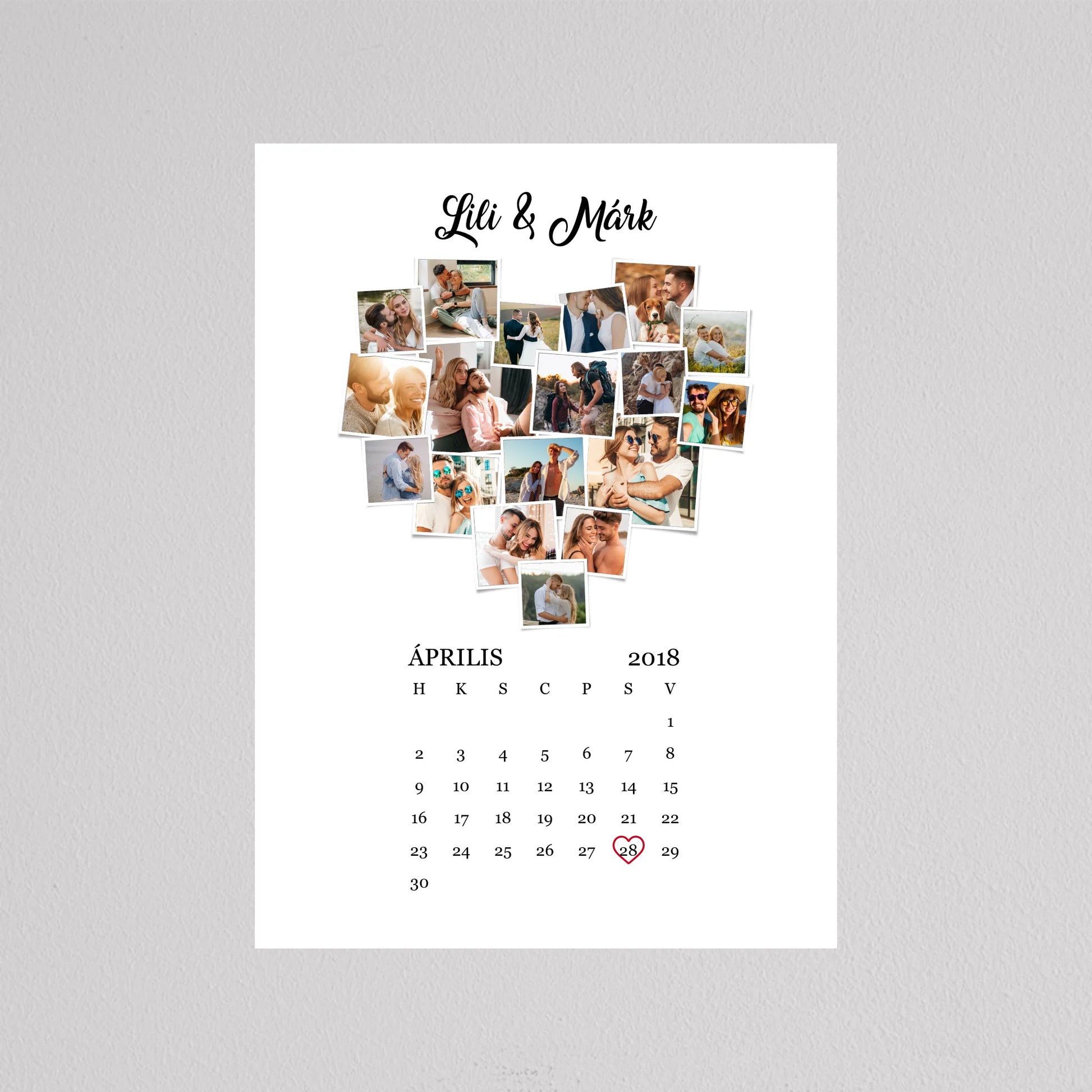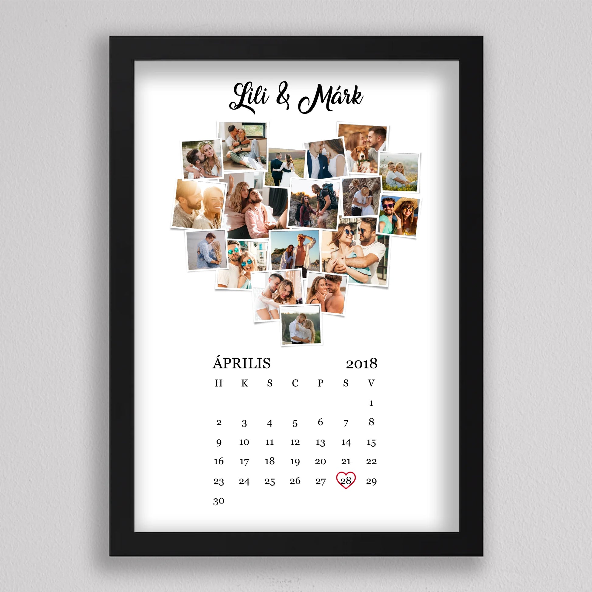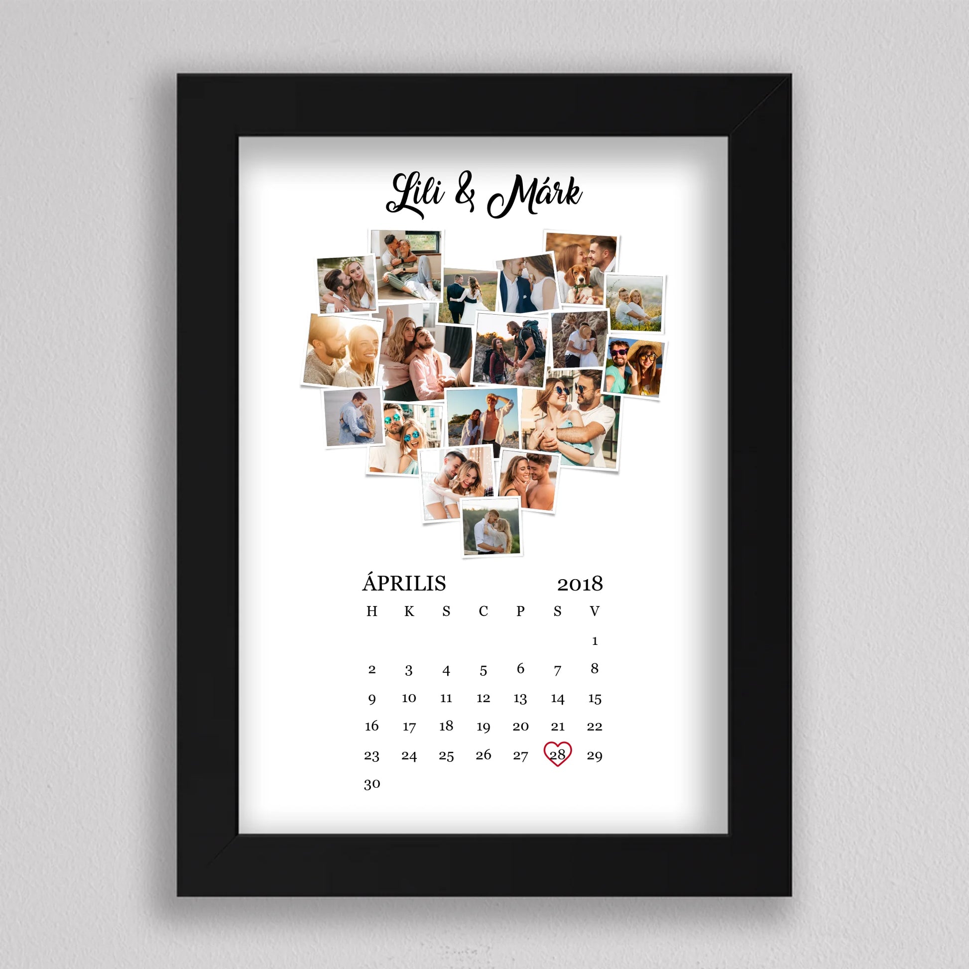 A Szerelmes emlékek naptárral – Polaroid stílusban egy különleges, szív alakú fotókollázs, amelyben életetek legmeghatóbb pillanatai elevenednek meg. A vintage hatású polaroid képek játékos, mégis elegáns megjelenést kölcsönöznek a poszternek, amelyet nevetekkel és egy fontos dátummal – például évfordulótokkal – személyre szabva készítünk el. A letisztult naptárrészlet egy szívecskével jelöli meg azt a napot, ami örökre összeköt benneteket. Tökéletes ajándék lehet szerelmeseknek évfordulóra, Valentin-napra vagy esküvői meglepetésként. Dekoratív, időtálló és érzelmileg gazdag alkotás, ami bármely otthon dísze lehet.