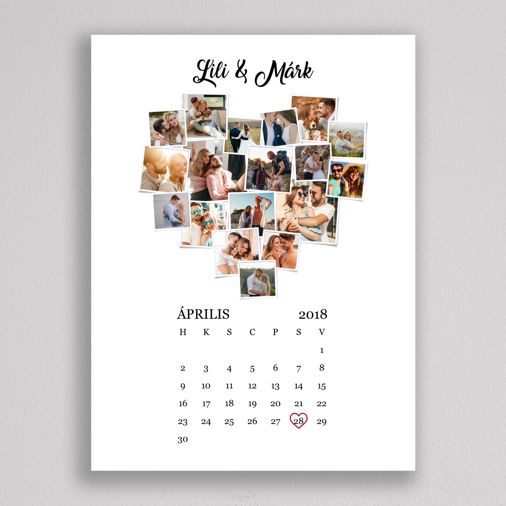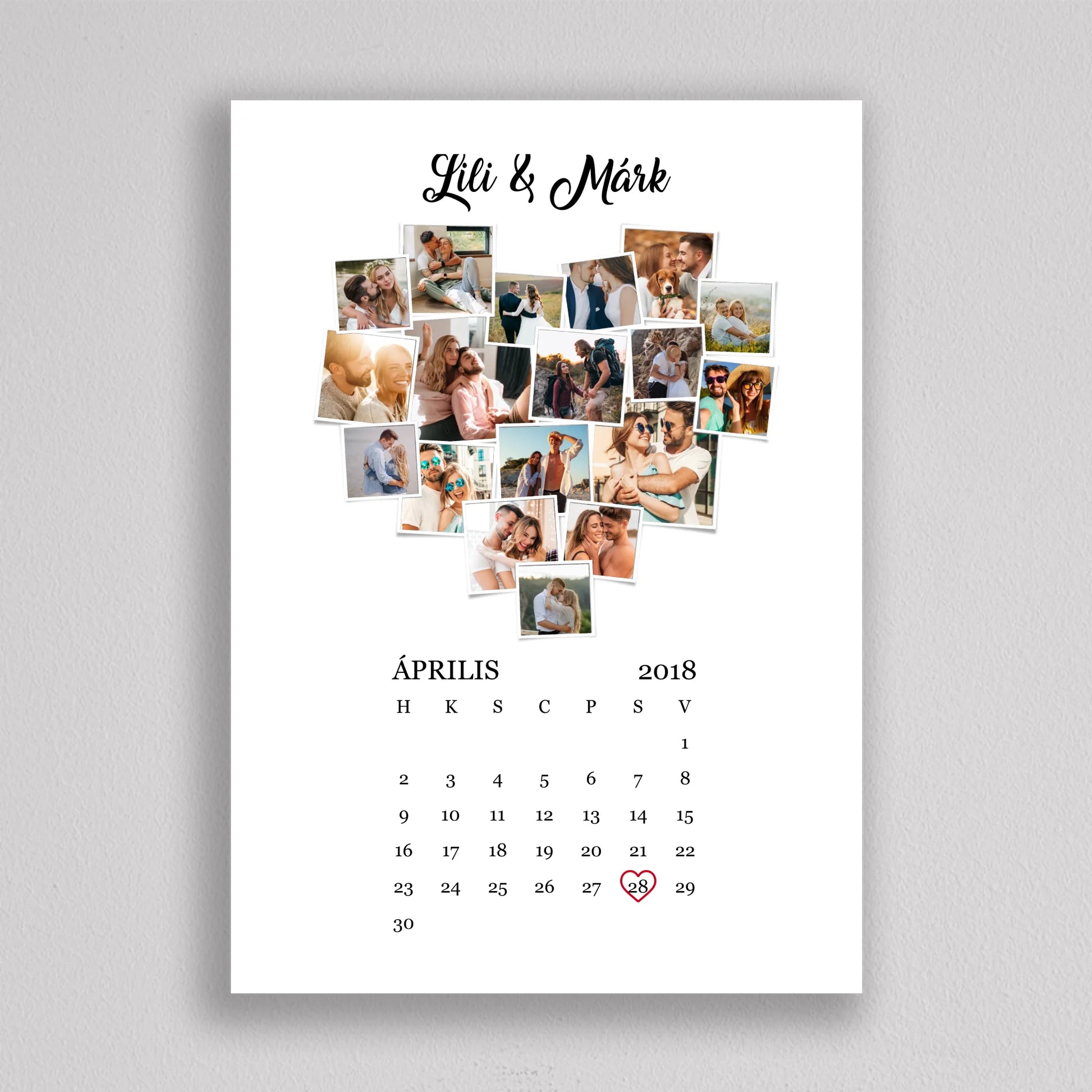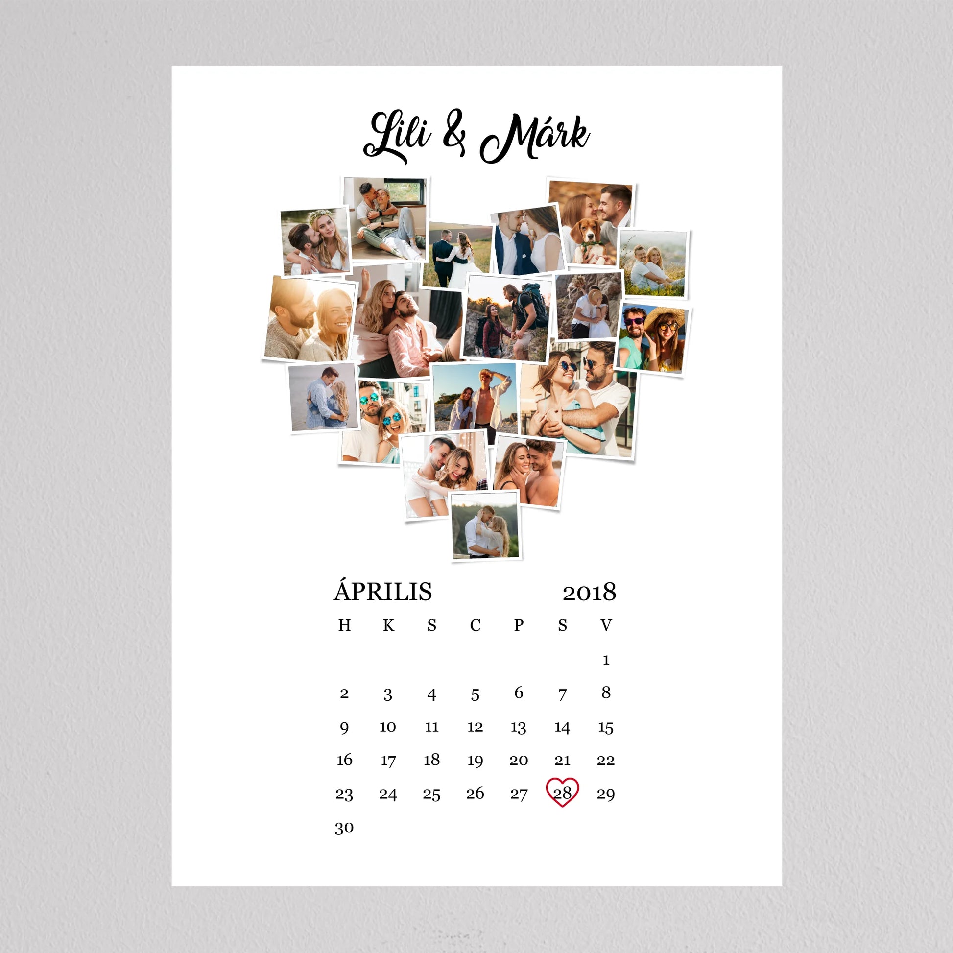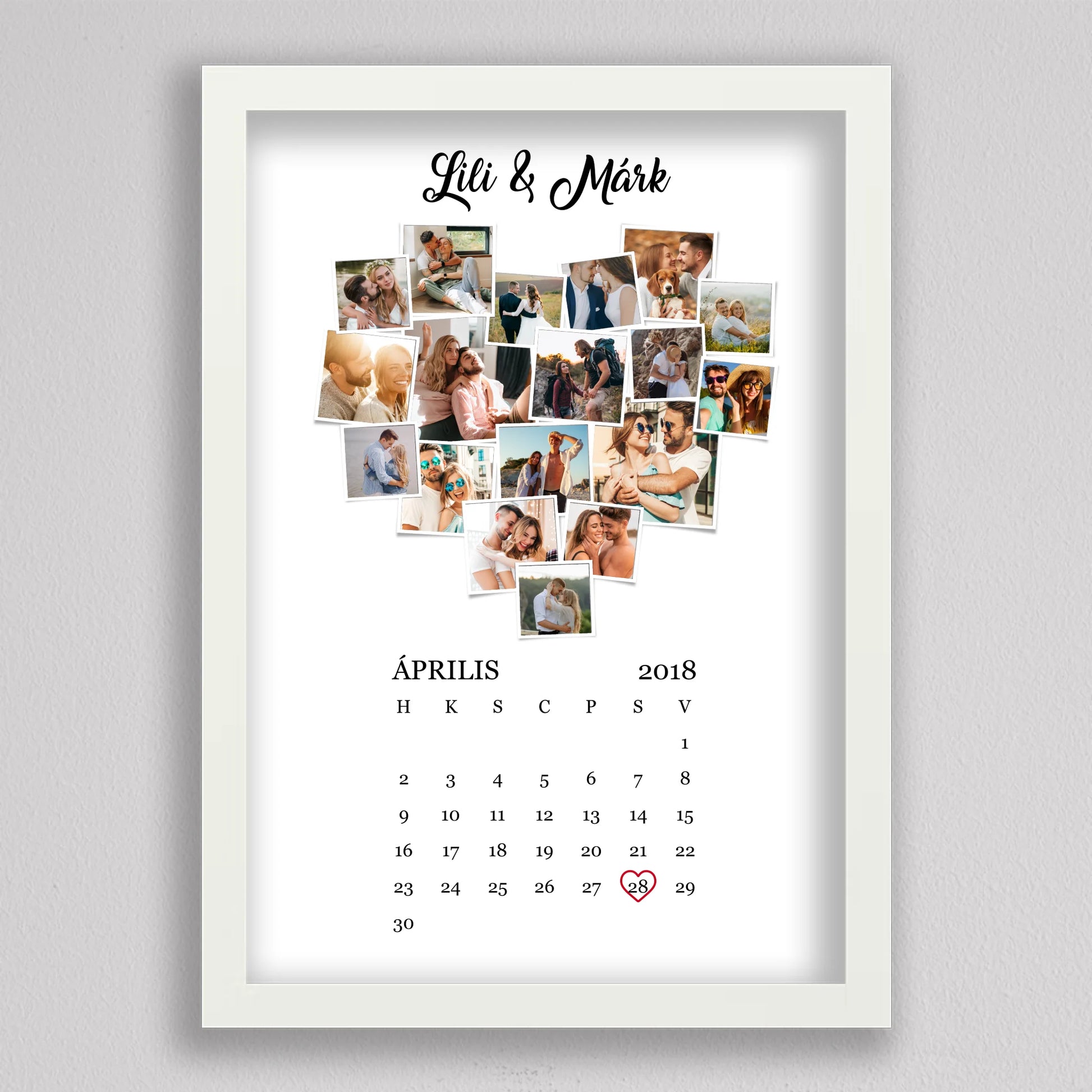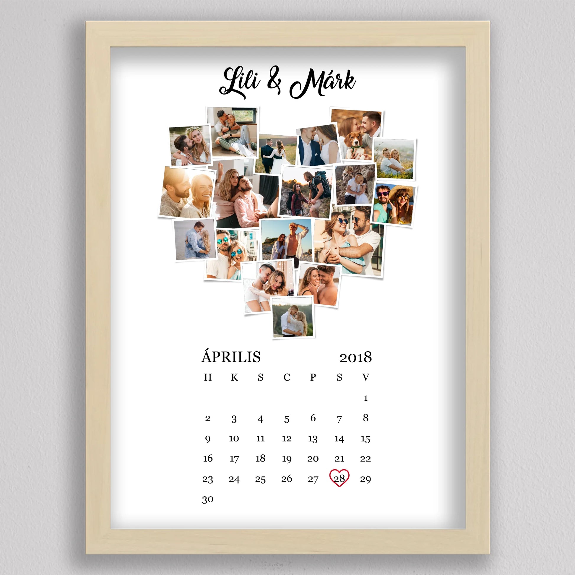 A Szerelmes emlékek naptárral – Polaroid stílusban egy különleges, szív alakú fotókollázs, amelyben életetek legmeghatóbb pillanatai elevenednek meg. A vintage hatású polaroid képek játékos, mégis elegáns megjelenést kölcsönöznek a poszternek, amelyet nevetekkel és egy fontos dátummal – például évfordulótokkal – személyre szabva készítünk el. A letisztult naptárrészlet egy szívecskével jelöli meg azt a napot, ami örökre összeköt benneteket. Tökéletes ajándék lehet szerelmeseknek évfordulóra, Valentin-napra vagy esküvői meglepetésként. Dekoratív, időtálló és érzelmileg gazdag alkotás, ami bármely otthon dísze lehet.