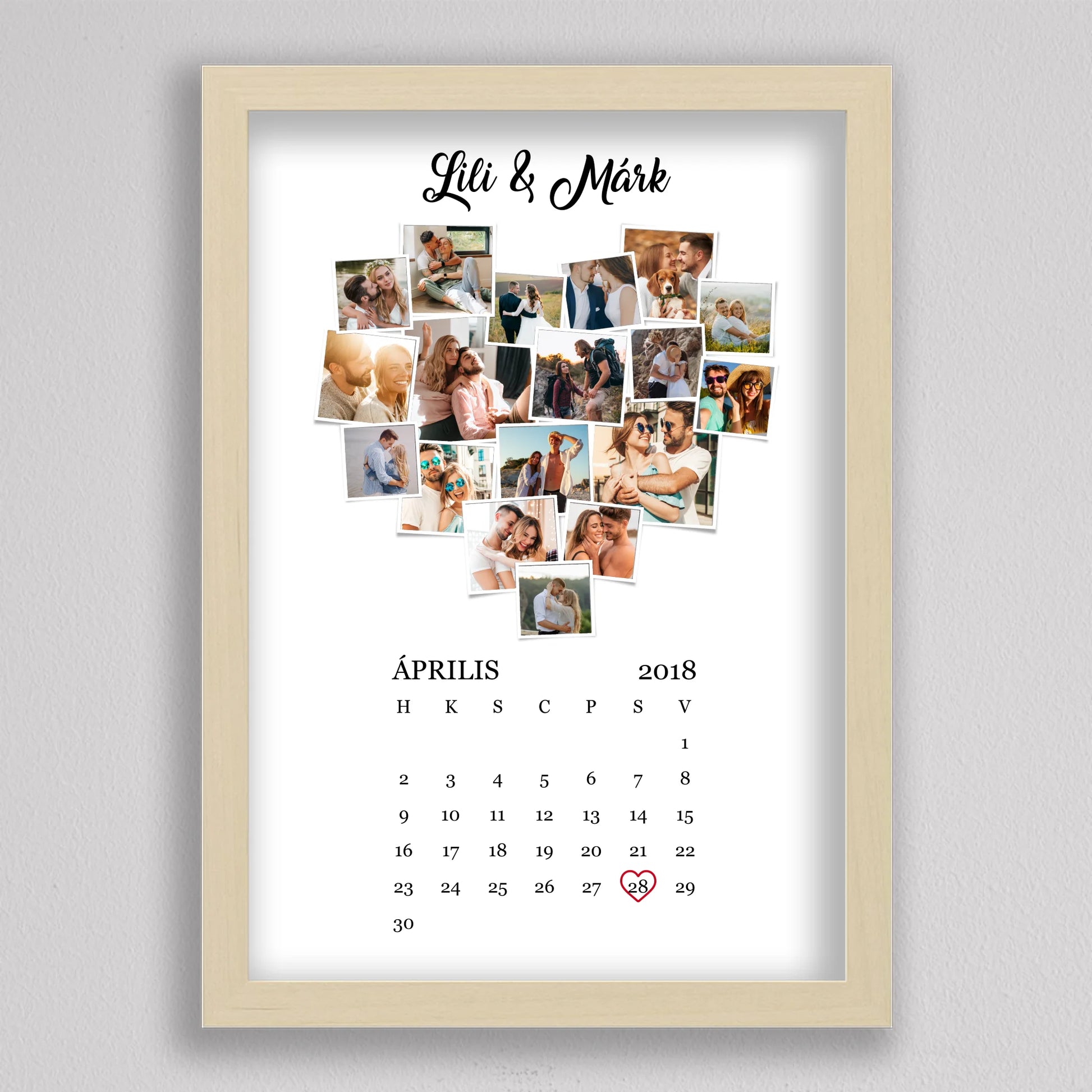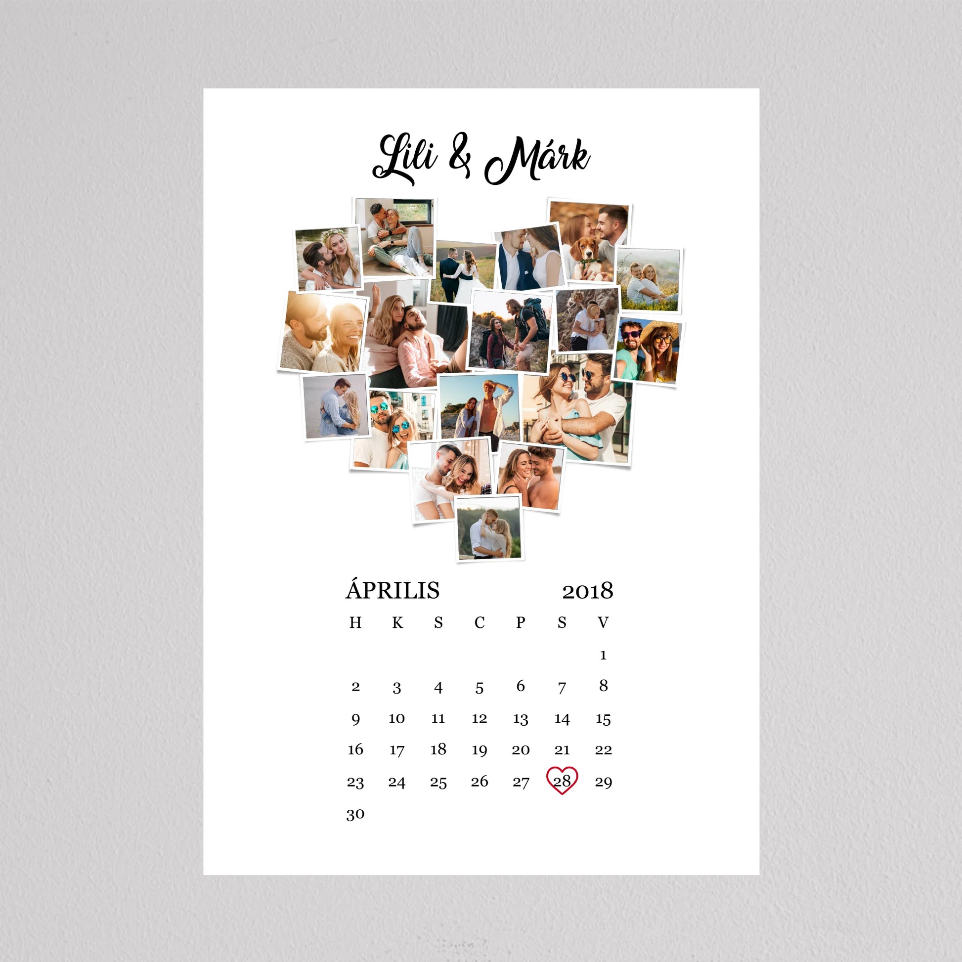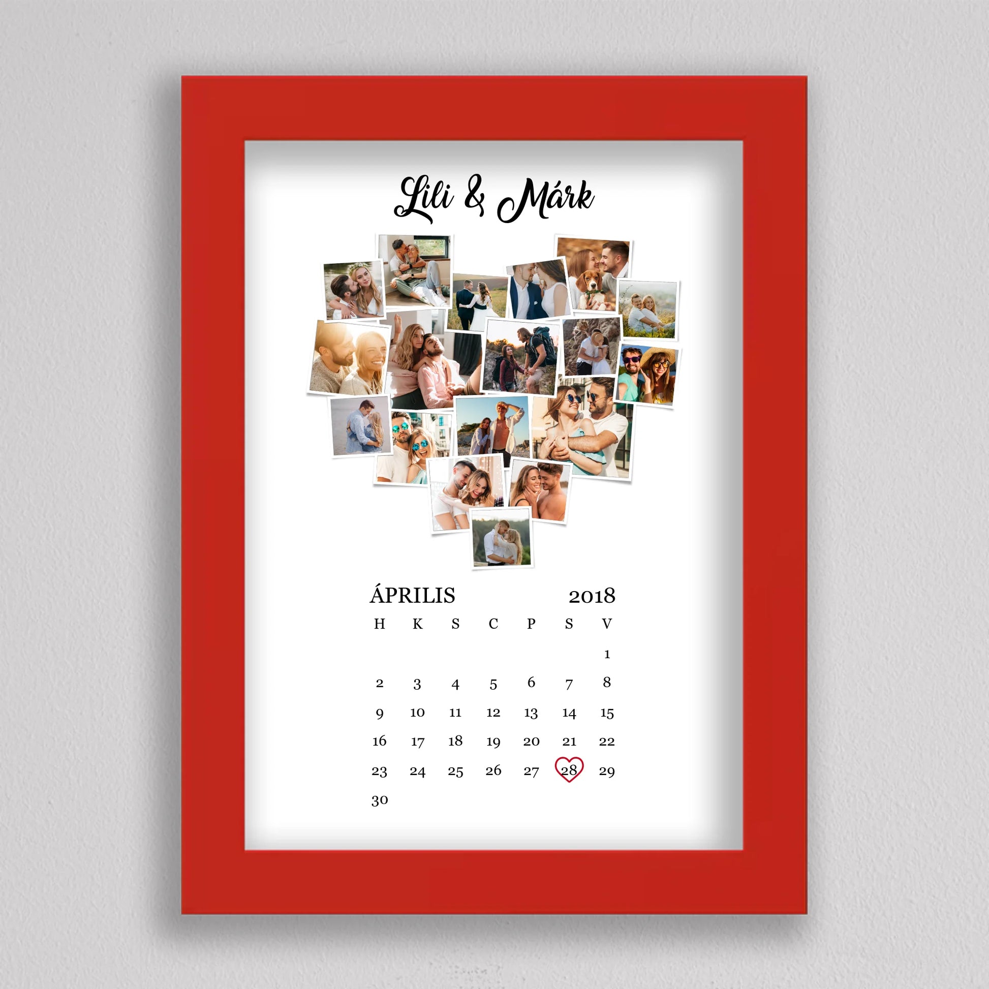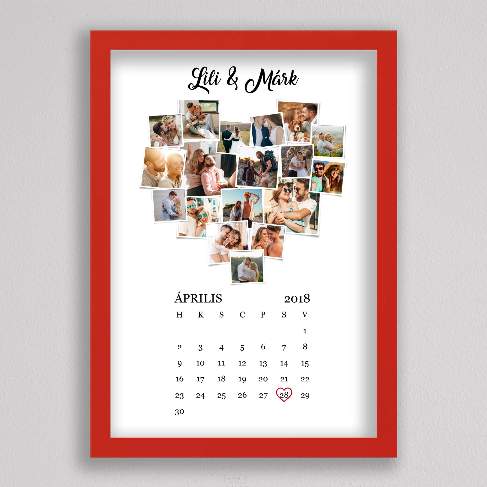 A Szerelmes emlékek naptárral – Polaroid stílusban egy különleges, szív alakú fotókollázs, amelyben életetek legmeghatóbb pillanatai elevenednek meg. A vintage hatású polaroid képek játékos, mégis elegáns megjelenést kölcsönöznek a poszternek, amelyet nevetekkel és egy fontos dátummal – például évfordulótokkal – személyre szabva készítünk el. A letisztult naptárrészlet egy szívecskével jelöli meg azt a napot, ami örökre összeköt benneteket. Tökéletes ajándék lehet szerelmeseknek évfordulóra, Valentin-napra vagy esküvői meglepetésként. Dekoratív, időtálló és érzelmileg gazdag alkotás, ami bármely otthon dísze lehet.