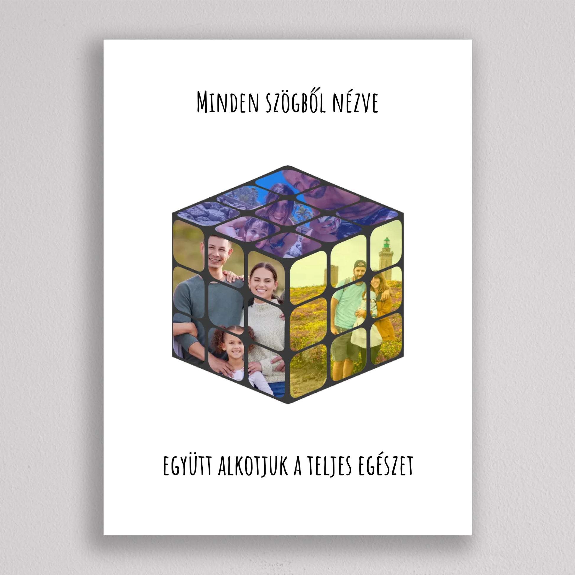 A Rubik kocka fotó kollázs egy igazán különleges és személyre szabható dekoráció, amely minden szögből nézve egyedi pillanatokat mutat be. A híres Rubik kocka inspirálta dizájn révén ez a fotókeret egyszerre játékos és esztétikus, tökéletes választás, ha egyedi ajándékot keresel szeretteidnek. Ez a különleges termék kiválóan alkalmas arra, hogy a család legszebb emlékeit örökítse meg egy kreatív és modern formában. Az üzenet, “Minden szögből nézve – Együtt alkotjuk a teljes egészet”, mély érzelmi töltetet ad a kollázsnak, amely bármely otthon dísze lehet. Ideális választás évfordulókra, születésnapokra vagy bármilyen különleges alkalomra, amikor valami igazán személyeset szeretnél ajándékozni.