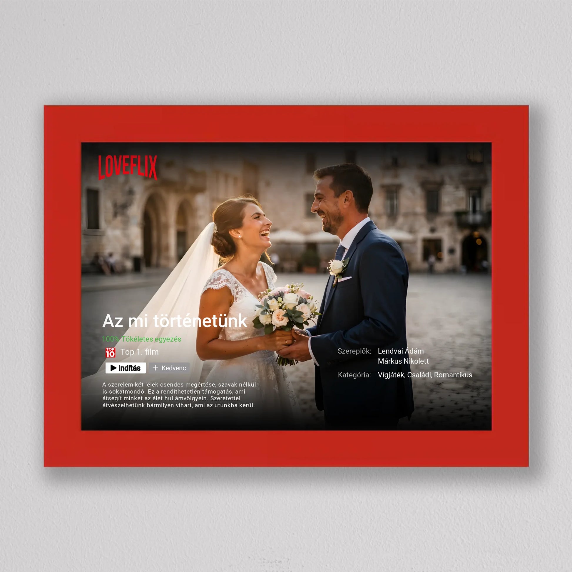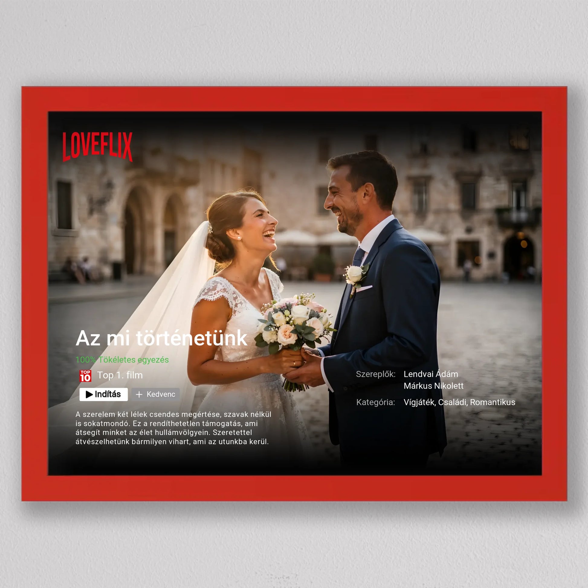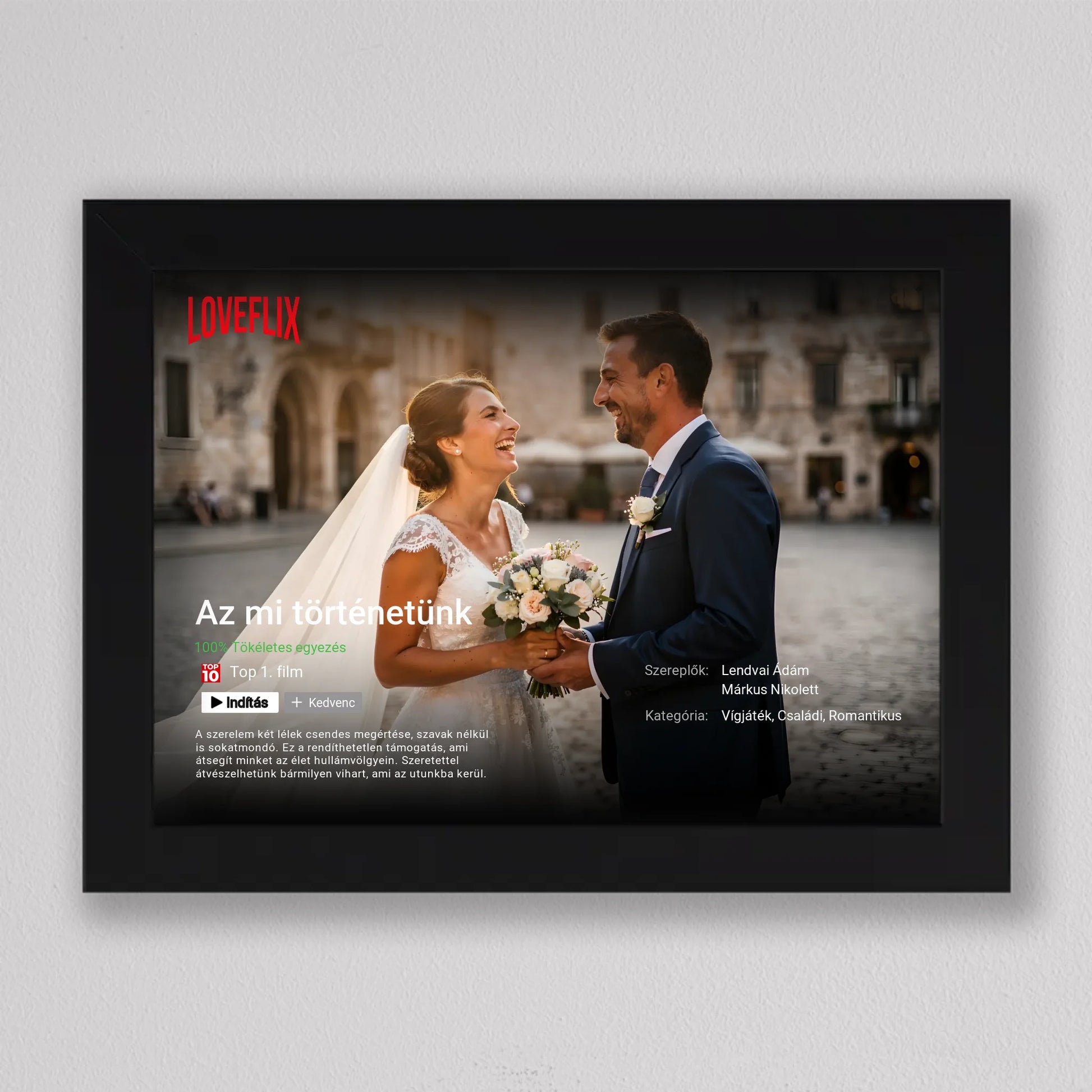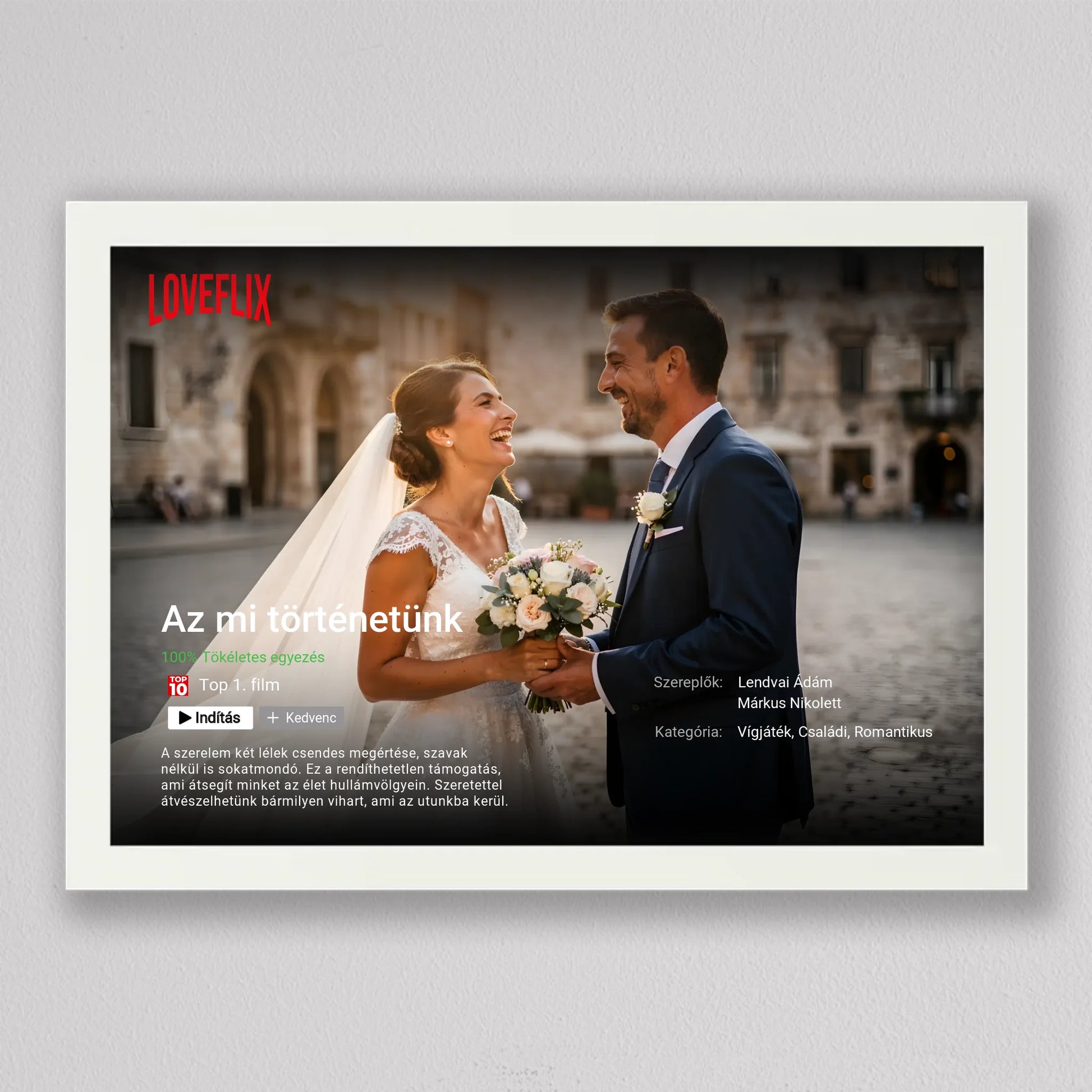 A Saját Netflix film poszter, fotó kollázs egy különleges, filmes hangulatú falikép, amelyben a Ti történetetek válik főszereplővé. A streaming platformokra emlékeztető dizájn – cím, szereplők, kategória, rövid leírás és „Top 10” stílusú elemek – egyedi és látványos módon emeli ki a közös pillanataitokat. Teljes mértékben személyre szabható: megadhatod a film címét, a neveket, a műfajt, az értékelést és akár a saját romantikus történetleírásotokat is. Prémium minőségű nyomtatással készül, így modern, letisztult dekorációként tökéletesen illeszkedik nappaliba, hálószobába vagy ajándékként esküvőre, évfordulóra és Valentin-napra. Ez a személyre szabható film poszter nem csupán fotókollázs, hanem egy kreatív szerelmi vallomás, amely minden nap emlékeztet arra, hogy a Ti történetetek az igazi főműsoridő.