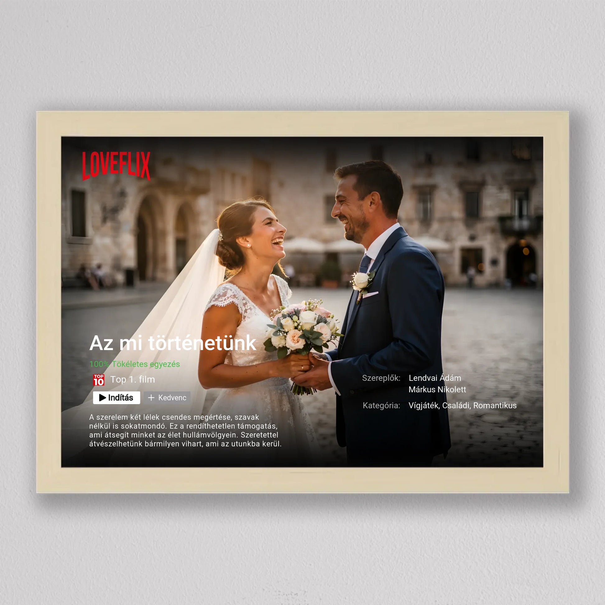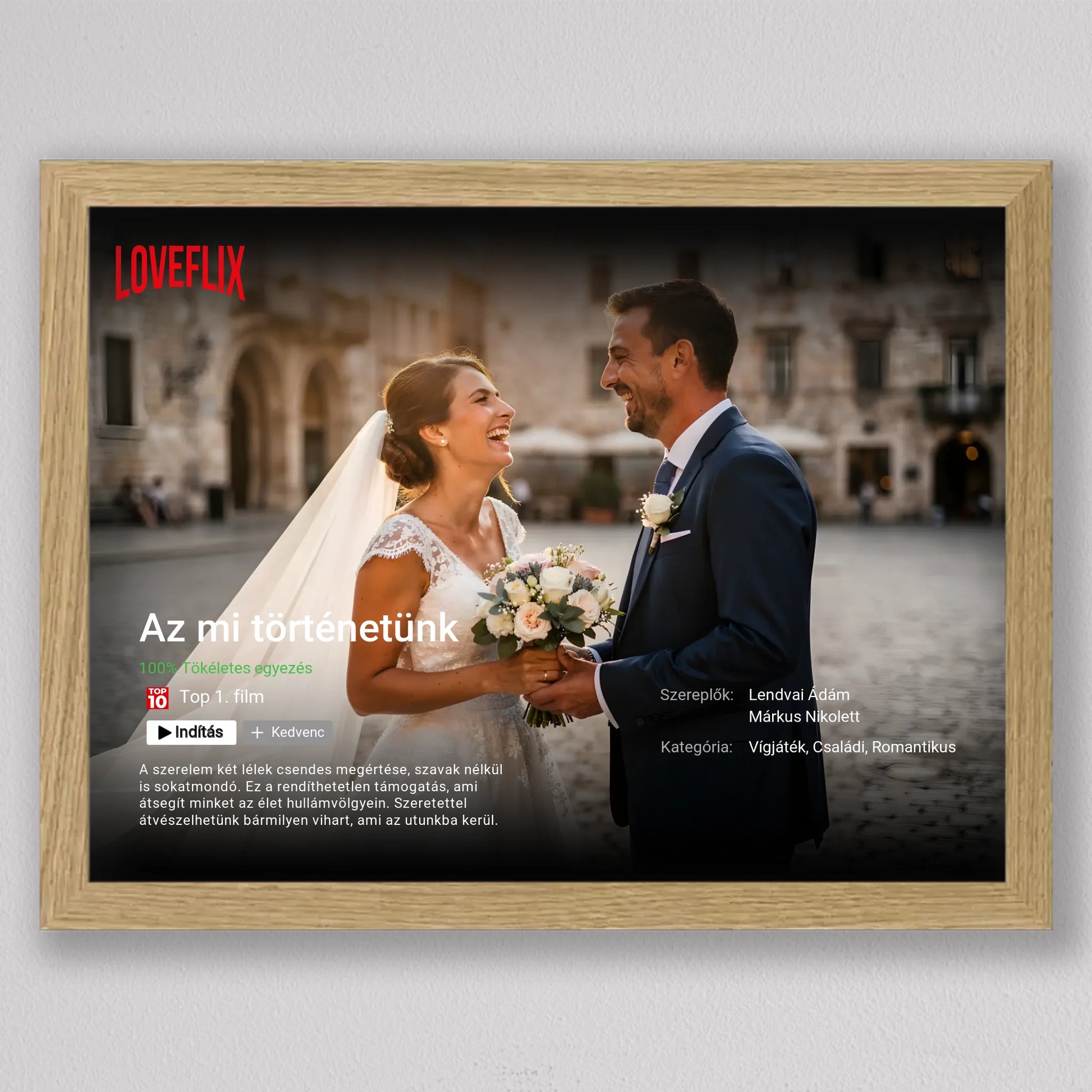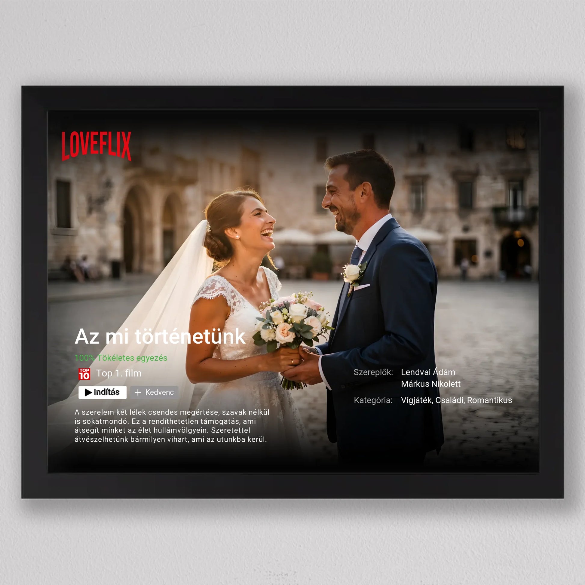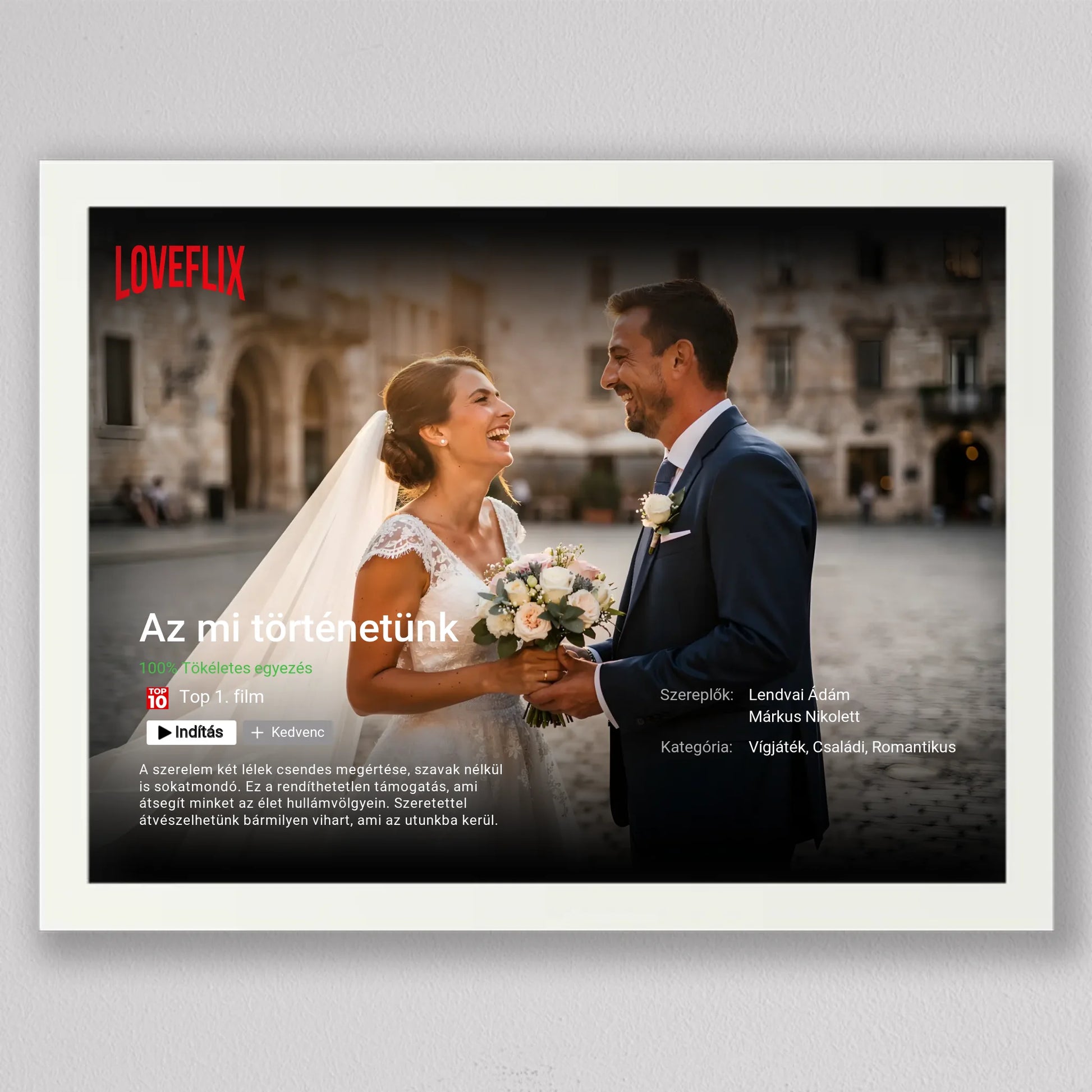 A Saját Netflix film poszter, fotó kollázs egy különleges, filmes hangulatú falikép, amelyben a Ti történetetek válik főszereplővé. A streaming platformokra emlékeztető dizájn – cím, szereplők, kategória, rövid leírás és „Top 10” stílusú elemek – egyedi és látványos módon emeli ki a közös pillanataitokat. Teljes mértékben személyre szabható: megadhatod a film címét, a neveket, a műfajt, az értékelést és akár a saját romantikus történetleírásotokat is. Prémium minőségű nyomtatással készül, így modern, letisztult dekorációként tökéletesen illeszkedik nappaliba, hálószobába vagy ajándékként esküvőre, évfordulóra és Valentin-napra. Ez a személyre szabható film poszter nem csupán fotókollázs, hanem egy kreatív szerelmi vallomás, amely minden nap emlékeztet arra, hogy a Ti történetetek az igazi főműsoridő.