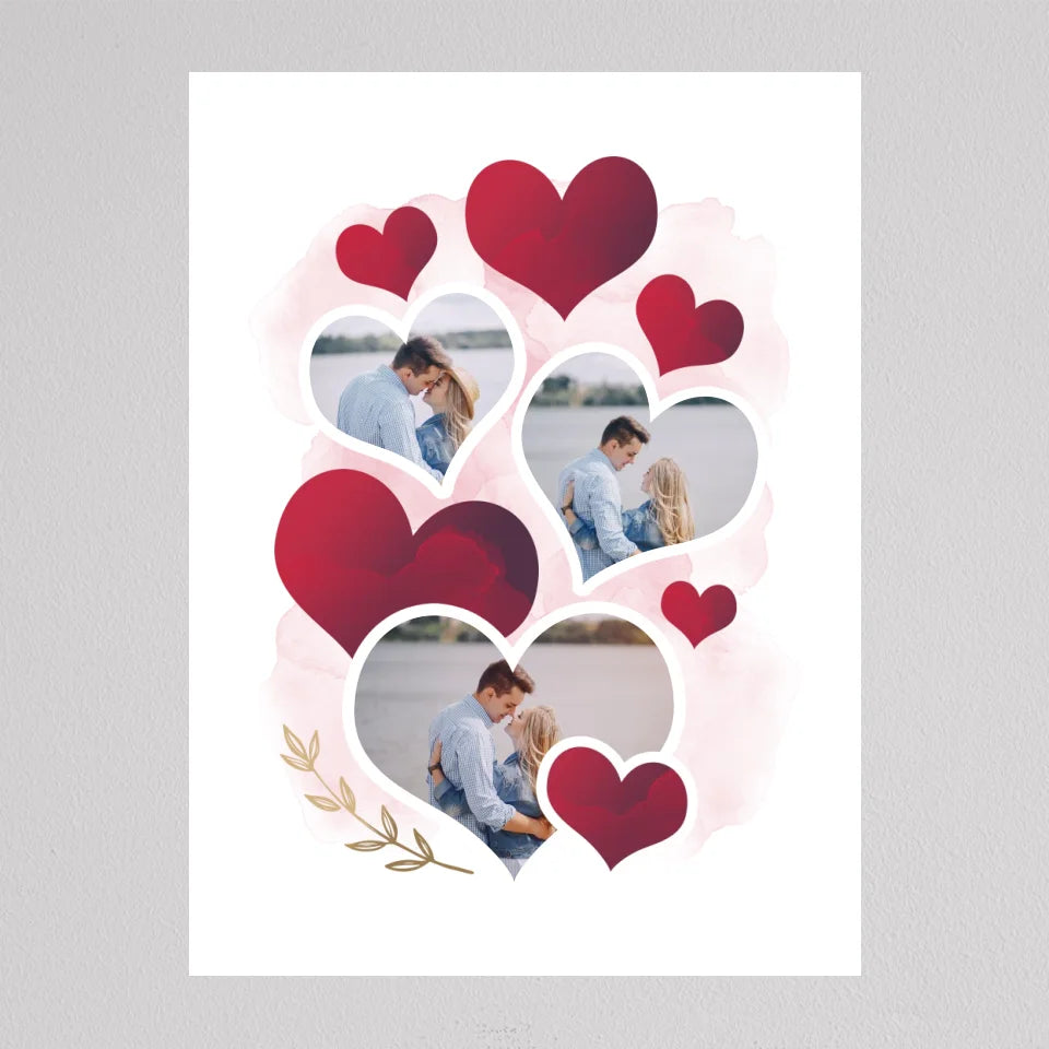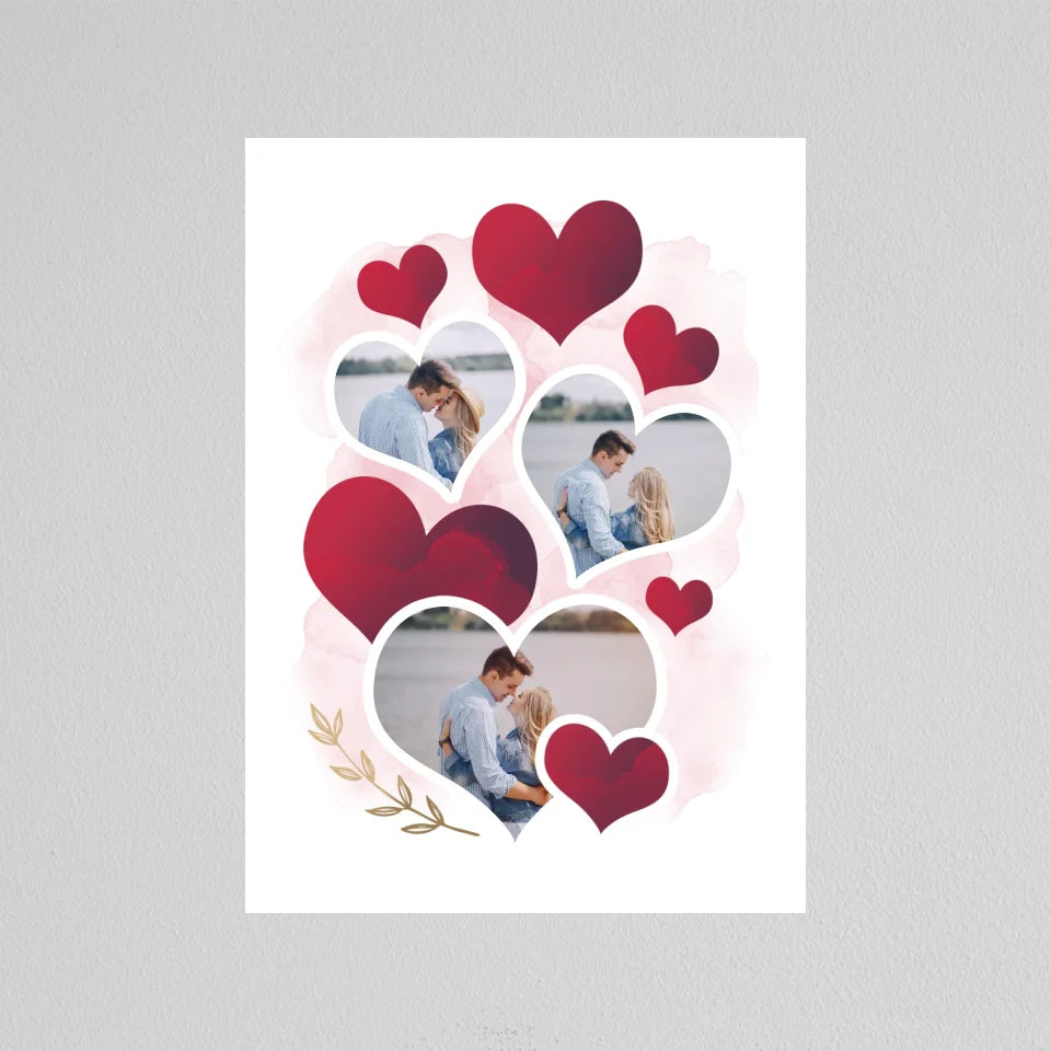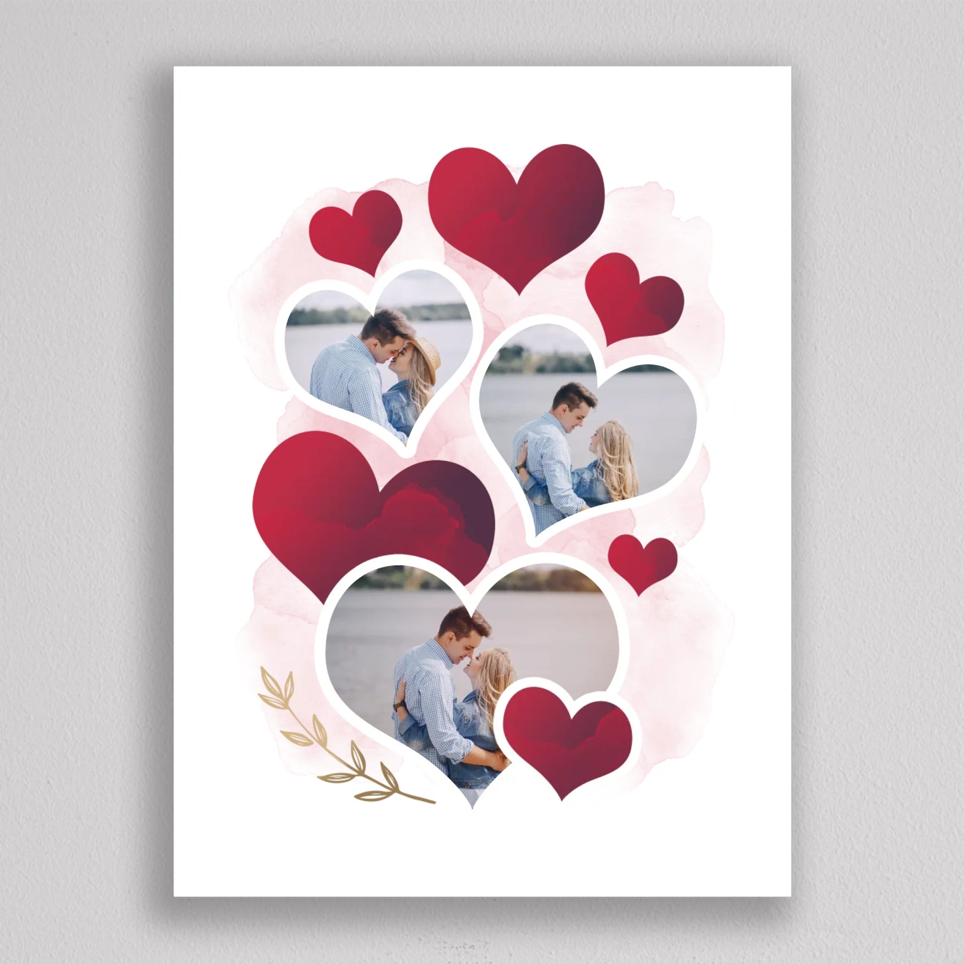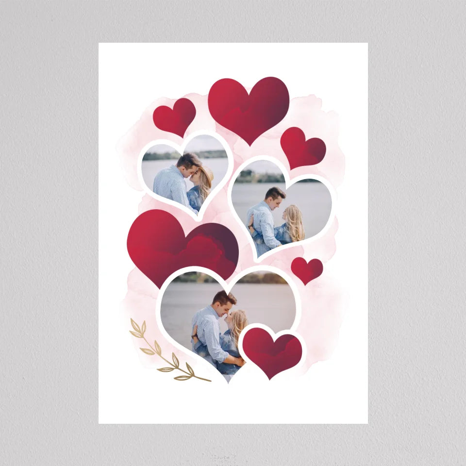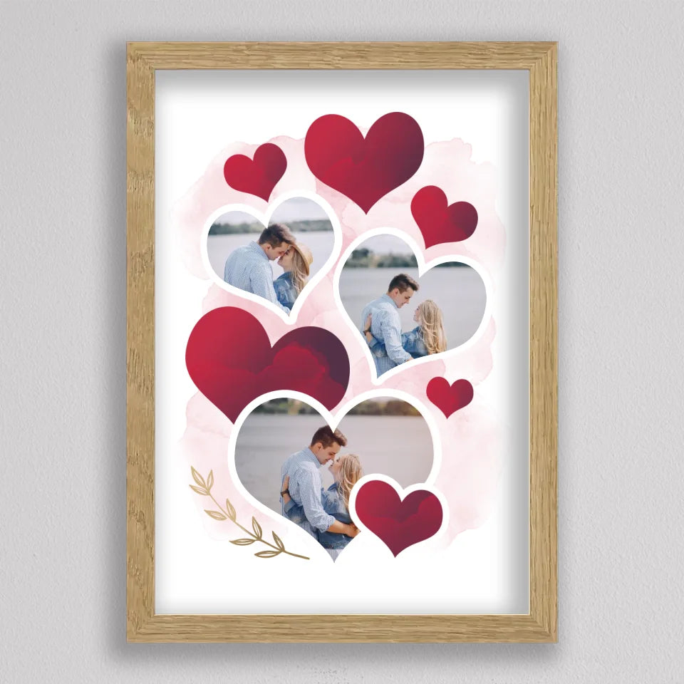 A Szerelmes szívek fotó kollázs tökéletes ajándék pároknak, akik szeretnék megőrizni a legszebb közös pillanataikat egy elegáns és szív alakú formában. Ez az egyedi, személyre szabható kollázs lehetőséget ad arra, hogy a kapcsolat legfontosabb fotói stílusosan jelenjenek meg, szív alakú keretben, romantikus háttérrel. Tökéletes választás évfordulókra, Valentin-napra vagy akár esküvői ajándéknak. A termék teljes mértékben testreszabható, hogy minden pár számára különleges, személyes emléket nyújtson.