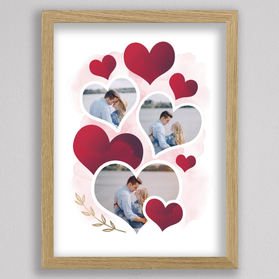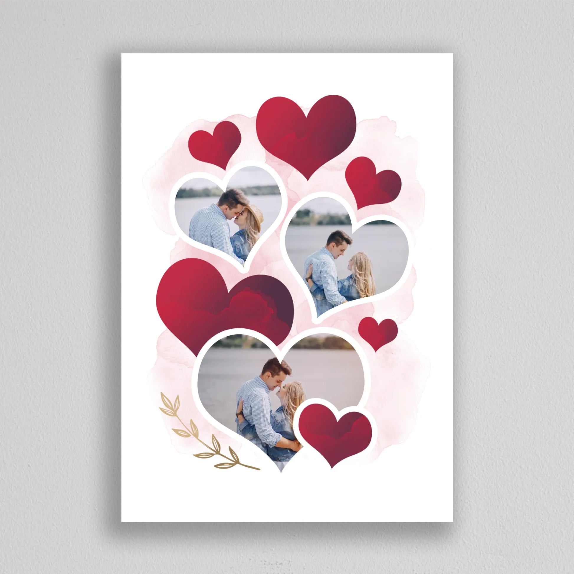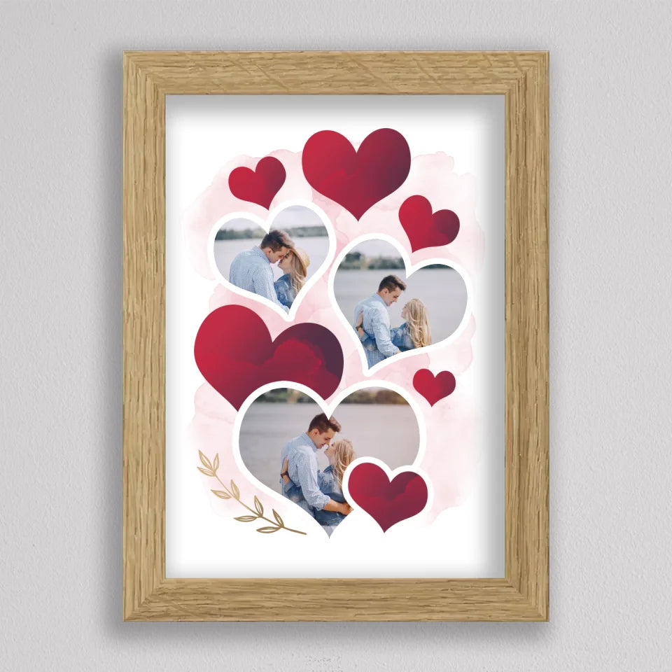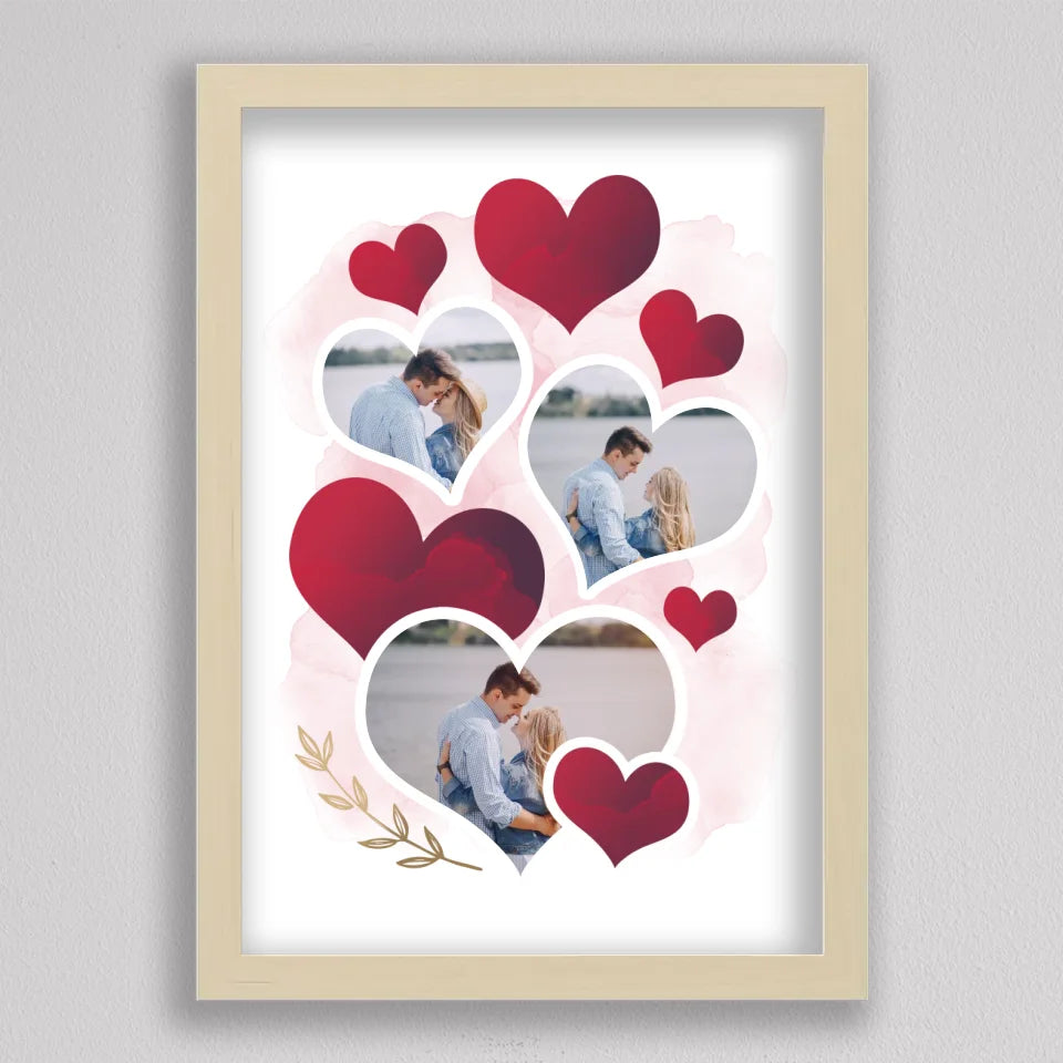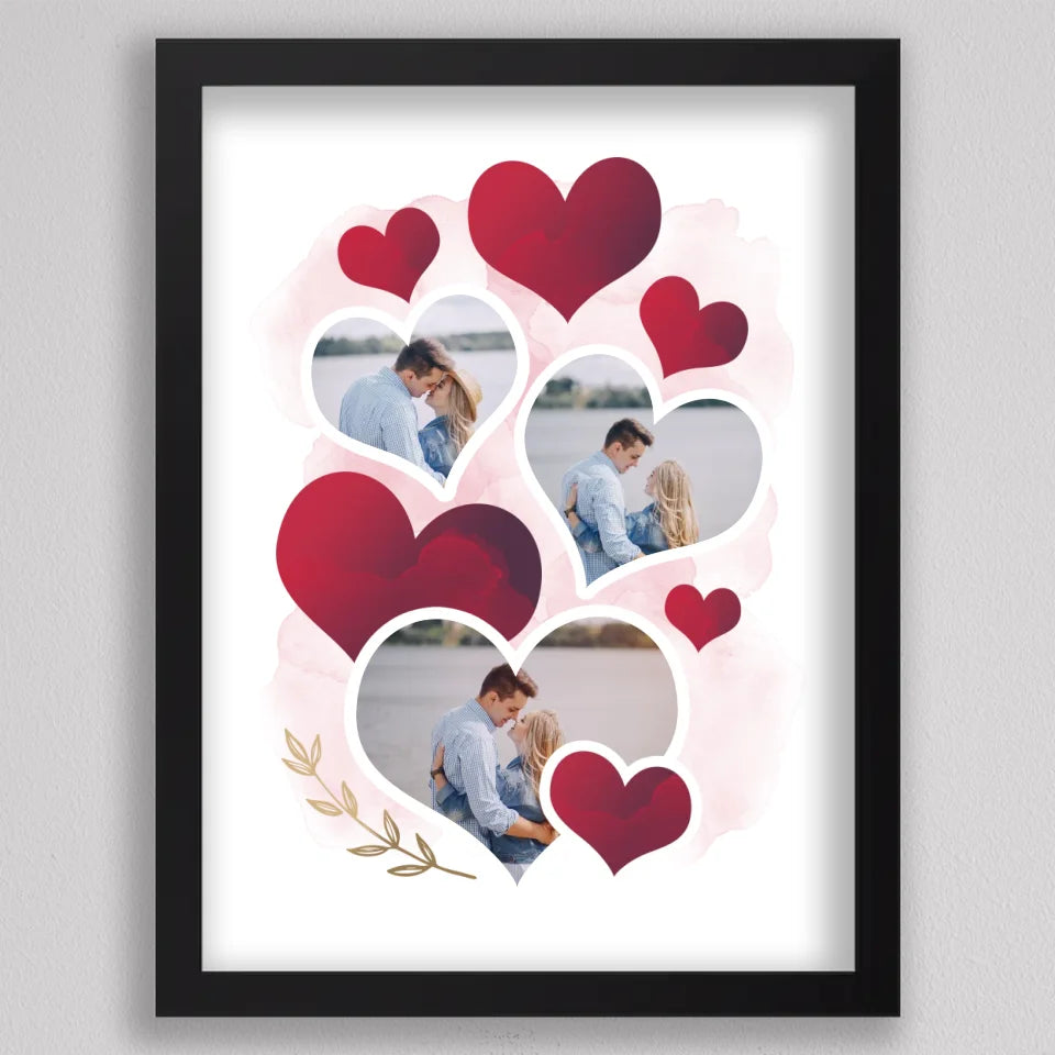 A Szerelmes szívek fotó kollázs tökéletes ajándék pároknak, akik szeretnék megőrizni a legszebb közös pillanataikat egy elegáns és szív alakú formában. Ez az egyedi, személyre szabható kollázs lehetőséget ad arra, hogy a kapcsolat legfontosabb fotói stílusosan jelenjenek meg, szív alakú keretben, romantikus háttérrel. Tökéletes választás évfordulókra, Valentin-napra vagy akár esküvői ajándéknak. A termék teljes mértékben testreszabható, hogy minden pár számára különleges, személyes emléket nyújtson.