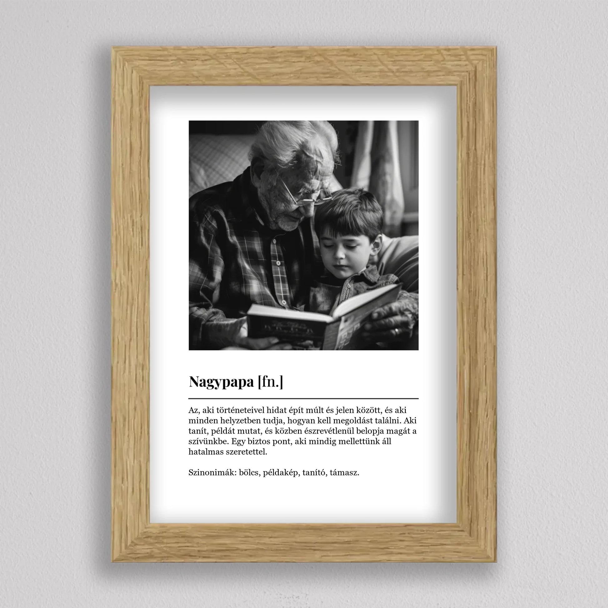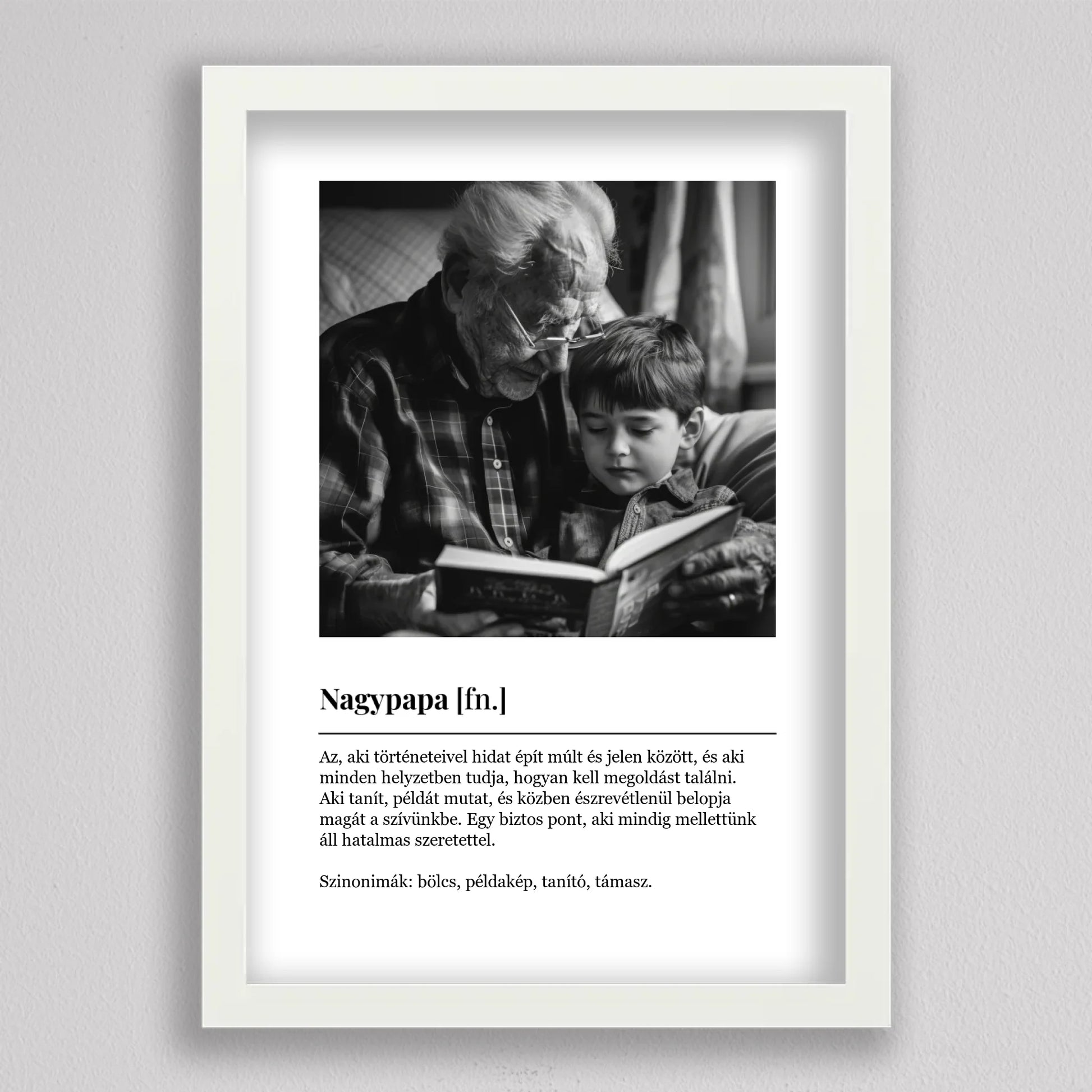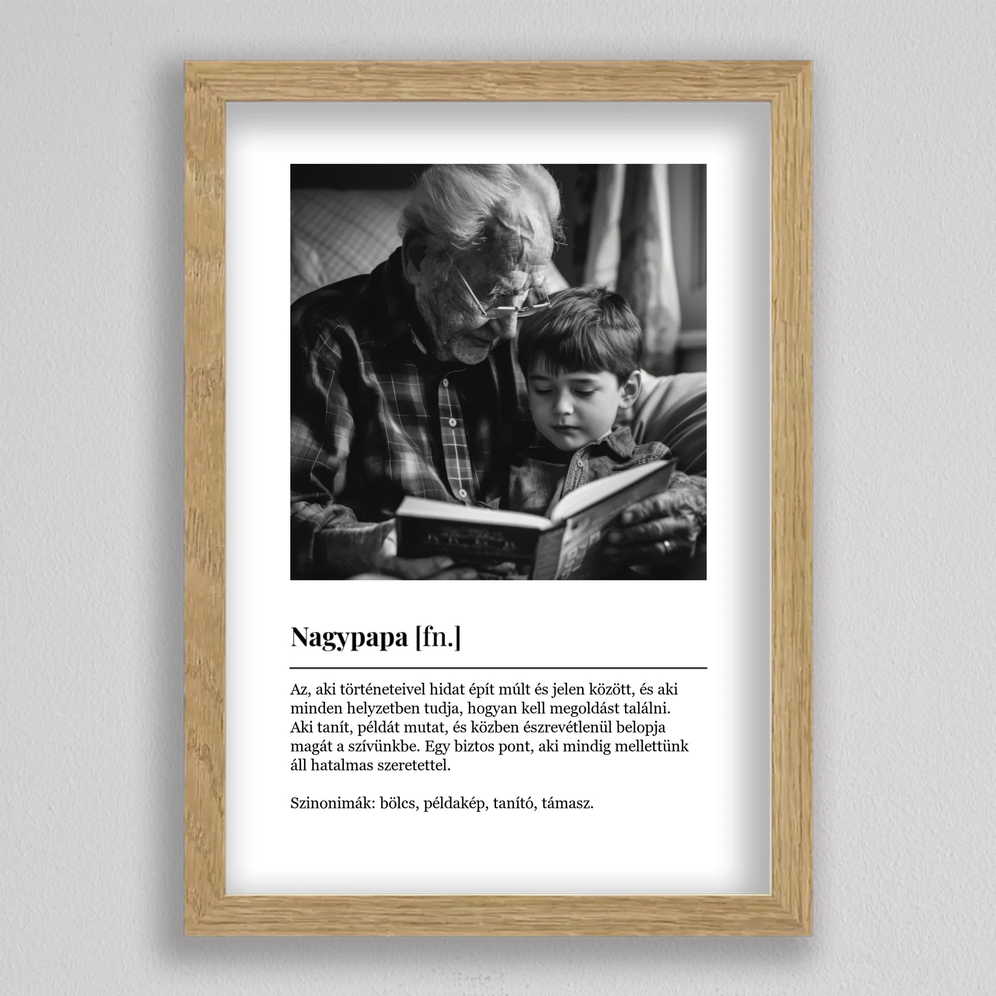 A Szeretet Szótár – Nagypapa egy különleges, személyre szabható falikép, amely méltó emléket állít a család bölcs és szeretetteljes oszlopának. Megható szövege mély érzelmeket közvetít, miközben a választott fotóval igazán személyessé és egyedivé válik az ajándék. Ideális meglepetés születésnapra, apák napjára vagy bármilyen alkalomra, amikor szeretnénk kimondani: „Köszönöm, hogy vagy.” Letisztult dizájnja minden otthonba tökéletesen illeszkedik, és örök emlékké válik a falon. Egy apró gesztus, amely hatalmas érzelmi értéket hordoz – mert a nagypapa szeretete örökké velünk marad.