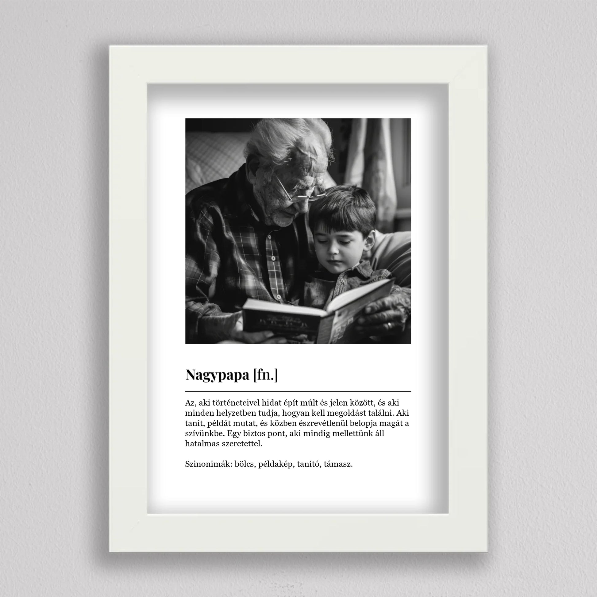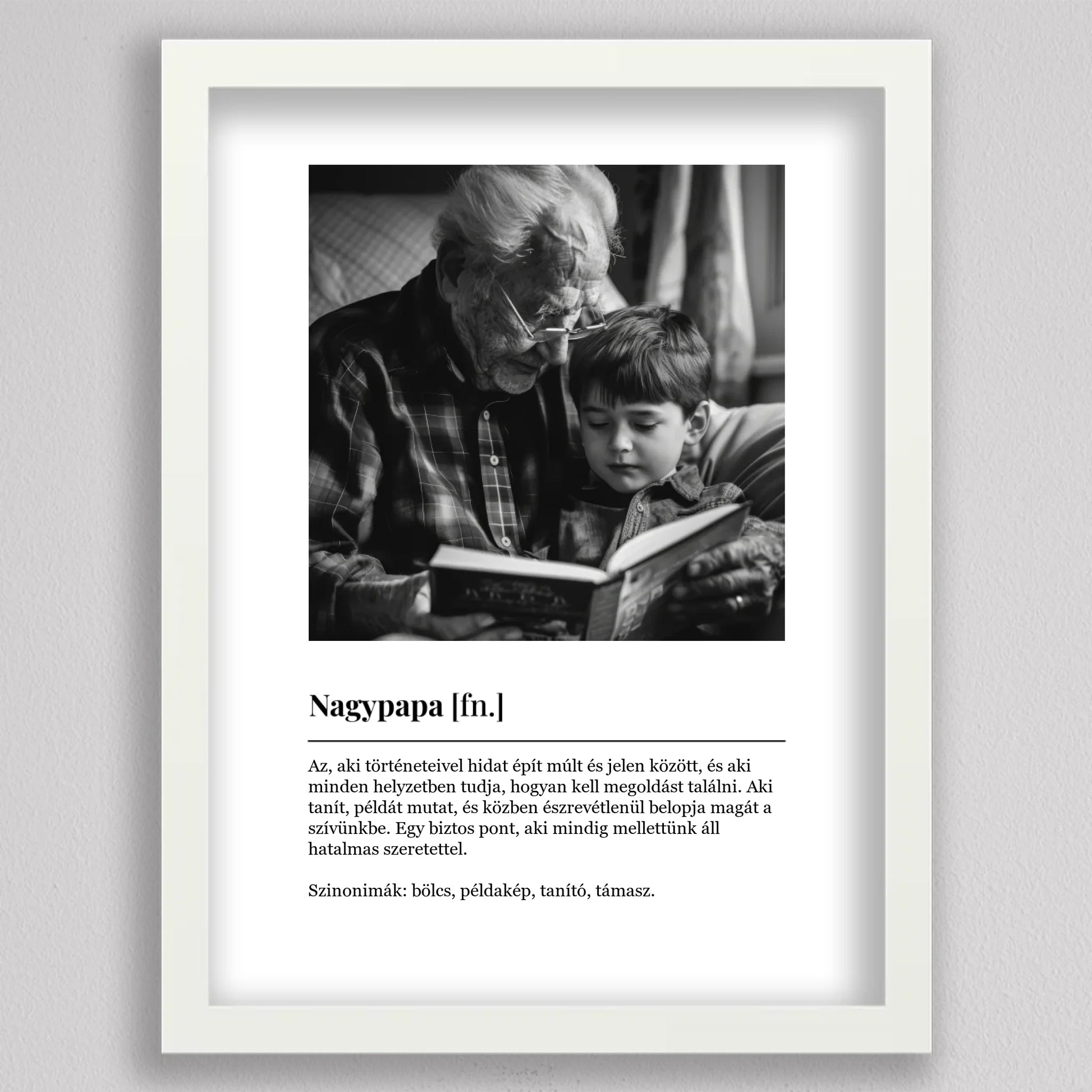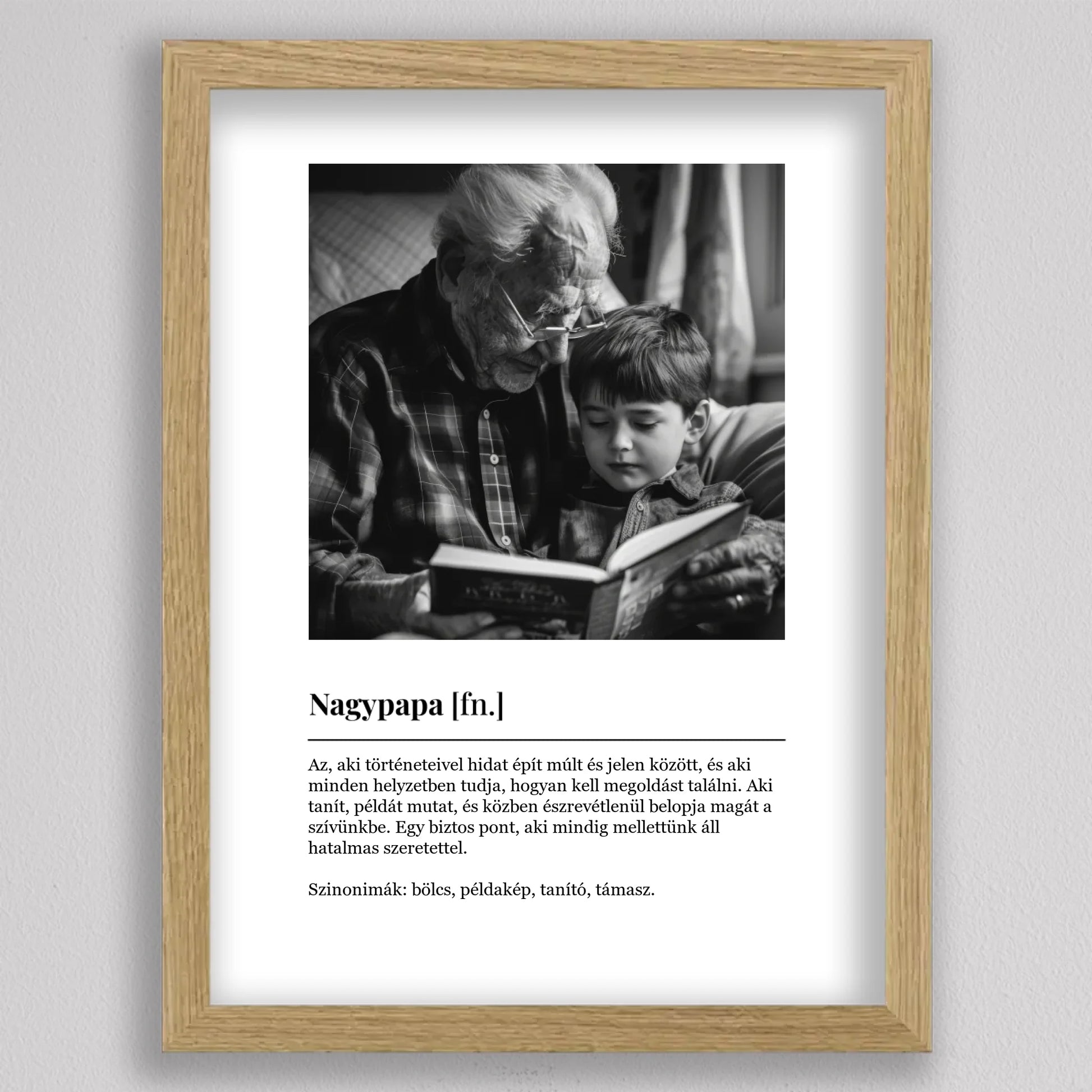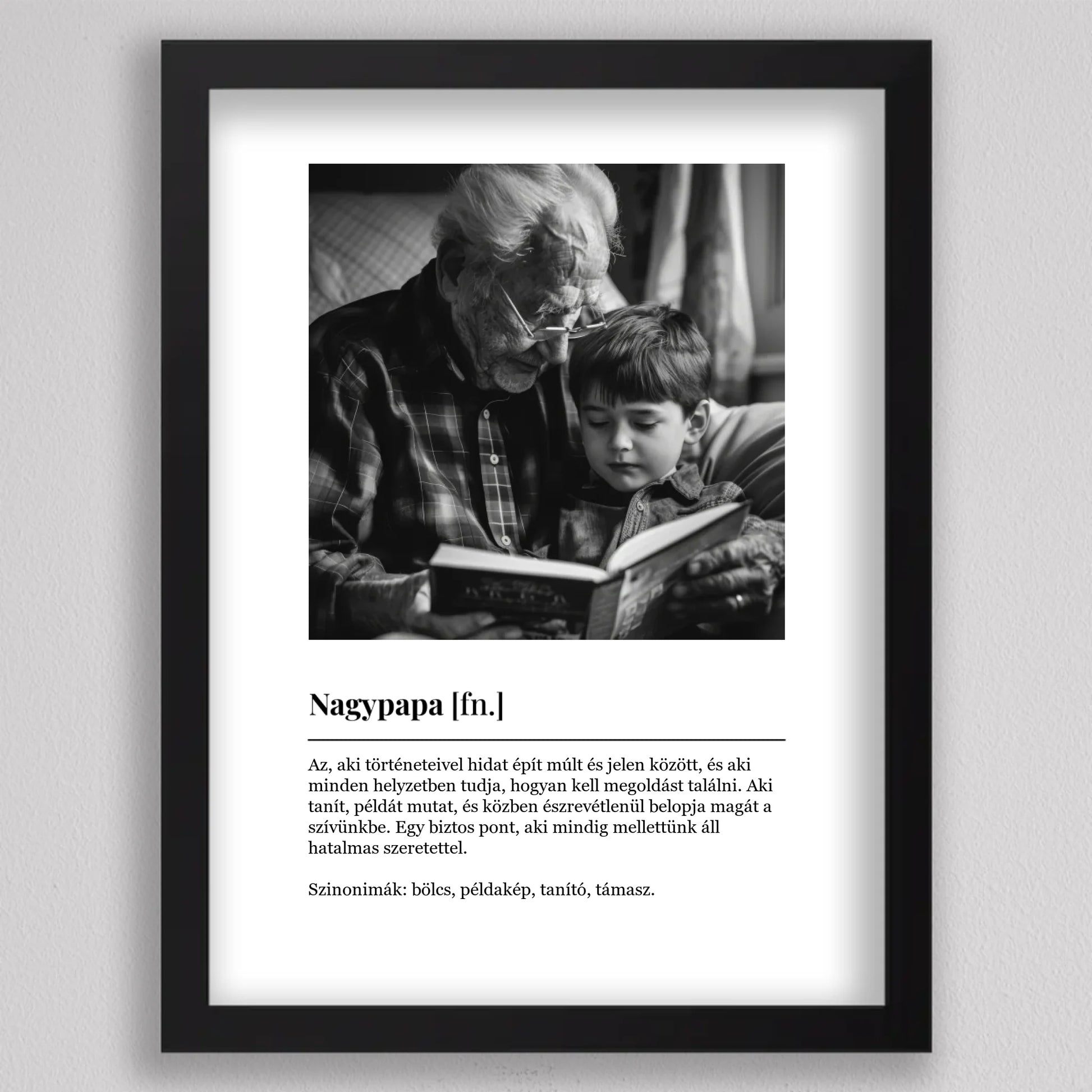 A Szeretet Szótár – Nagypapa egy különleges, személyre szabható falikép, amely méltó emléket állít a család bölcs és szeretetteljes oszlopának. Megható szövege mély érzelmeket közvetít, miközben a választott fotóval igazán személyessé és egyedivé válik az ajándék. Ideális meglepetés születésnapra, apák napjára vagy bármilyen alkalomra, amikor szeretnénk kimondani: „Köszönöm, hogy vagy.” Letisztult dizájnja minden otthonba tökéletesen illeszkedik, és örök emlékké válik a falon. Egy apró gesztus, amely hatalmas érzelmi értéket hordoz – mert a nagypapa szeretete örökké velünk marad.