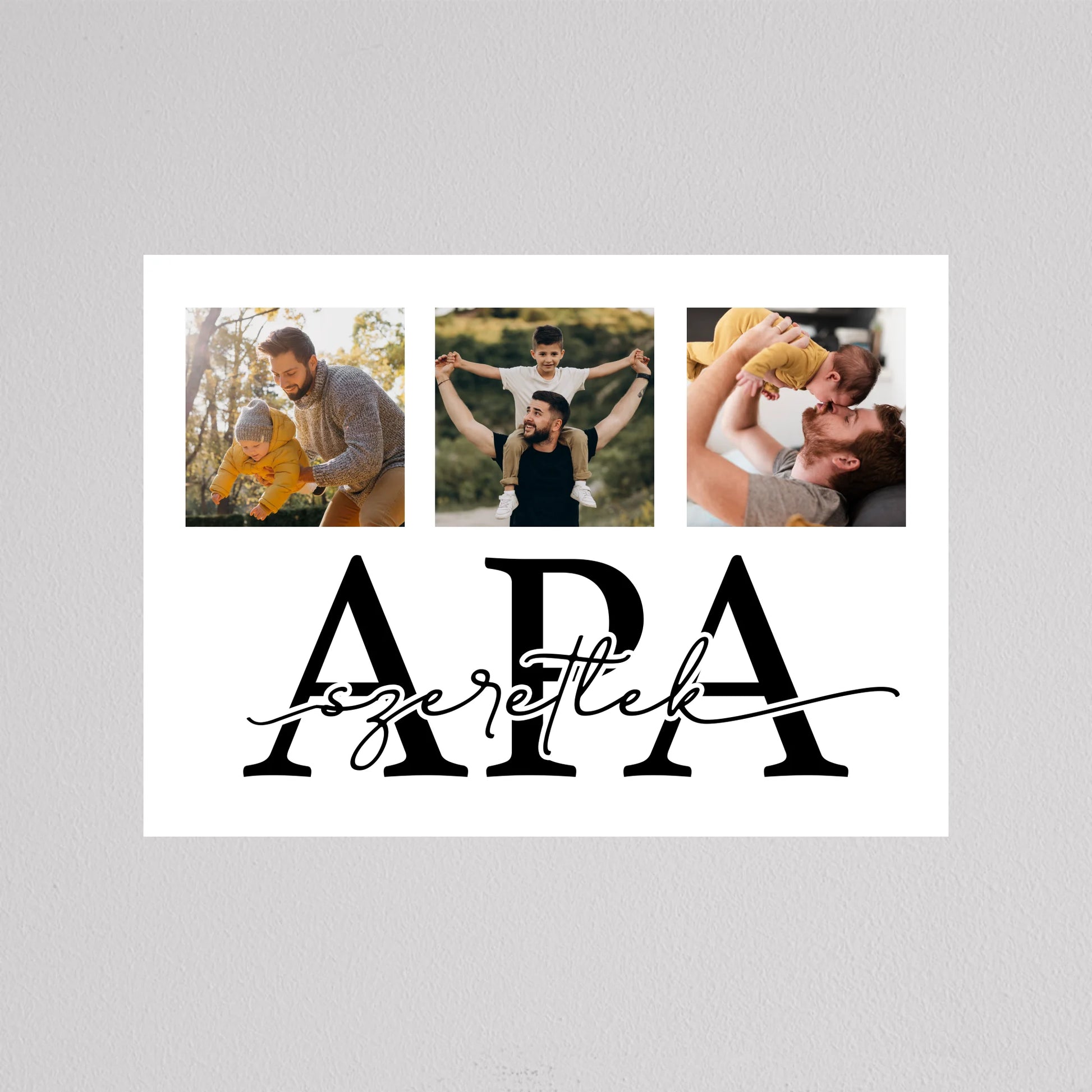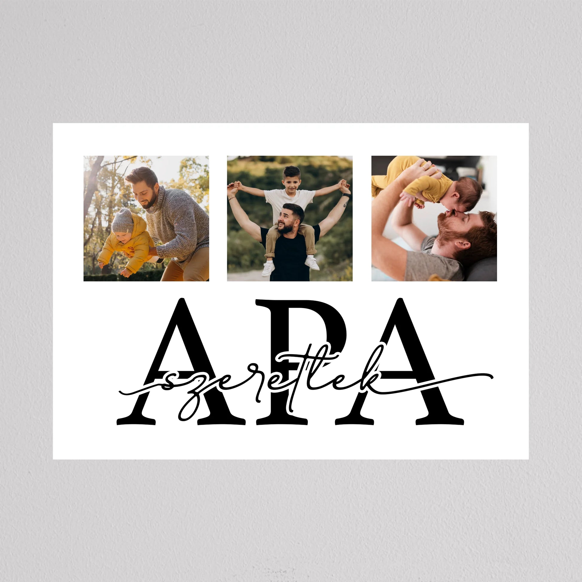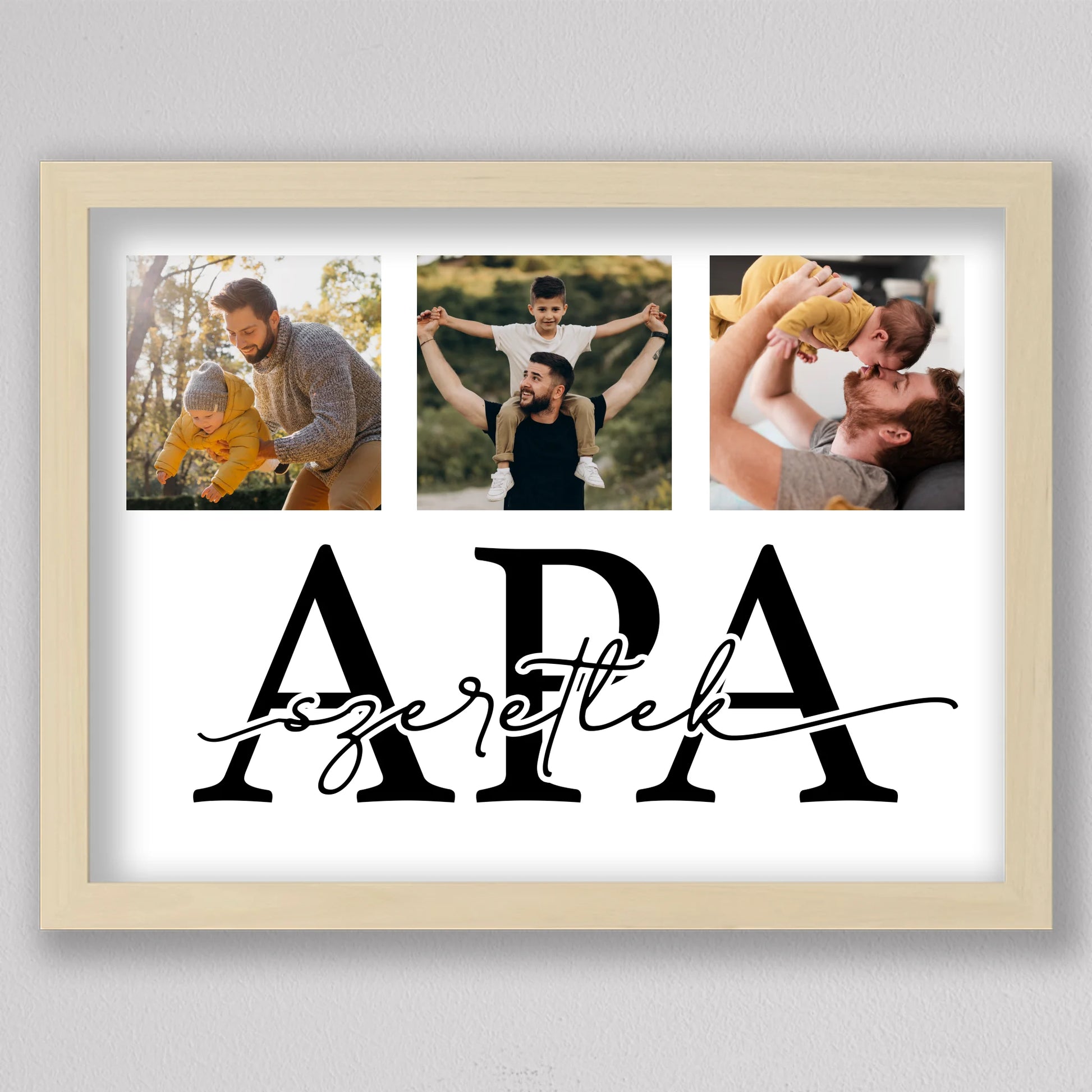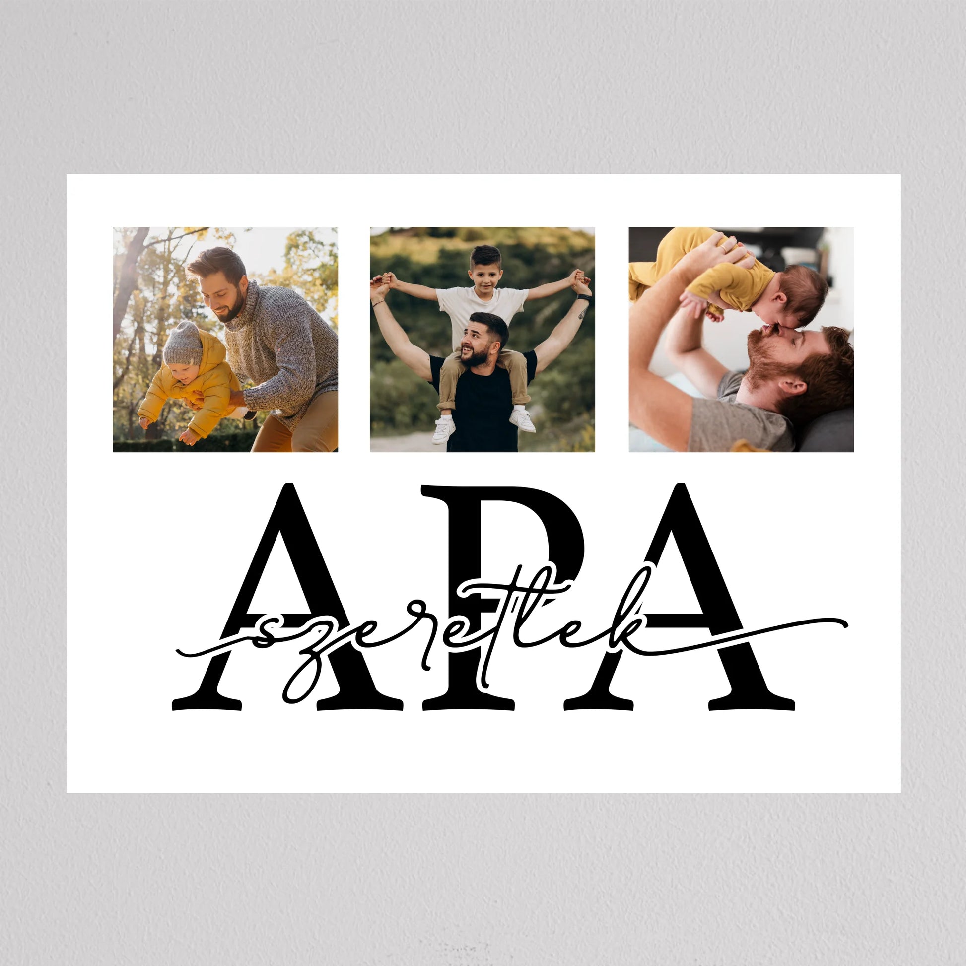 Ajándékozz valódi érzelmeket! A Szeretlek APA – közös pillanatok fotókollázs egy stílusos, letisztult designú fali dekoráció, amely három szívet melengető közös fotóval és a szeretetteljes “APA – szeretünk” felirattal teszi igazán különlegessé az otthon bármely pontját. Ez a személyre szabható fotókollázs tökéletes ajándék apák napjára, születésnapra vagy csak úgy, hogy kifejezd: fontos neked. A minimalista fekete-fehér színvilág elegáns megjelenést biztosít, míg a képek és szöveg egyedi kombinációja mély érzelmi hatást vált ki. Kiváló minőségű nyomtatás, igényes keretezés és időtálló ajándék azoknak az apáknak, akik megérdemlik, hogy különlegesnek érezzék magukat. Tedd emlékezetessé a közös pillanatokat, és lepd meg vele a szívedhez közel álló édesapát!