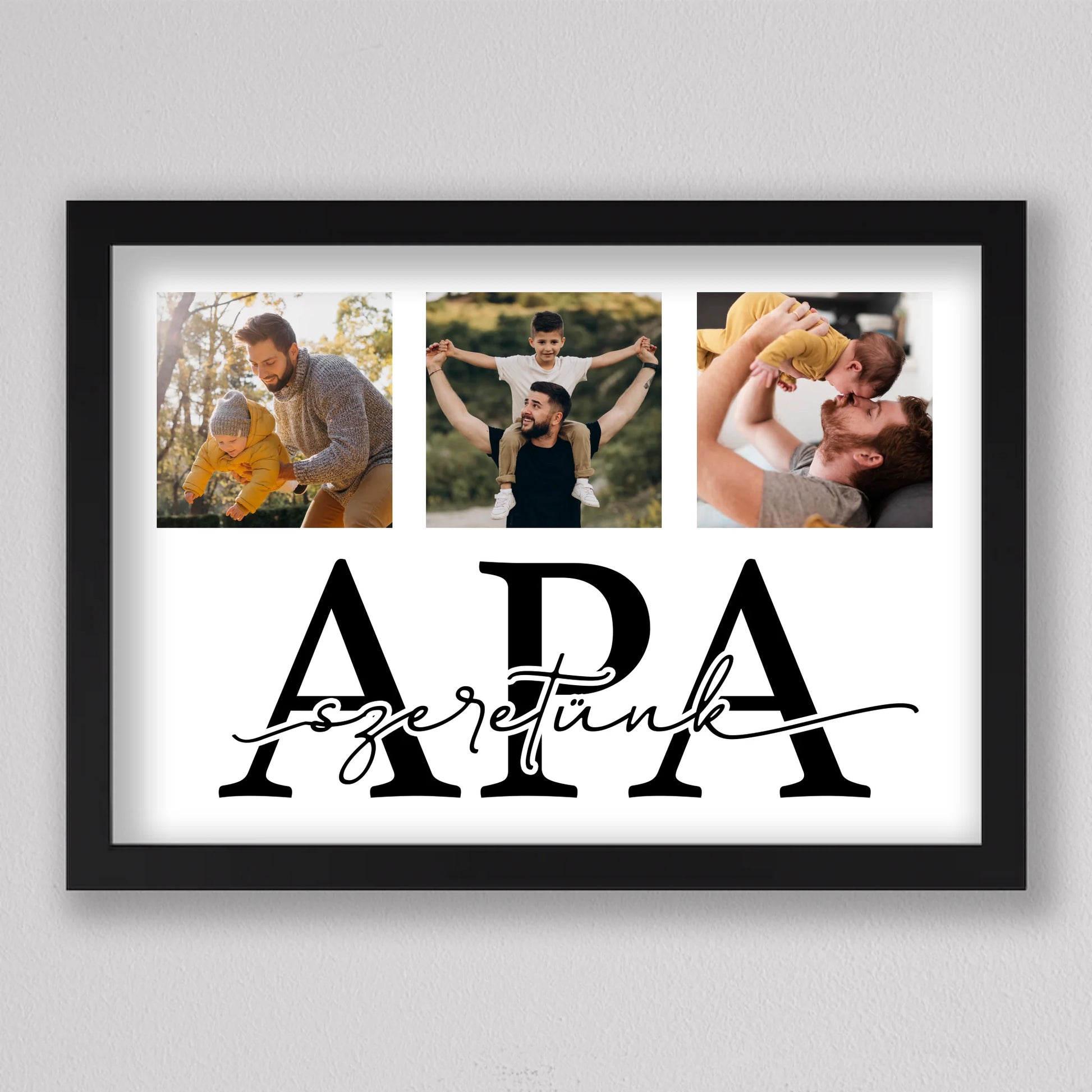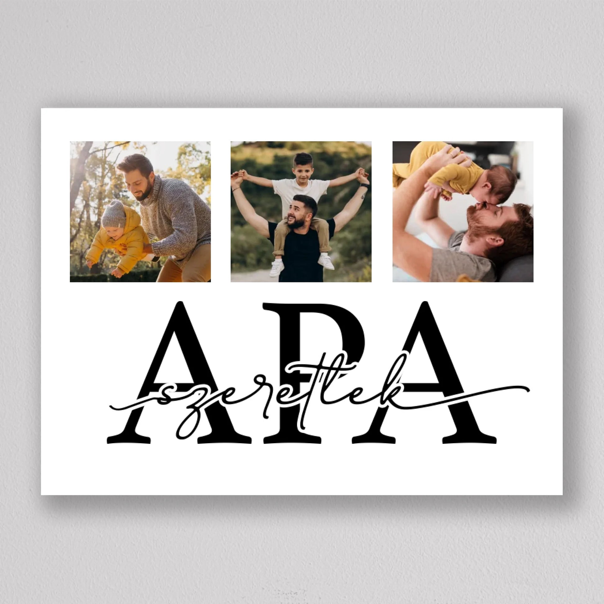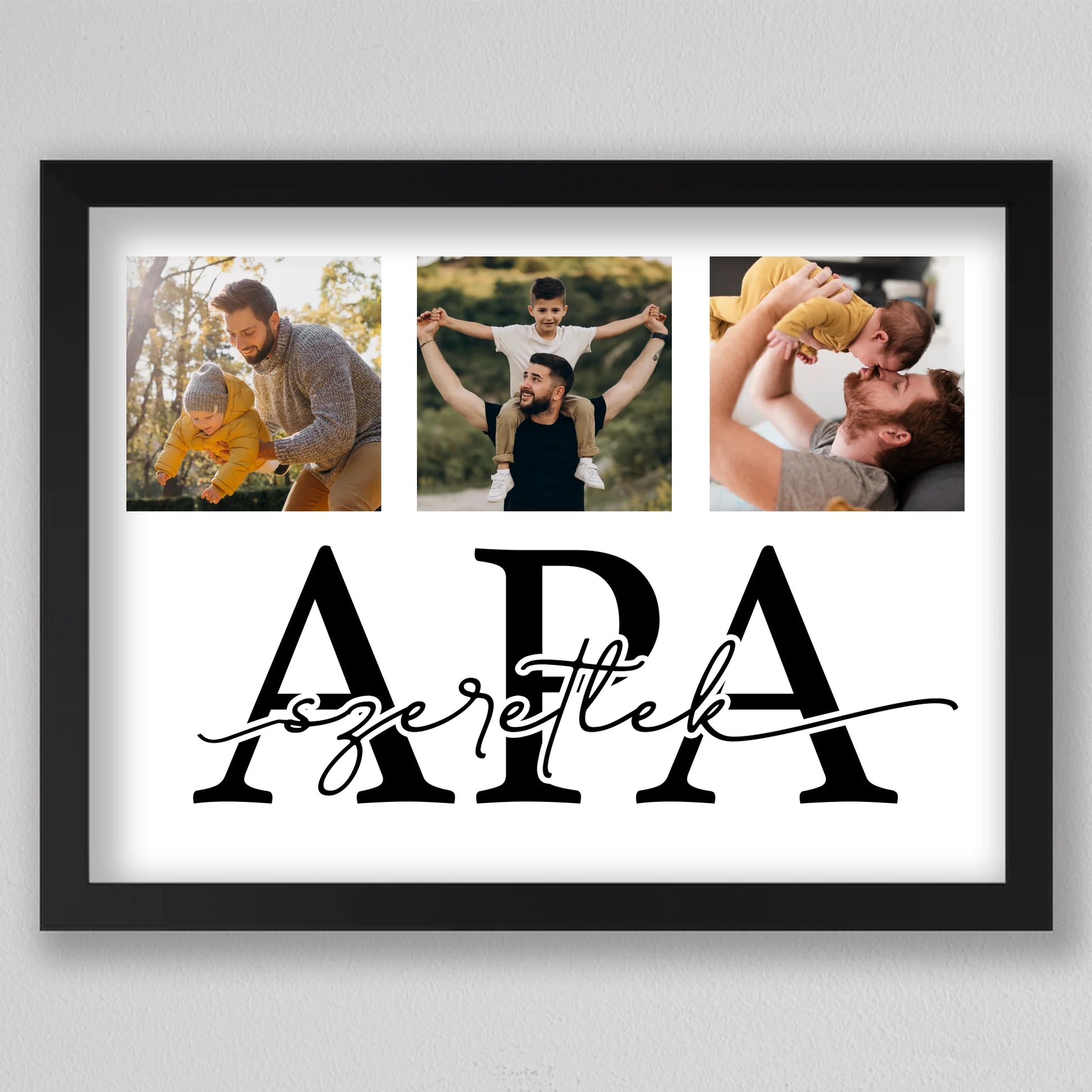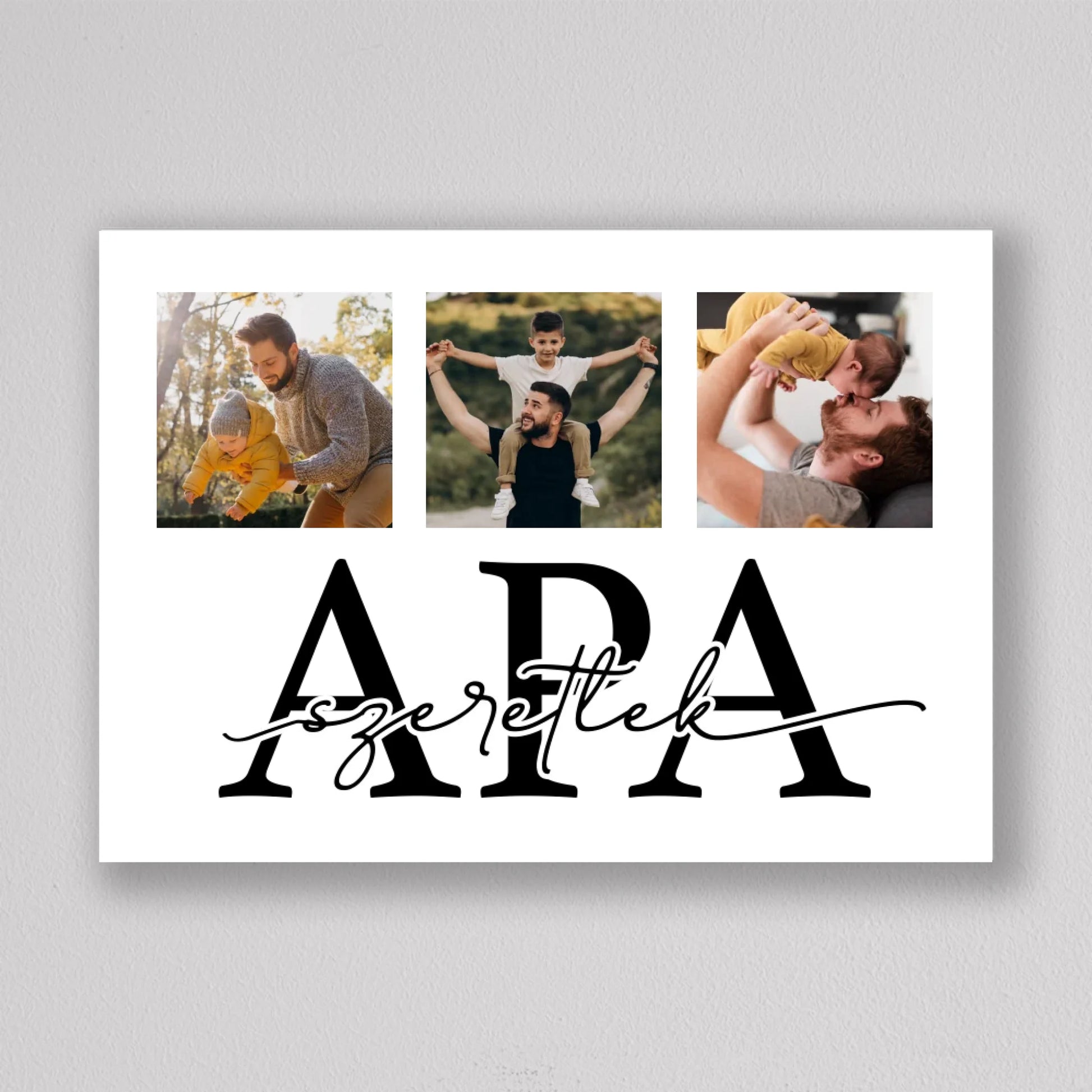 Ajándékozz valódi érzelmeket! A Szeretlek APA – közös pillanatok fotókollázs egy stílusos, letisztult designú fali dekoráció, amely három szívet melengető közös fotóval és a szeretetteljes “APA – szeretünk” felirattal teszi igazán különlegessé az otthon bármely pontját. Ez a személyre szabható fotókollázs tökéletes ajándék apák napjára, születésnapra vagy csak úgy, hogy kifejezd: fontos neked. A minimalista fekete-fehér színvilág elegáns megjelenést biztosít, míg a képek és szöveg egyedi kombinációja mély érzelmi hatást vált ki. Kiváló minőségű nyomtatás, igényes keretezés és időtálló ajándék azoknak az apáknak, akik megérdemlik, hogy különlegesnek érezzék magukat. Tedd emlékezetessé a közös pillanatokat, és lepd meg vele a szívedhez közel álló édesapát!
