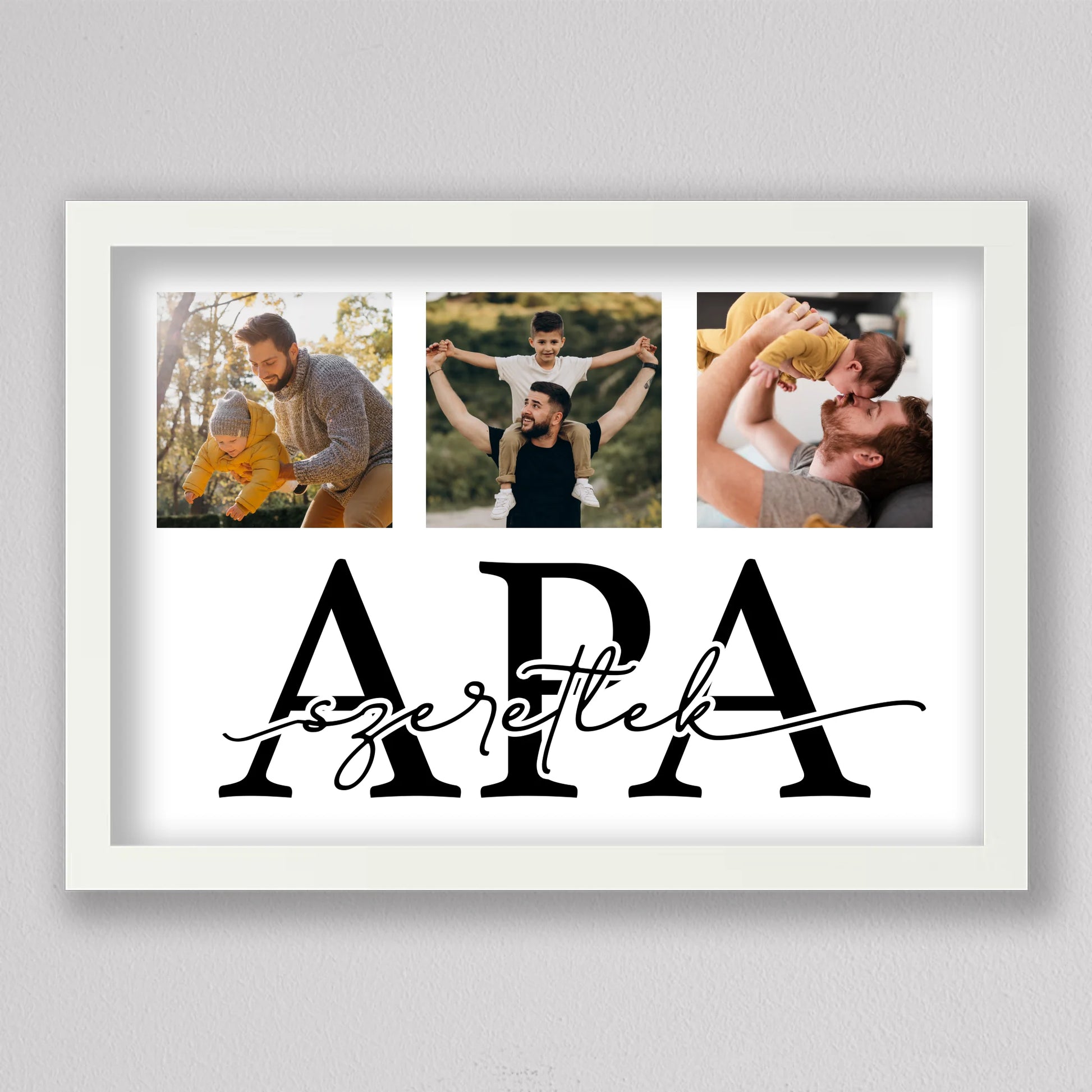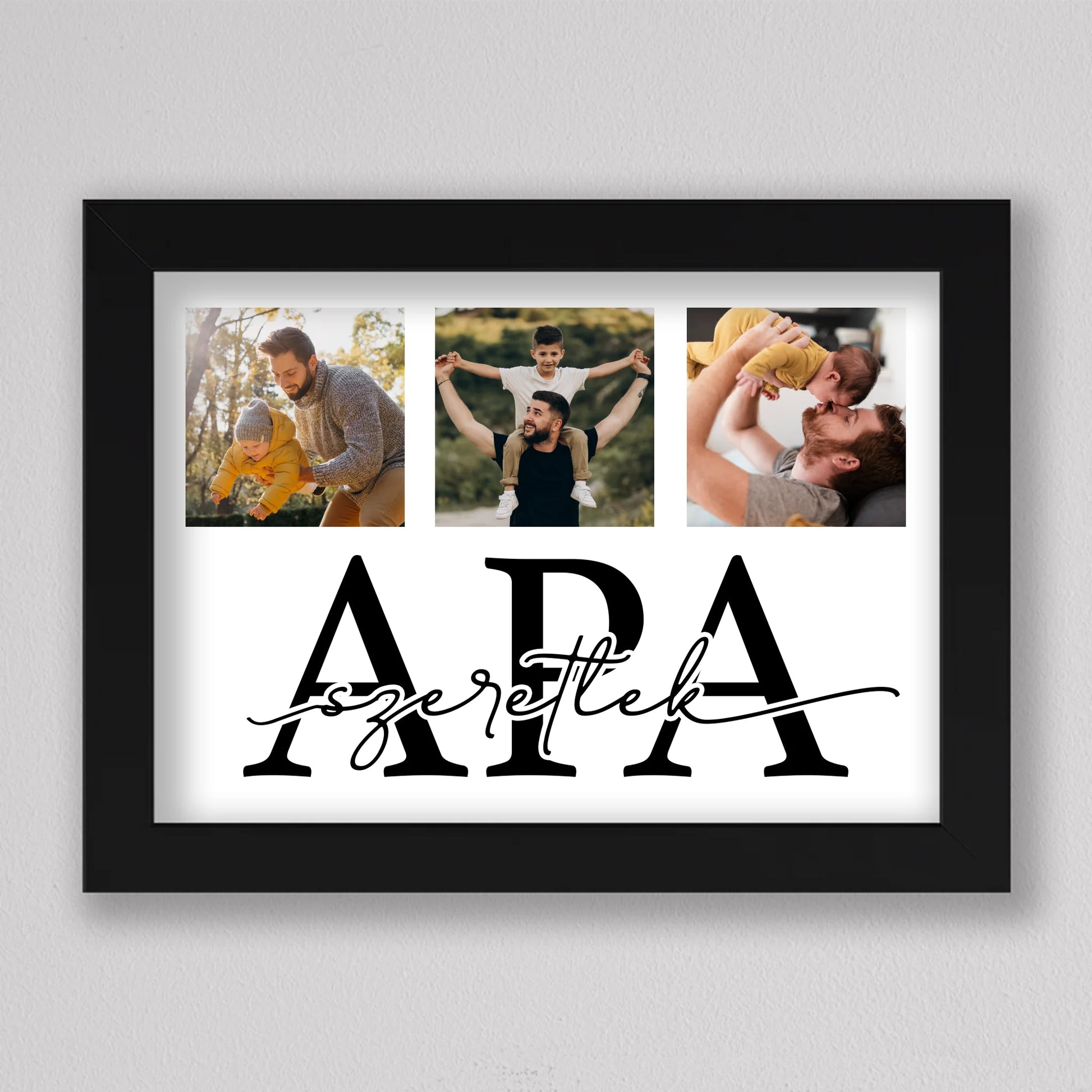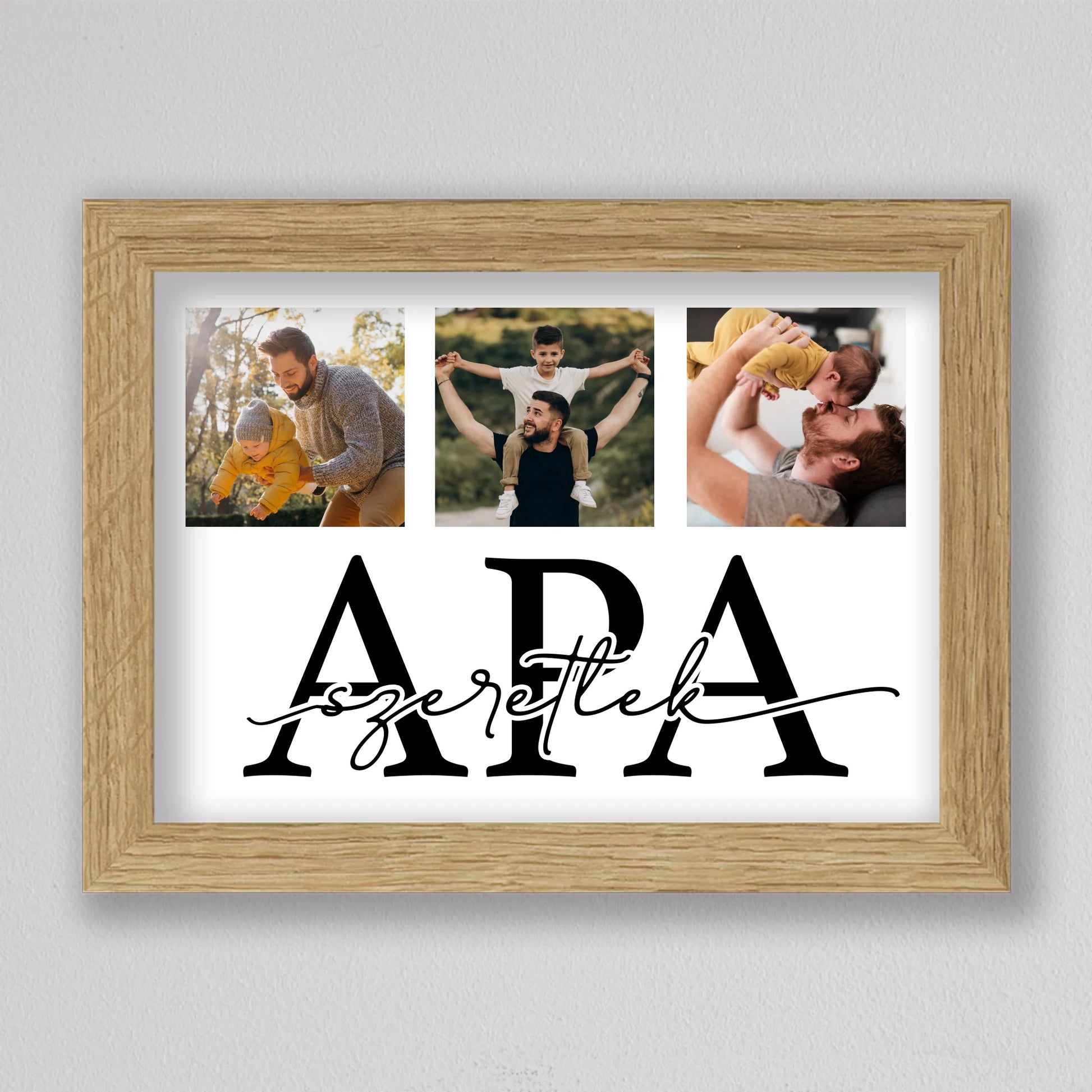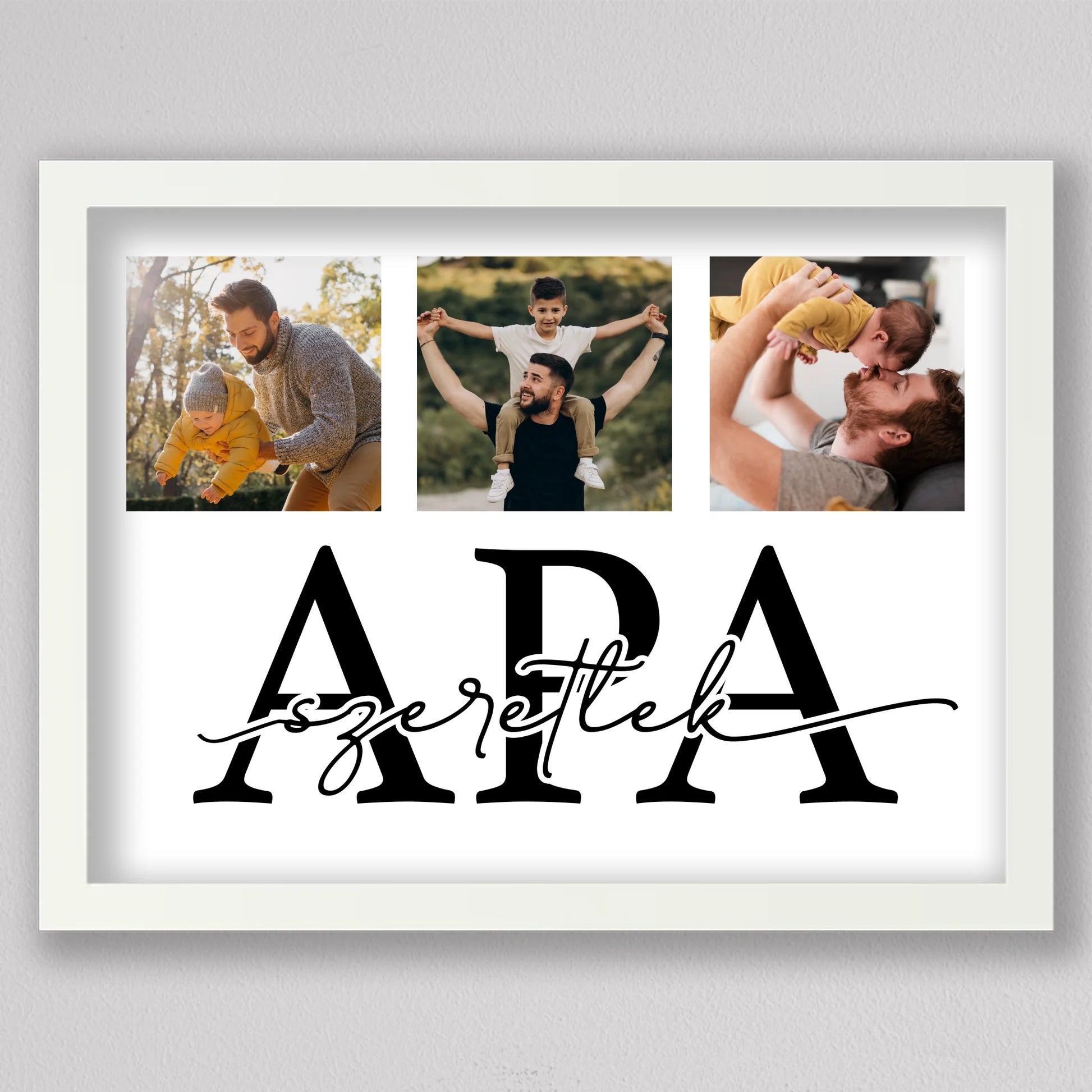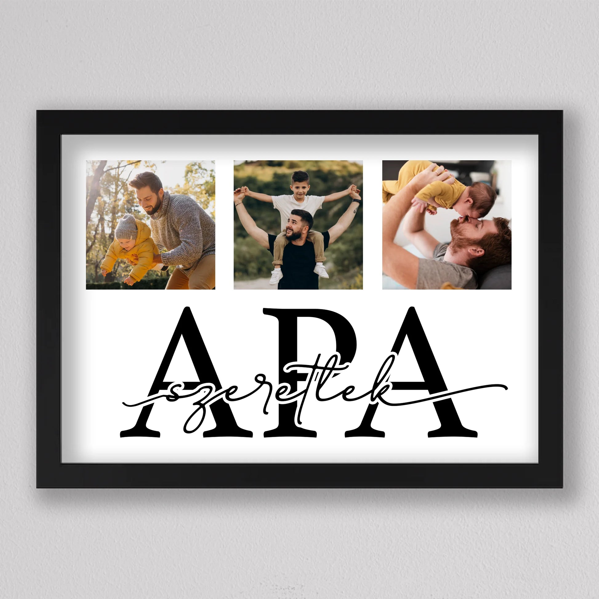 Ajándékozz valódi érzelmeket! A Szeretlek APA – közös pillanatok fotókollázs egy stílusos, letisztult designú fali dekoráció, amely három szívet melengető közös fotóval és a szeretetteljes “APA – szeretünk” felirattal teszi igazán különlegessé az otthon bármely pontját. Ez a személyre szabható fotókollázs tökéletes ajándék apák napjára, születésnapra vagy csak úgy, hogy kifejezd: fontos neked. A minimalista fekete-fehér színvilág elegáns megjelenést biztosít, míg a képek és szöveg egyedi kombinációja mély érzelmi hatást vált ki. Kiváló minőségű nyomtatás, igényes keretezés és időtálló ajándék azoknak az apáknak, akik megérdemlik, hogy különlegesnek érezzék magukat. Tedd emlékezetessé a közös pillanatokat, és lepd meg vele a szívedhez közel álló édesapát!