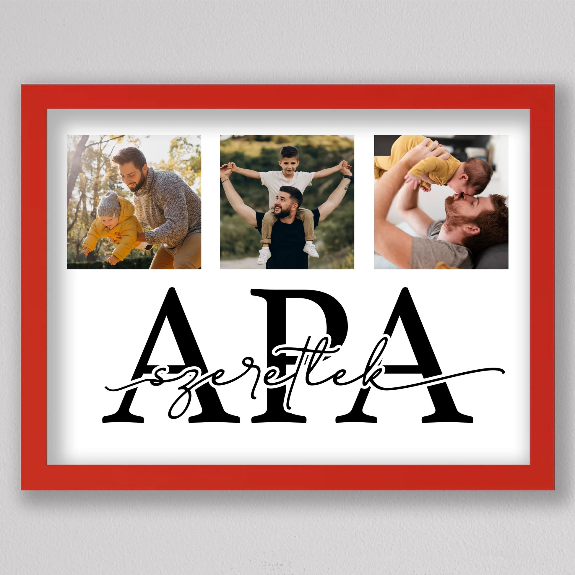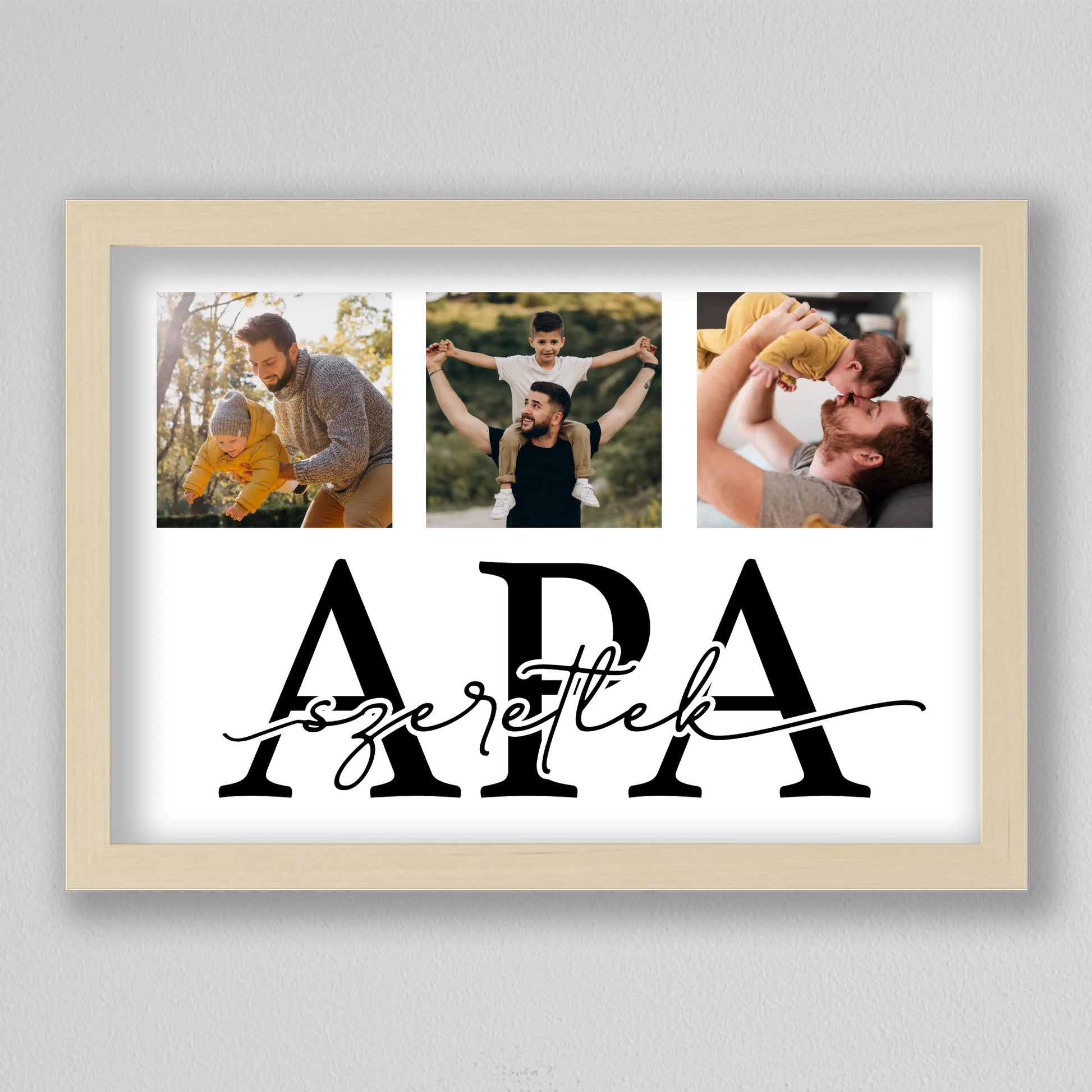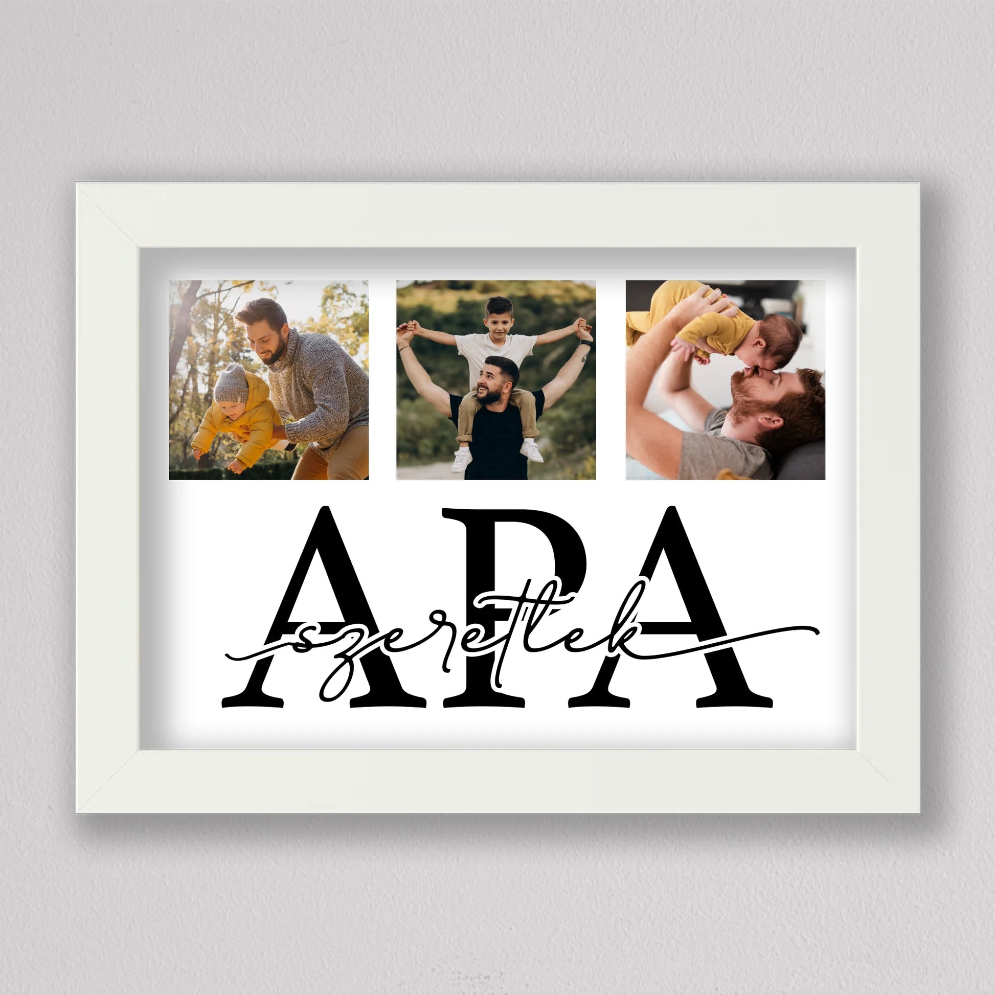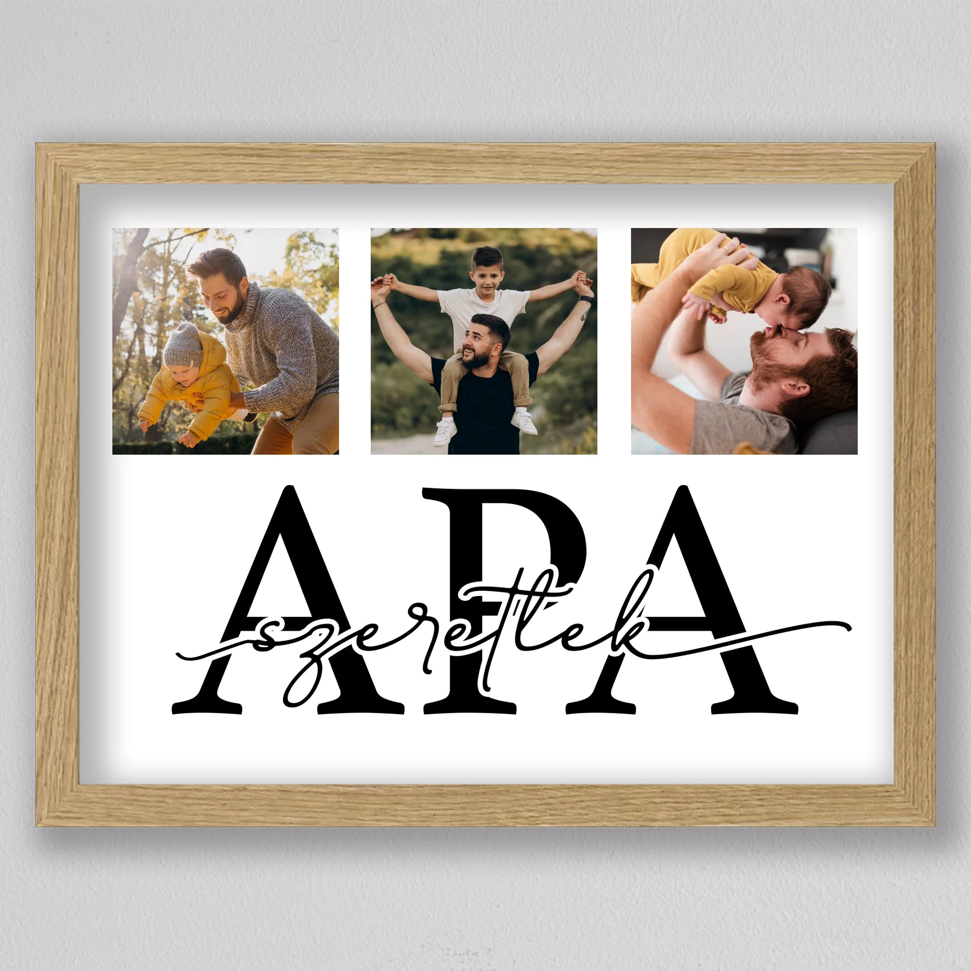 Ajándékozz valódi érzelmeket! A Szeretlek APA – közös pillanatok fotókollázs egy stílusos, letisztult designú fali dekoráció, amely három szívet melengető közös fotóval és a szeretetteljes “APA – szeretünk” felirattal teszi igazán különlegessé az otthon bármely pontját. Ez a személyre szabható fotókollázs tökéletes ajándék apák napjára, születésnapra vagy csak úgy, hogy kifejezd: fontos neked. A minimalista fekete-fehér színvilág elegáns megjelenést biztosít, míg a képek és szöveg egyedi kombinációja mély érzelmi hatást vált ki. Kiváló minőségű nyomtatás, igényes keretezés és időtálló ajándék azoknak az apáknak, akik megérdemlik, hogy különlegesnek érezzék magukat. Tedd emlékezetessé a közös pillanatokat, és lepd meg vele a szívedhez közel álló édesapát!