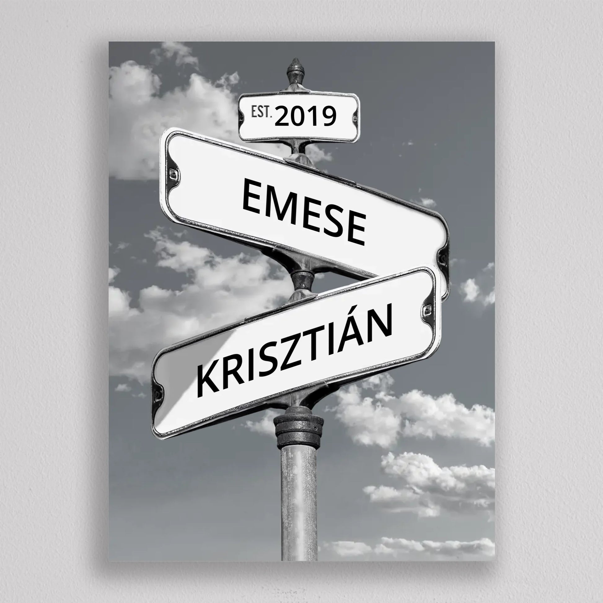 Az Utcanévtábla stílusú fotó kollázs egy egyedi és kreatív ajándék, amely ideális választás pároknak, esküvőkre, évfordulókra vagy új otthonba költözés alkalmával. Ez a különleges fotókollázs két névtáblát ábrázol, amelyek keresztezik egymást, szimbolizálva a két név egyesülését és a közös út kezdetét. Az évszám pedig a kapcsolat vagy a házasság kezdő évére utal, személyesítve ezzel a dísztárgyat. A háttérben színes házak és tiszta égbolt található, ami tovább fokozza a termék esztétikai értékét. Ez a fotó kollázs nemcsak szép, teljesen személyre szabható, egyedi díszítőelem, hanem egy örök emlék is, amely bármely otthon meghatározó része lehet.
