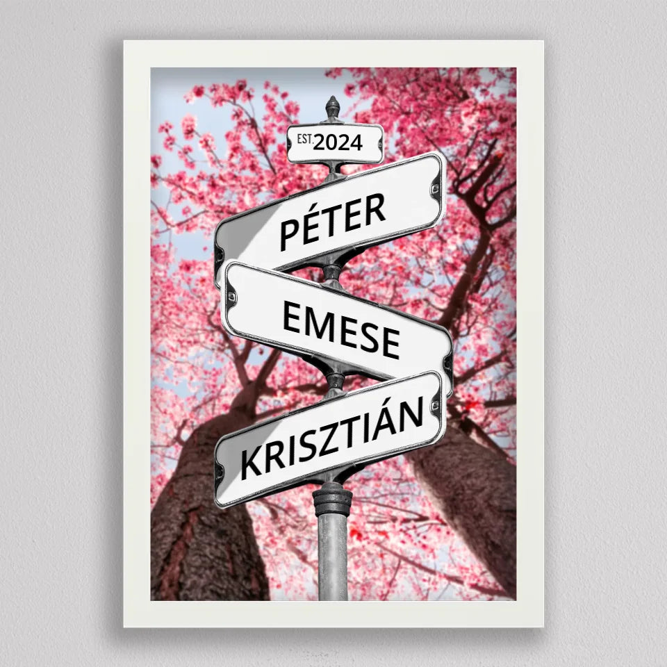 Utcanévtábla stílusú fotó kollázs családoknak 3-5 névvel - többféle háttérrel