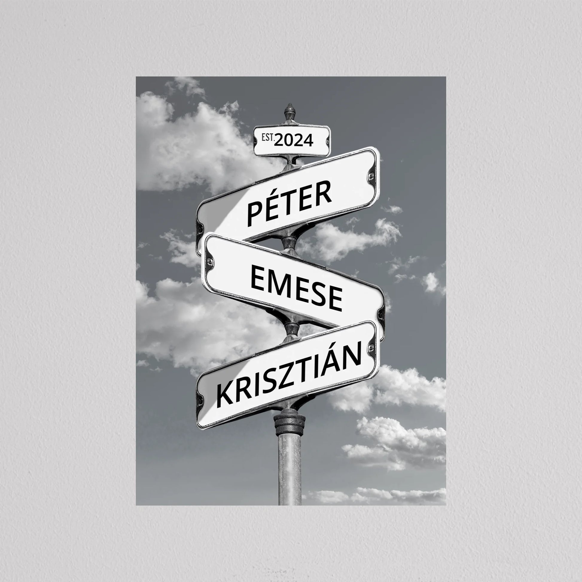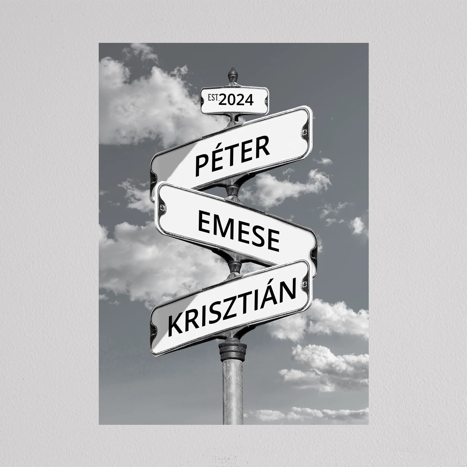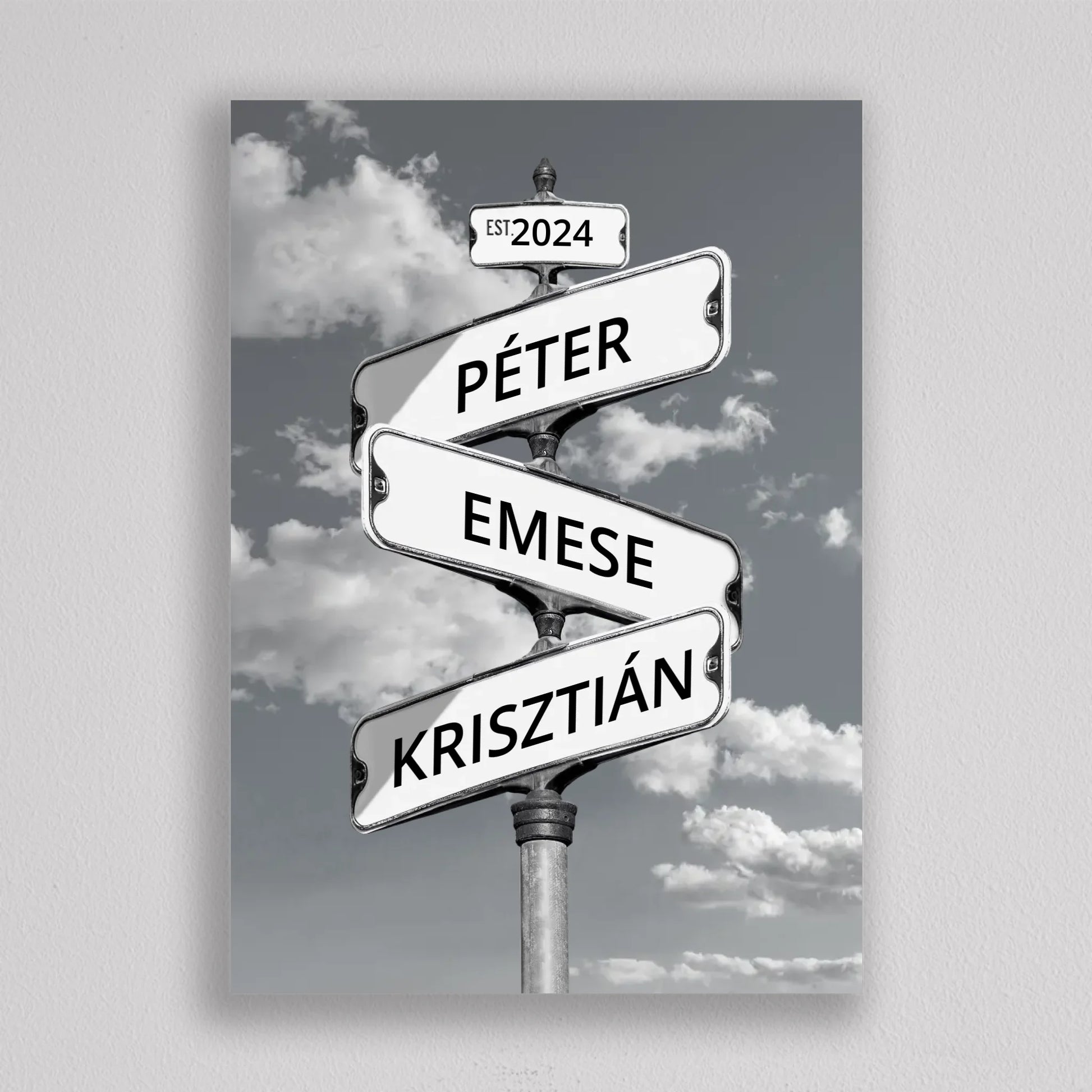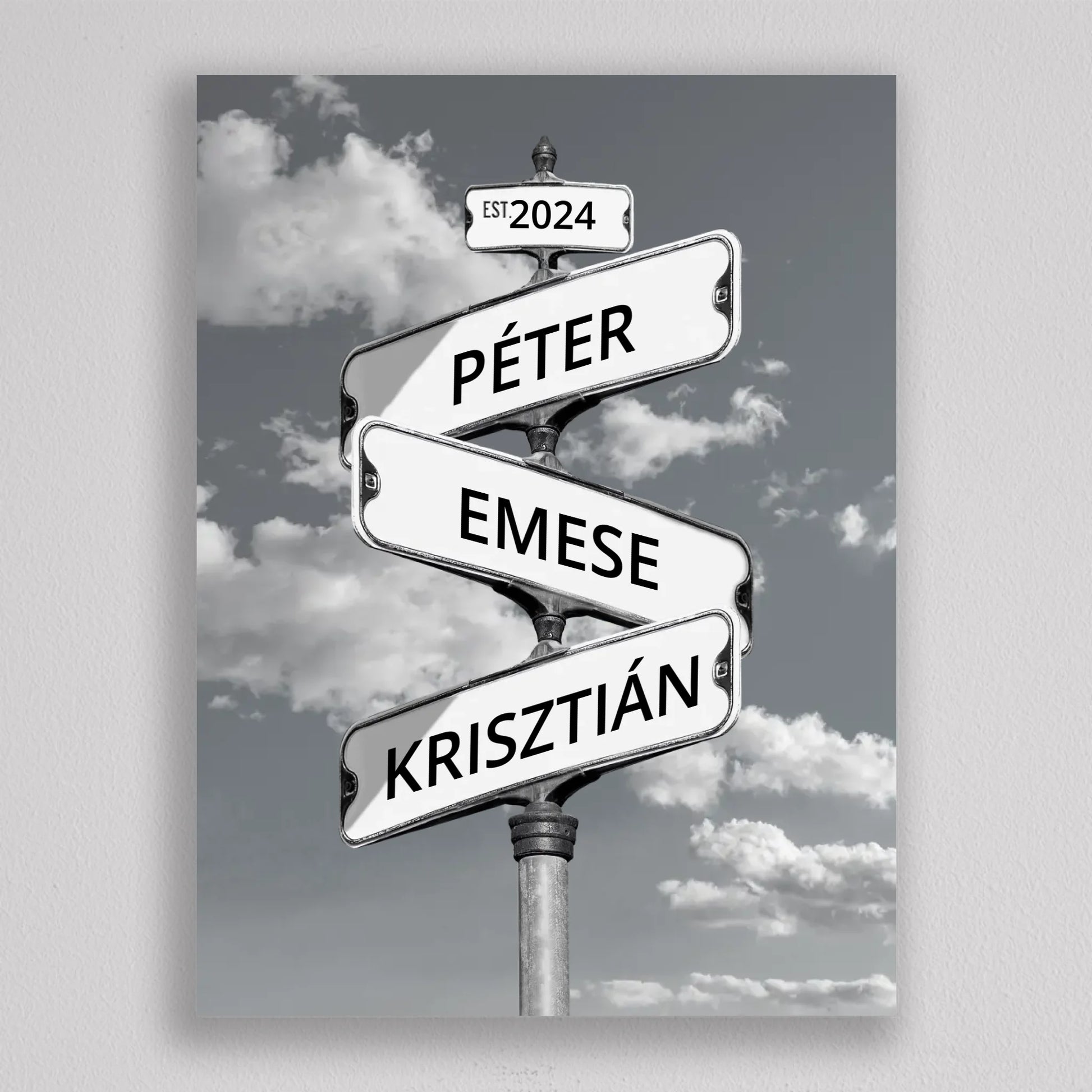 Az Utcanévtábla stílusú fotó kollázs családoknak egyedi és különleges dekoráció, amely tökéletesen kifejezi a családi összetartozás érzését. Az utcatábla motívum segítségével 3-5 családtag neve jelenik meg egy stílusos illusztráción, többféle választható háttérrel, így minden család a saját ízléséhez igazíthatja. Különleges ajándék bármilyen alkalomra, legyen szó házassági évfordulóról, születésnapról, vagy éppen egy új otthon ünnepléséről. Ez a modern és kreatív falikép nemcsak személyre szabható, hanem stílusos kiegészítője is lehet a lakásnak. Az illusztráció egyedivé teszi a család minden tagját.