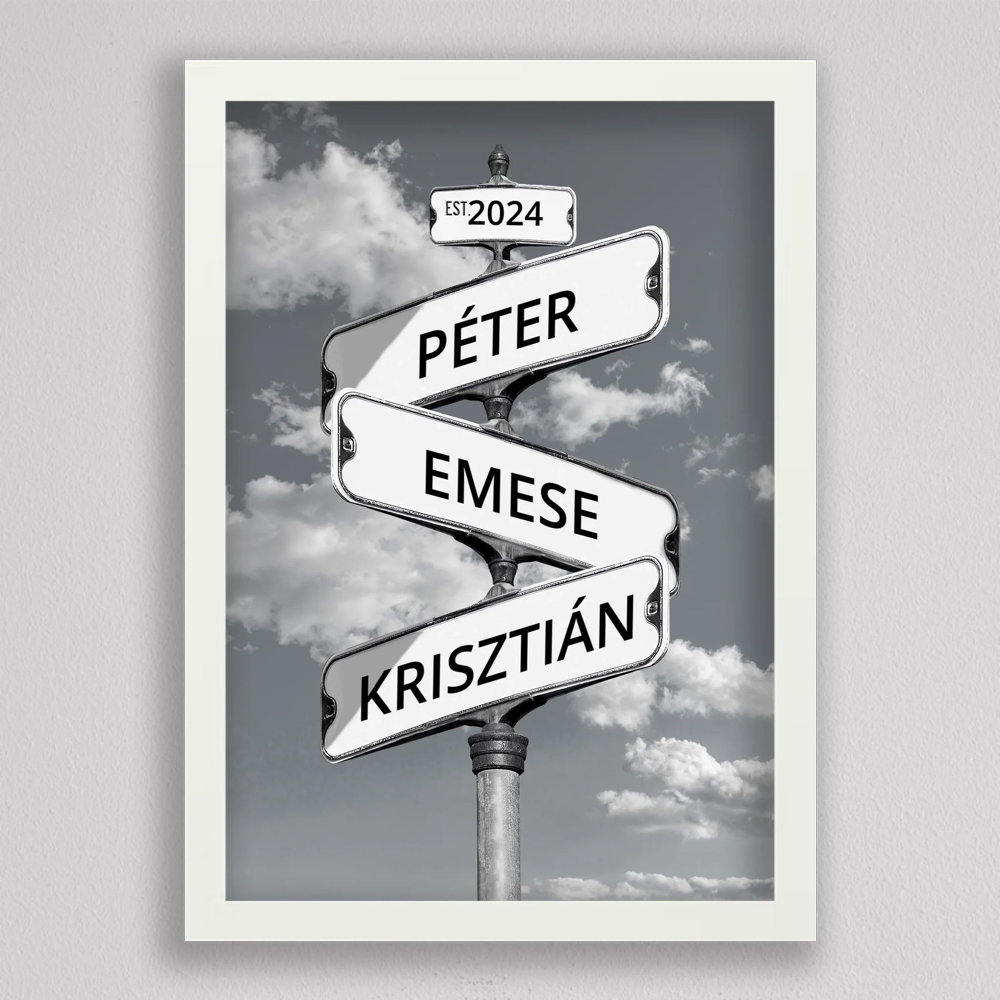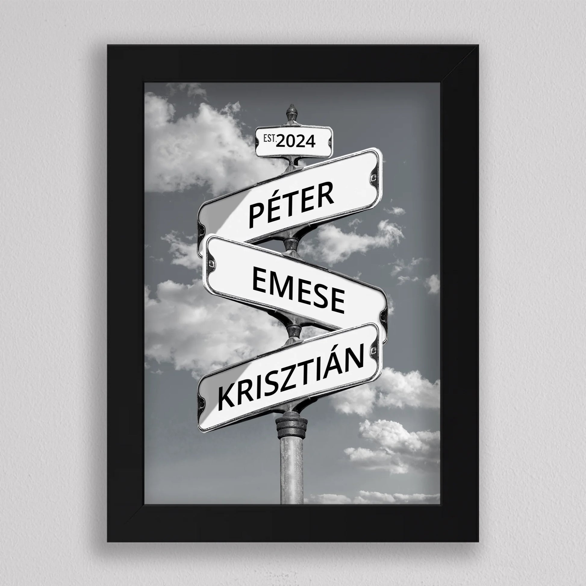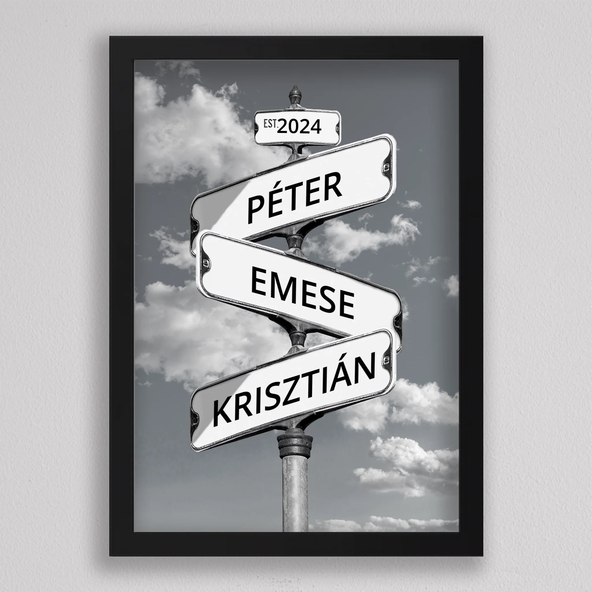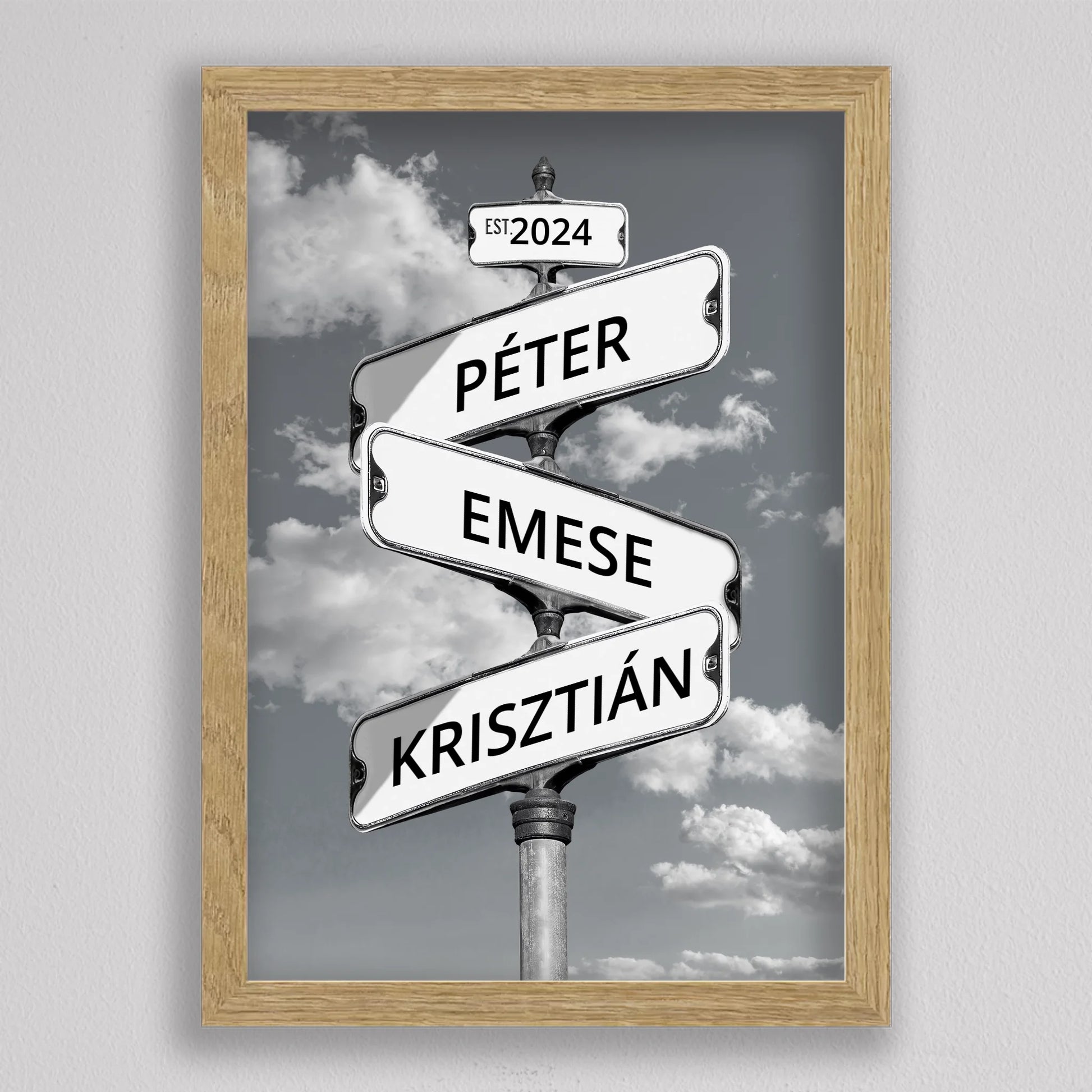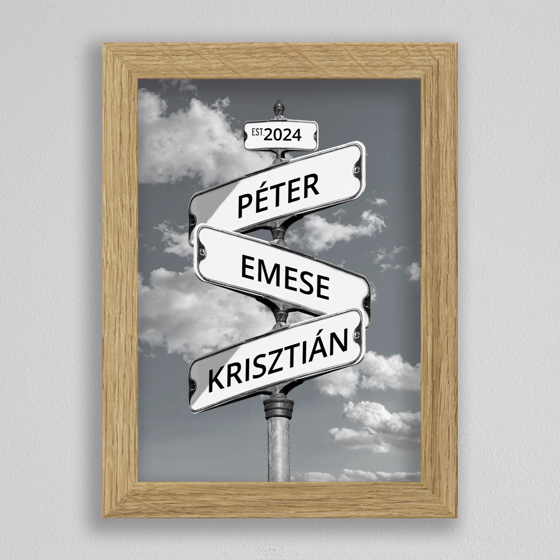 Az Utcanévtábla stílusú fotó kollázs családoknak egyedi és különleges dekoráció, amely tökéletesen kifejezi a családi összetartozás érzését. Az utcatábla motívum segítségével 3-5 családtag neve jelenik meg egy stílusos illusztráción, többféle választható háttérrel, így minden család a saját ízléséhez igazíthatja. Különleges ajándék bármilyen alkalomra, legyen szó házassági évfordulóról, születésnapról, vagy éppen egy új otthon ünnepléséről. Ez a modern és kreatív falikép nemcsak személyre szabható, hanem stílusos kiegészítője is lehet a lakásnak. Az illusztráció egyedivé teszi a család minden tagját.