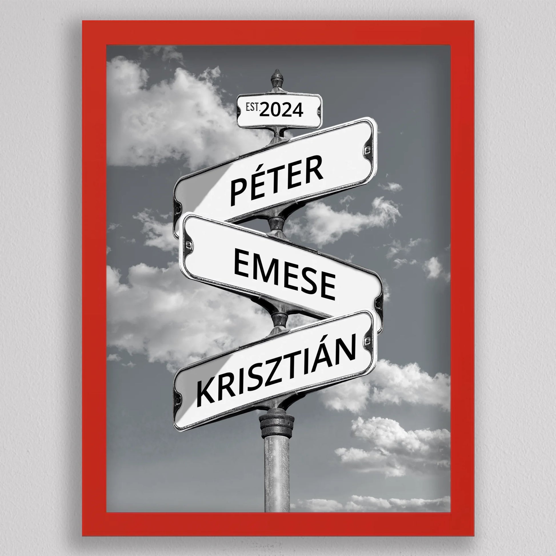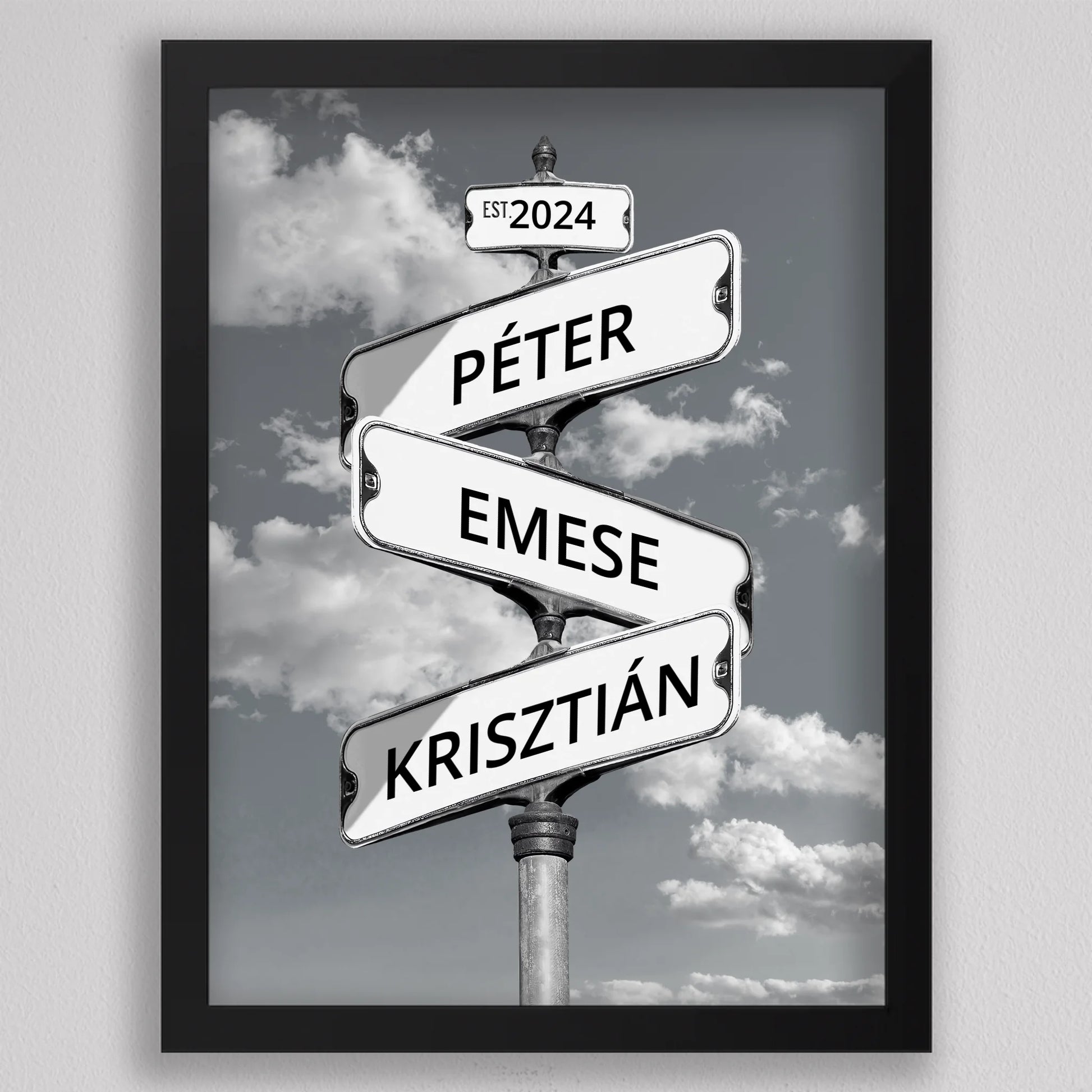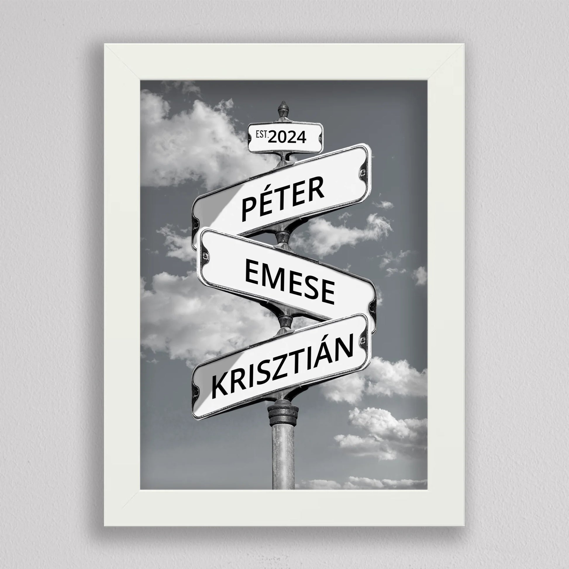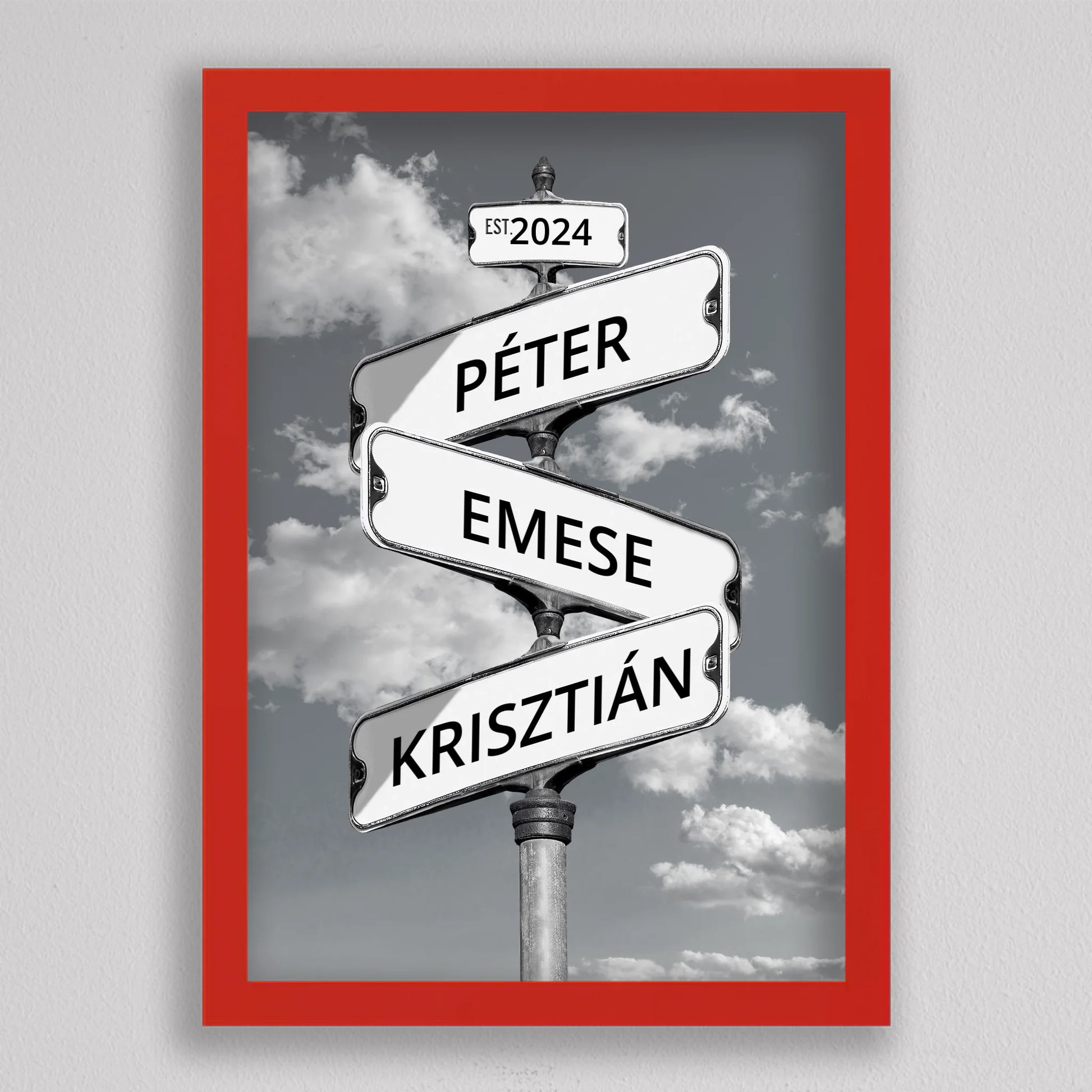 Az Utcanévtábla stílusú fotó kollázs családoknak egyedi és különleges dekoráció, amely tökéletesen kifejezi a családi összetartozás érzését. Az utcatábla motívum segítségével 3-5 családtag neve jelenik meg egy stílusos illusztráción, többféle választható háttérrel, így minden család a saját ízléséhez igazíthatja. Különleges ajándék bármilyen alkalomra, legyen szó házassági évfordulóról, születésnapról, vagy éppen egy új otthon ünnepléséről. Ez a modern és kreatív falikép nemcsak személyre szabható, hanem stílusos kiegészítője is lehet a lakásnak. Az illusztráció egyedivé teszi a család minden tagját.