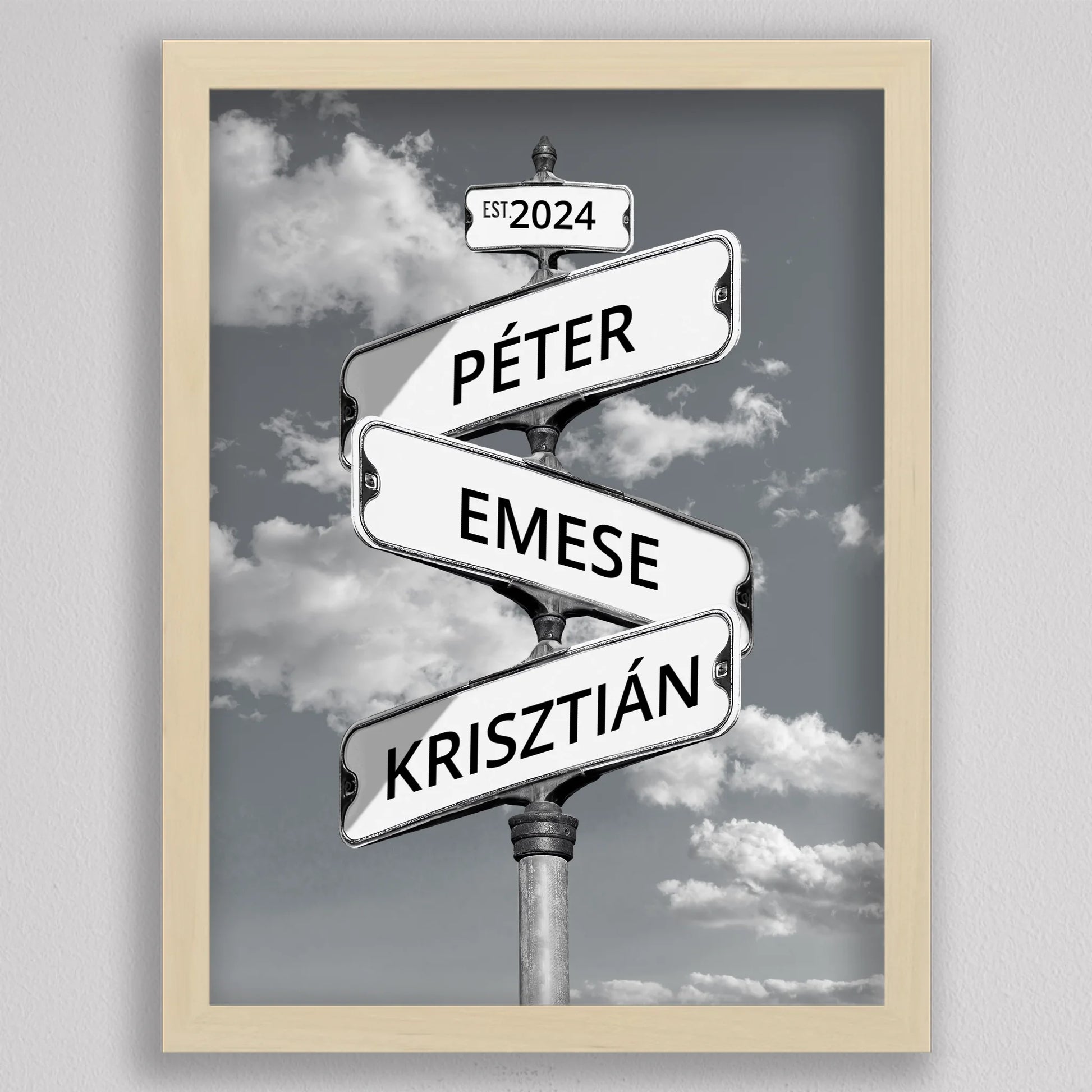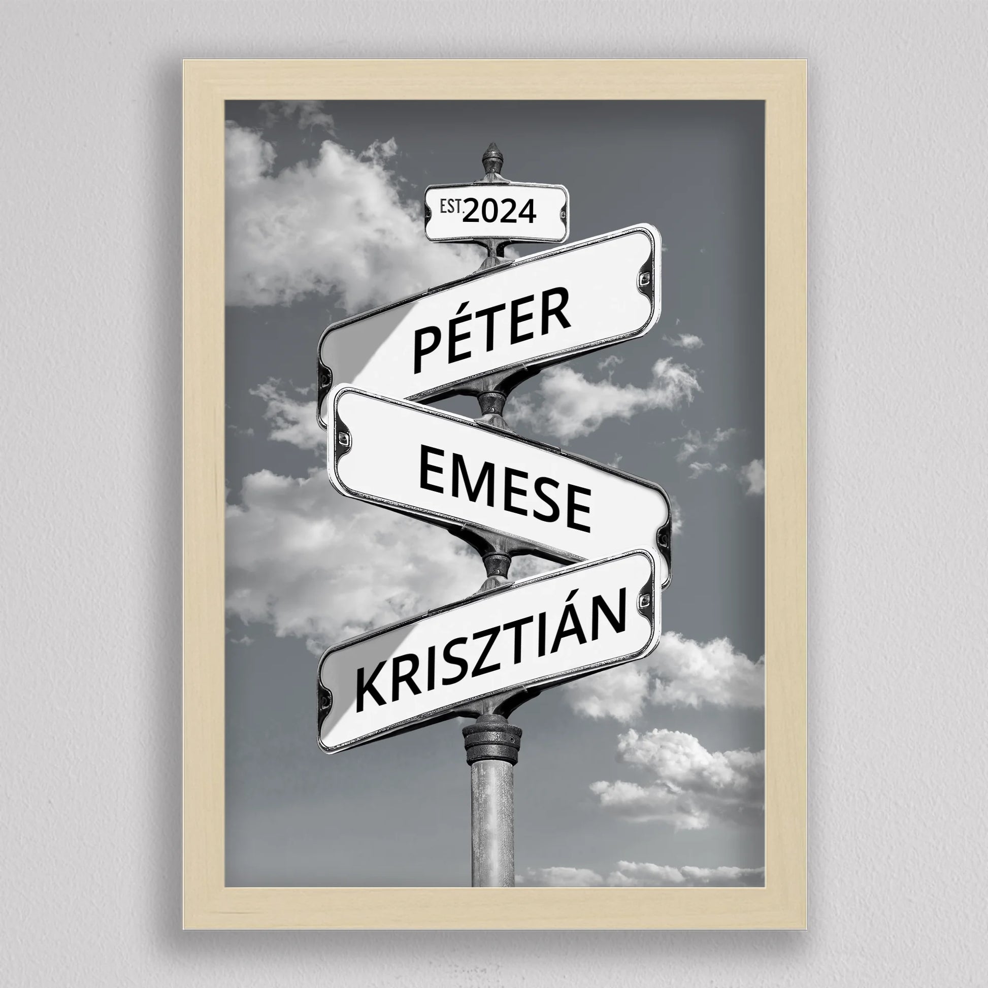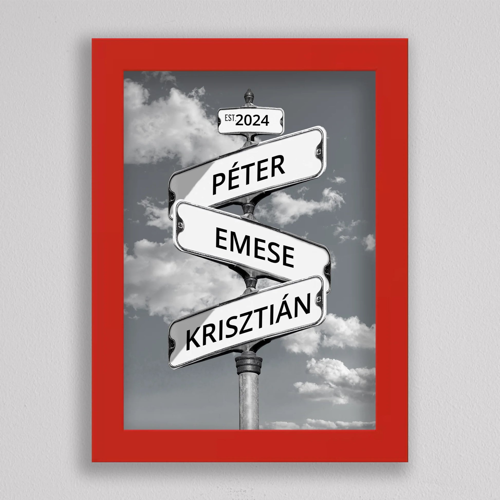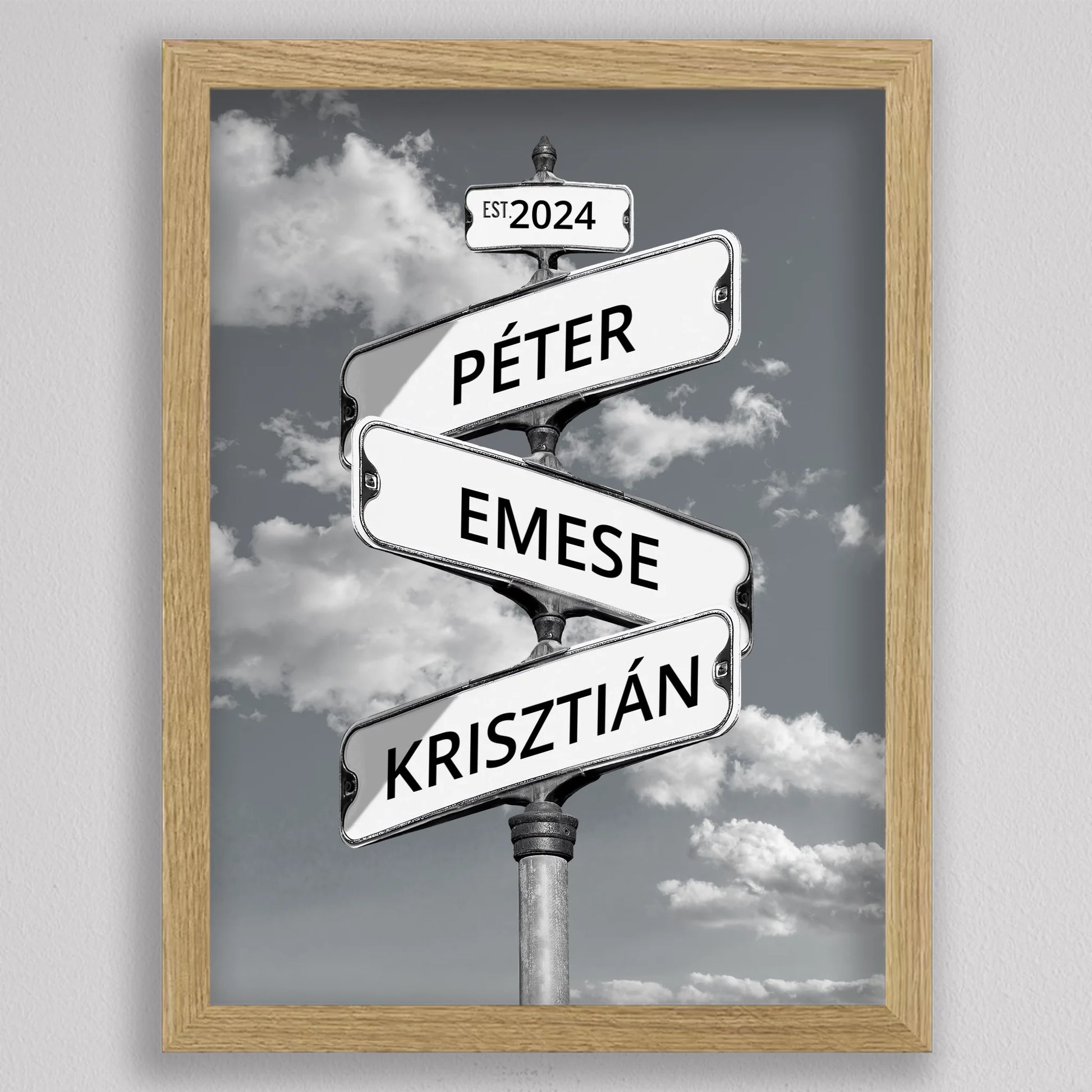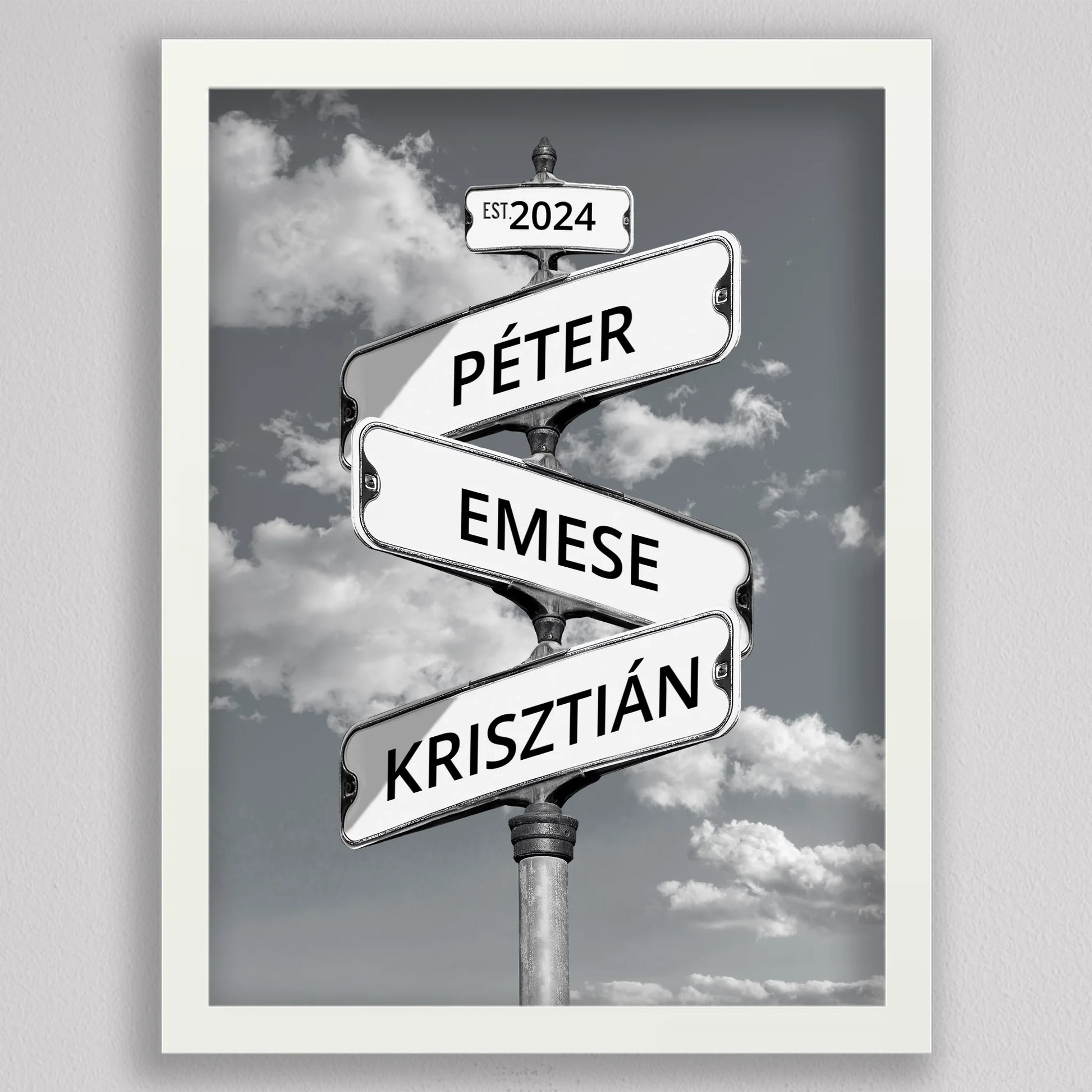 Az Utcanévtábla stílusú fotó kollázs családoknak egyedi és különleges dekoráció, amely tökéletesen kifejezi a családi összetartozás érzését. Az utcatábla motívum segítségével 3-5 családtag neve jelenik meg egy stílusos illusztráción, többféle választható háttérrel, így minden család a saját ízléséhez igazíthatja. Különleges ajándék bármilyen alkalomra, legyen szó házassági évfordulóról, születésnapról, vagy éppen egy új otthon ünnepléséről. Ez a modern és kreatív falikép nemcsak személyre szabható, hanem stílusos kiegészítője is lehet a lakásnak. Az illusztráció egyedivé teszi a család minden tagját.