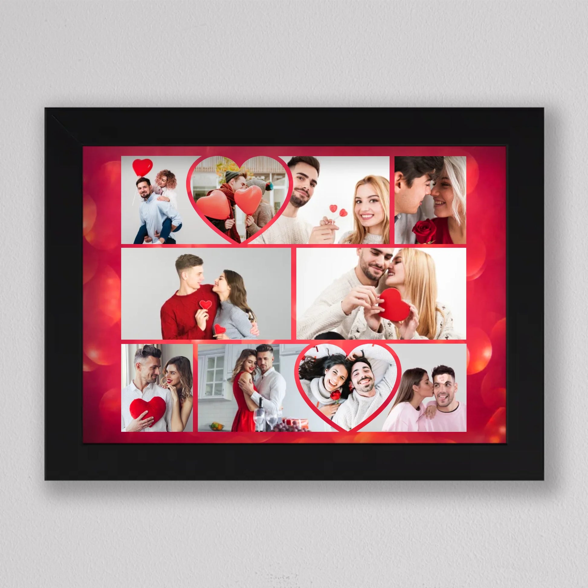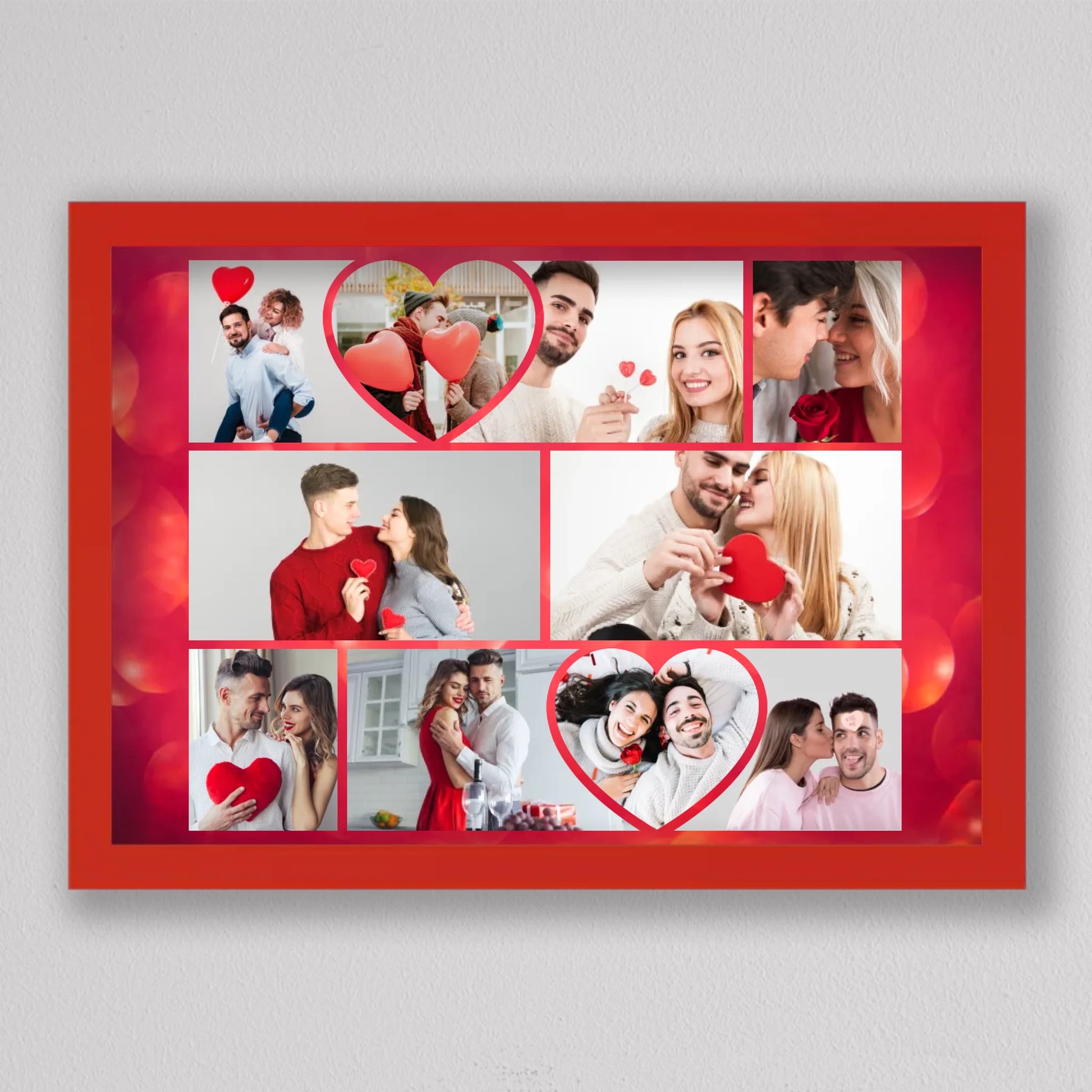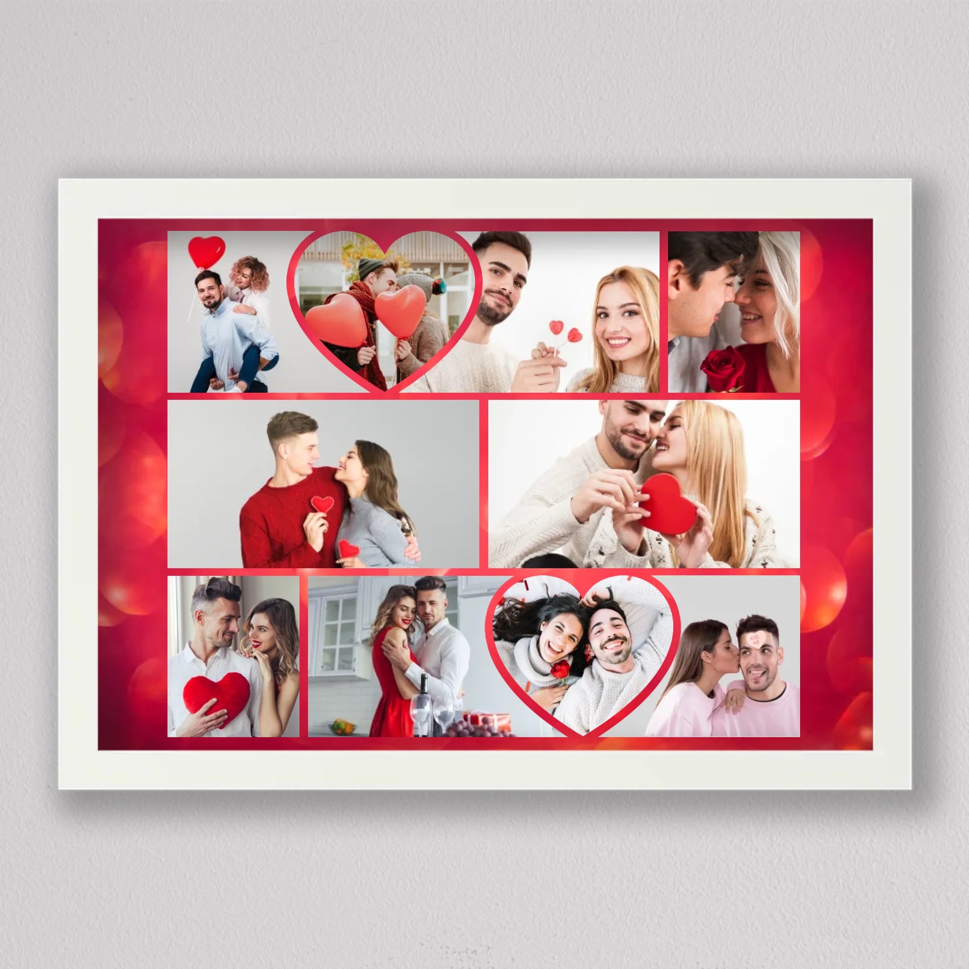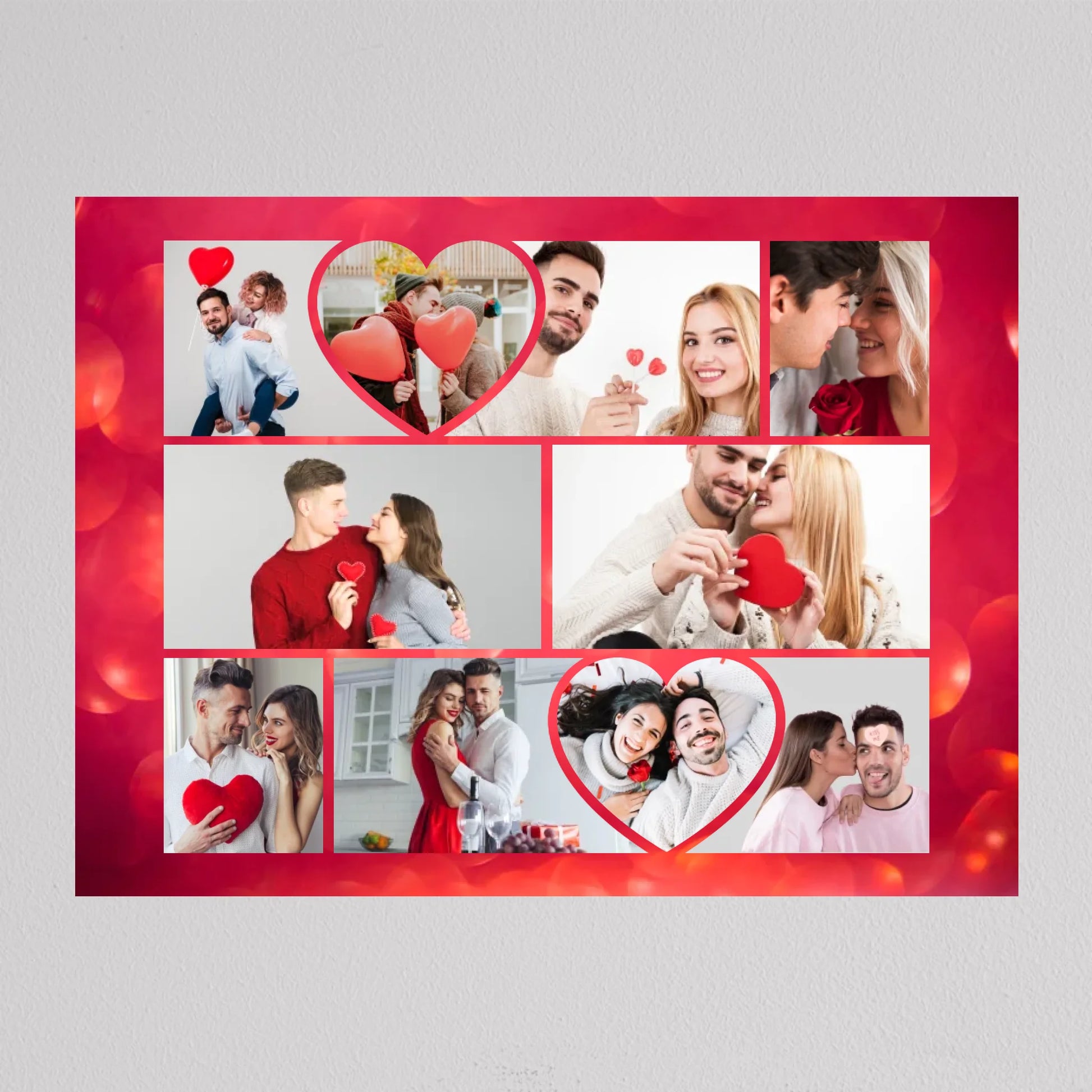A “Valentin napi szerelmes fotókollázs” tökéletes ajándék, amellyel emlékezetessé teheted a legszebb közös pillanataitokat. Ez a személyre szabható fotókollázs romantikus elrendezésben jeleníti meg a legkedvesebb képeiteket, és kiváló választás Valentin-napra, évfordulókra vagy bármilyen különleges alkalomra. A kollázs egyedileg alakítható, akár piros szivecskés vagy fehér háttérrel, így könnyedén illeszkedik bármilyen otthoni dekorációhoz. Egyedi megjelenése nemcsak dekoratív, de személyes érzelmekkel teli ajándék is, amely örökre megőrzi a szerelmetek emlékeit.