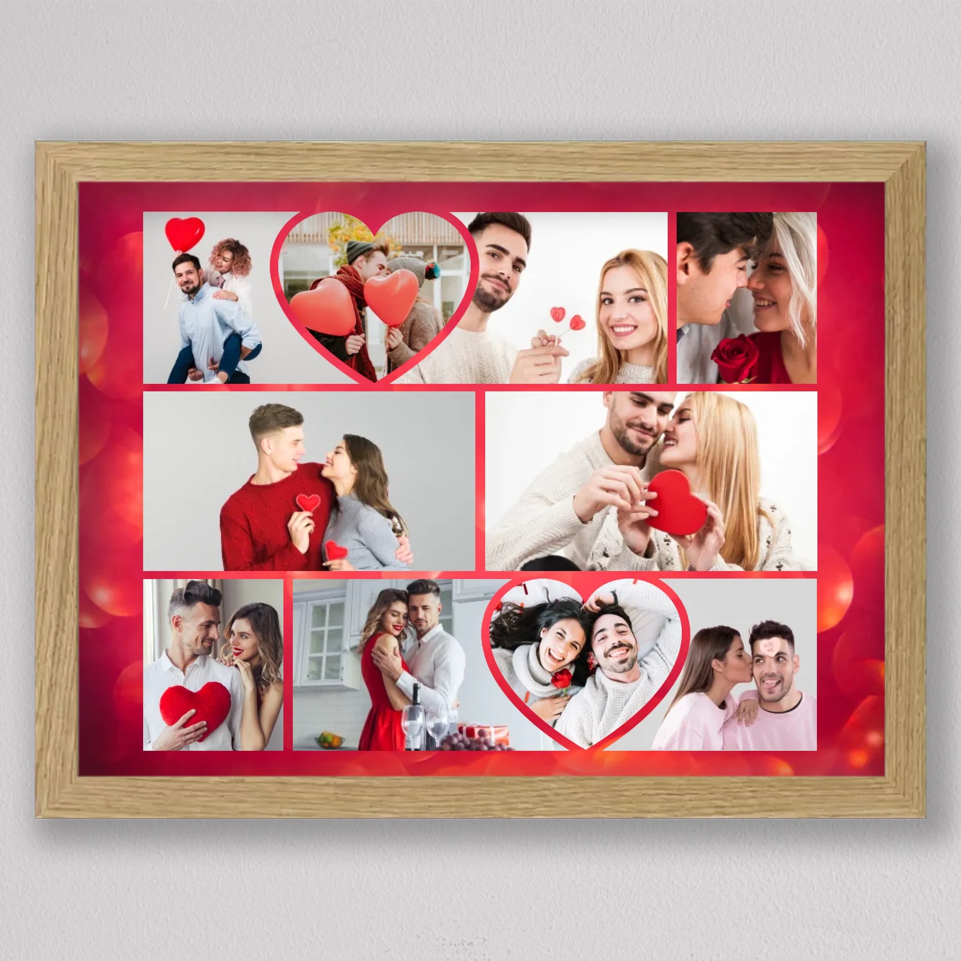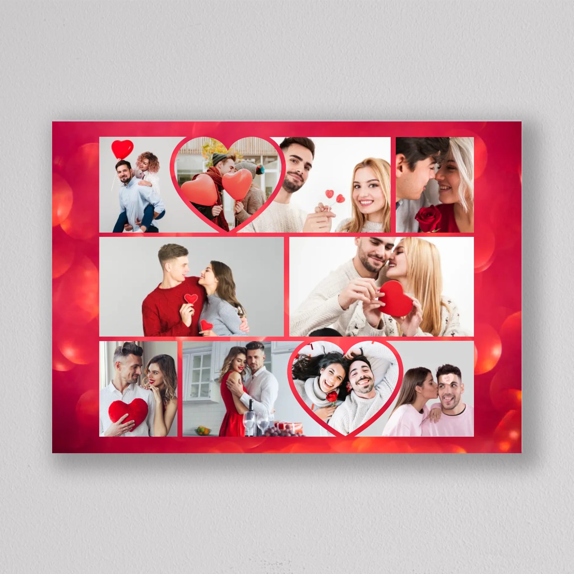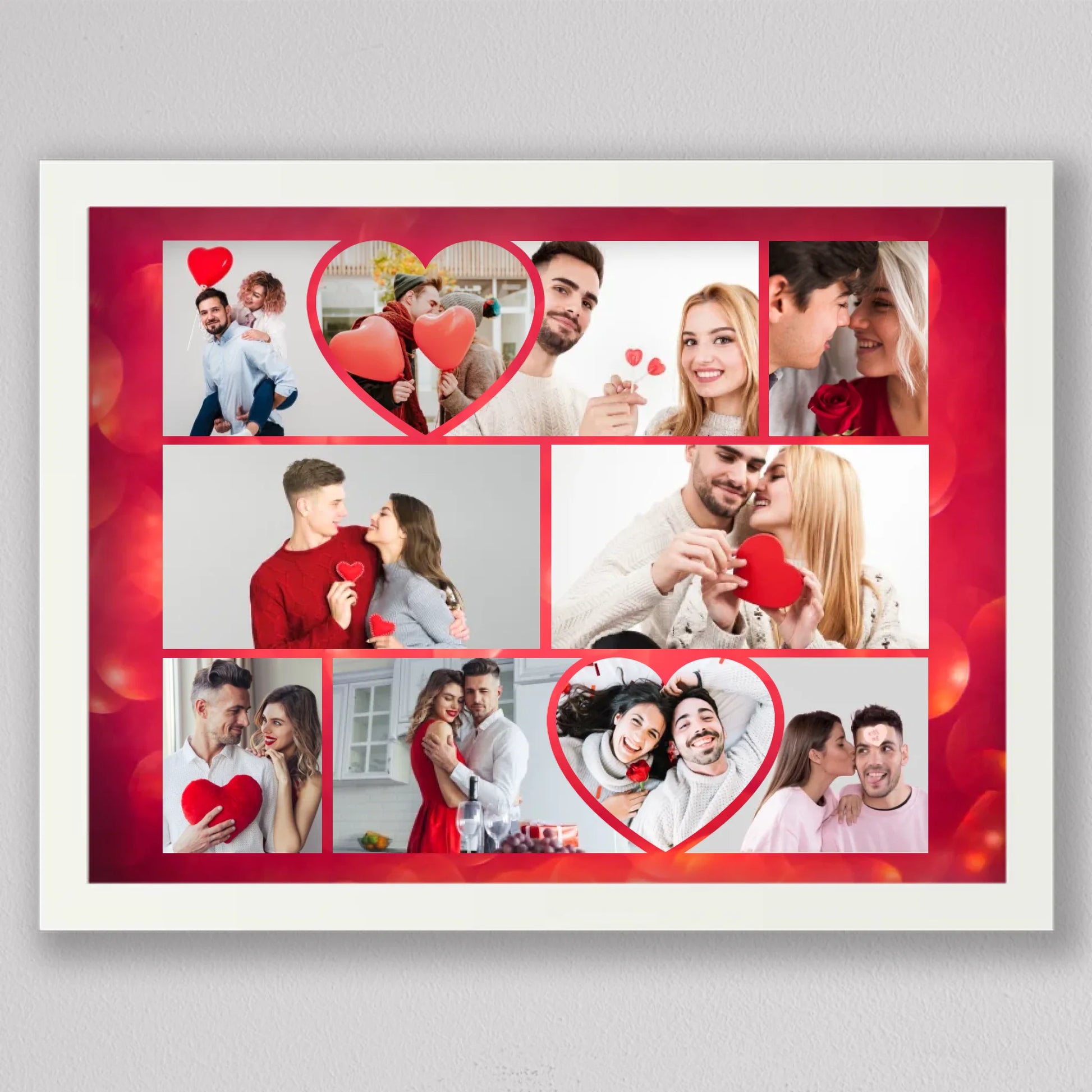 A “Valentin napi szerelmes fotókollázs” tökéletes ajándék, amellyel emlékezetessé teheted a legszebb közös pillanataitokat. Ez a személyre szabható fotókollázs romantikus elrendezésben jeleníti meg a legkedvesebb képeiteket, és kiváló választás Valentin-napra, évfordulókra vagy bármilyen különleges alkalomra. A kollázs egyedileg alakítható, akár piros szivecskés vagy fehér háttérrel, így könnyedén illeszkedik bármilyen otthoni dekorációhoz. Egyedi megjelenése nemcsak dekoratív, de személyes érzelmekkel teli ajándék is, amely örökre megőrzi a szerelmetek emlékeit.