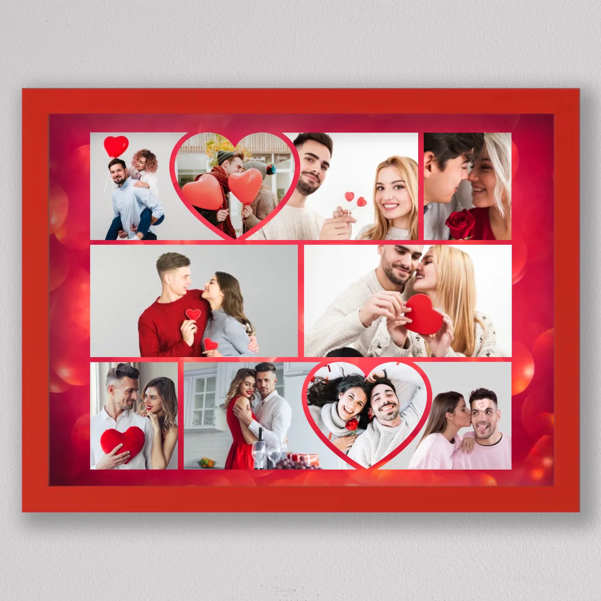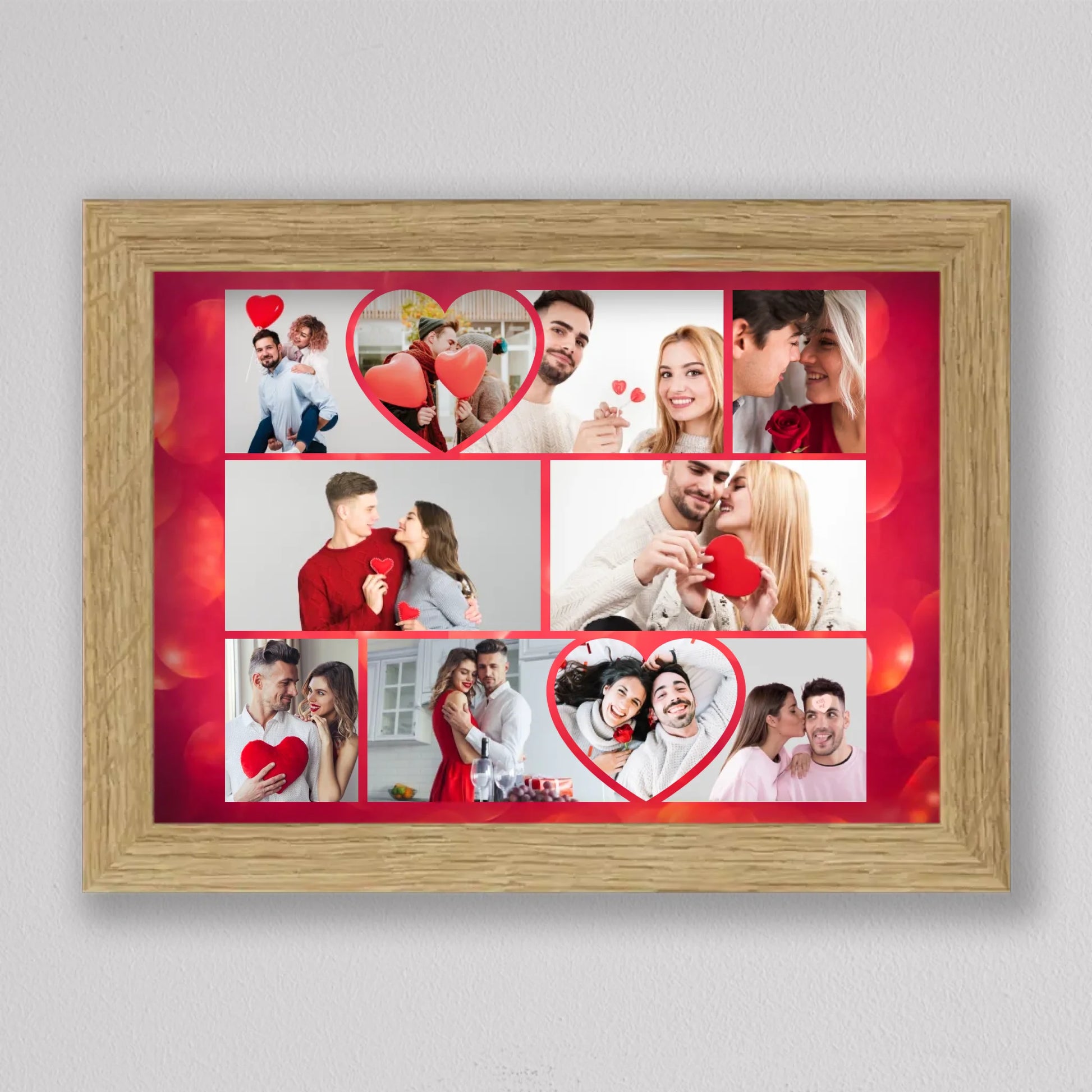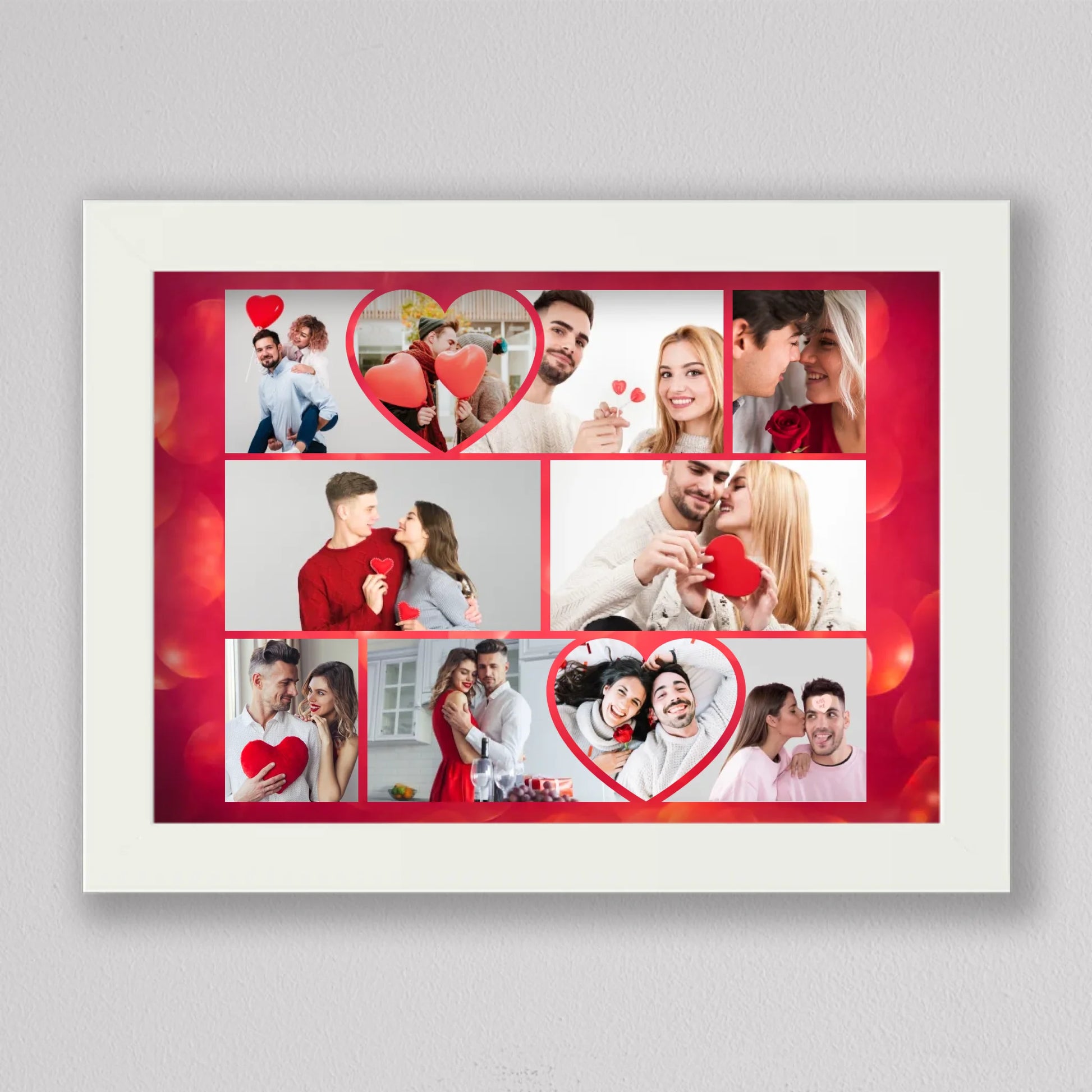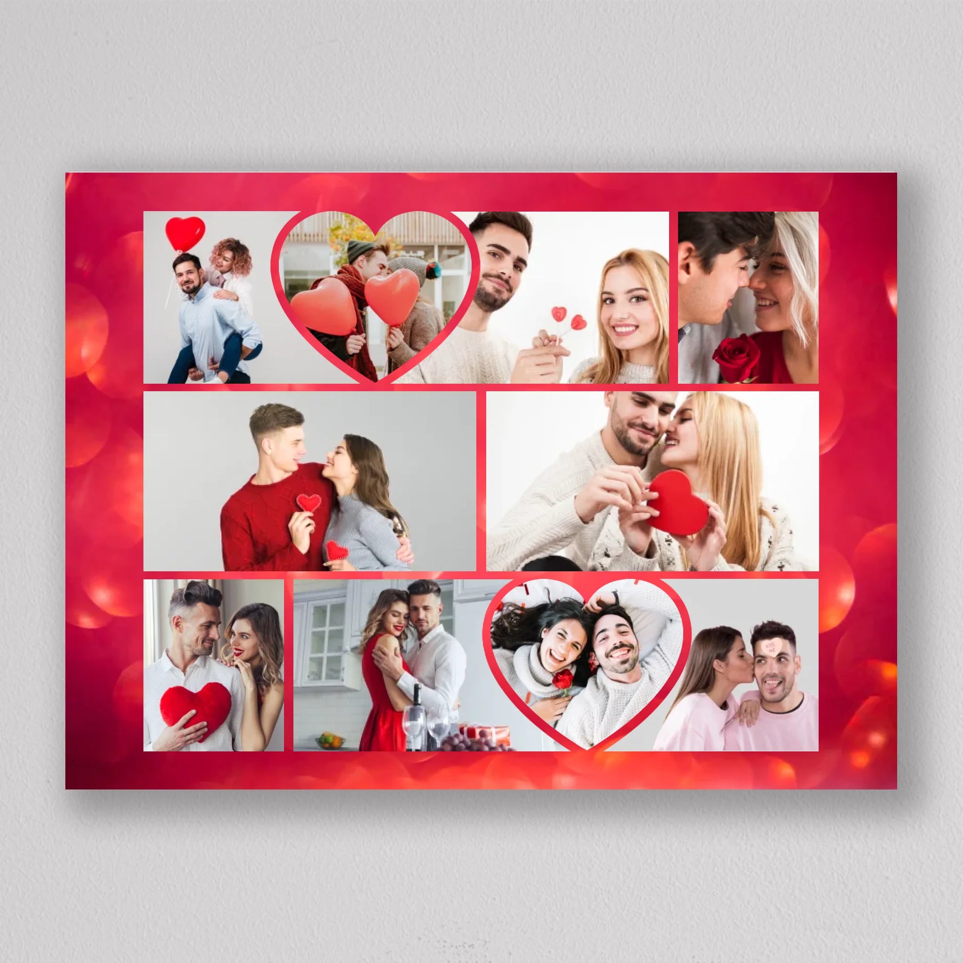 A “Valentin napi szerelmes fotókollázs” tökéletes ajándék, amellyel emlékezetessé teheted a legszebb közös pillanataitokat. Ez a személyre szabható fotókollázs romantikus elrendezésben jeleníti meg a legkedvesebb képeiteket, és kiváló választás Valentin-napra, évfordulókra vagy bármilyen különleges alkalomra. A kollázs egyedileg alakítható, akár piros szivecskés vagy fehér háttérrel, így könnyedén illeszkedik bármilyen otthoni dekorációhoz. Egyedi megjelenése nemcsak dekoratív, de személyes érzelmekkel teli ajándék is, amely örökre megőrzi a szerelmetek emlékeit.